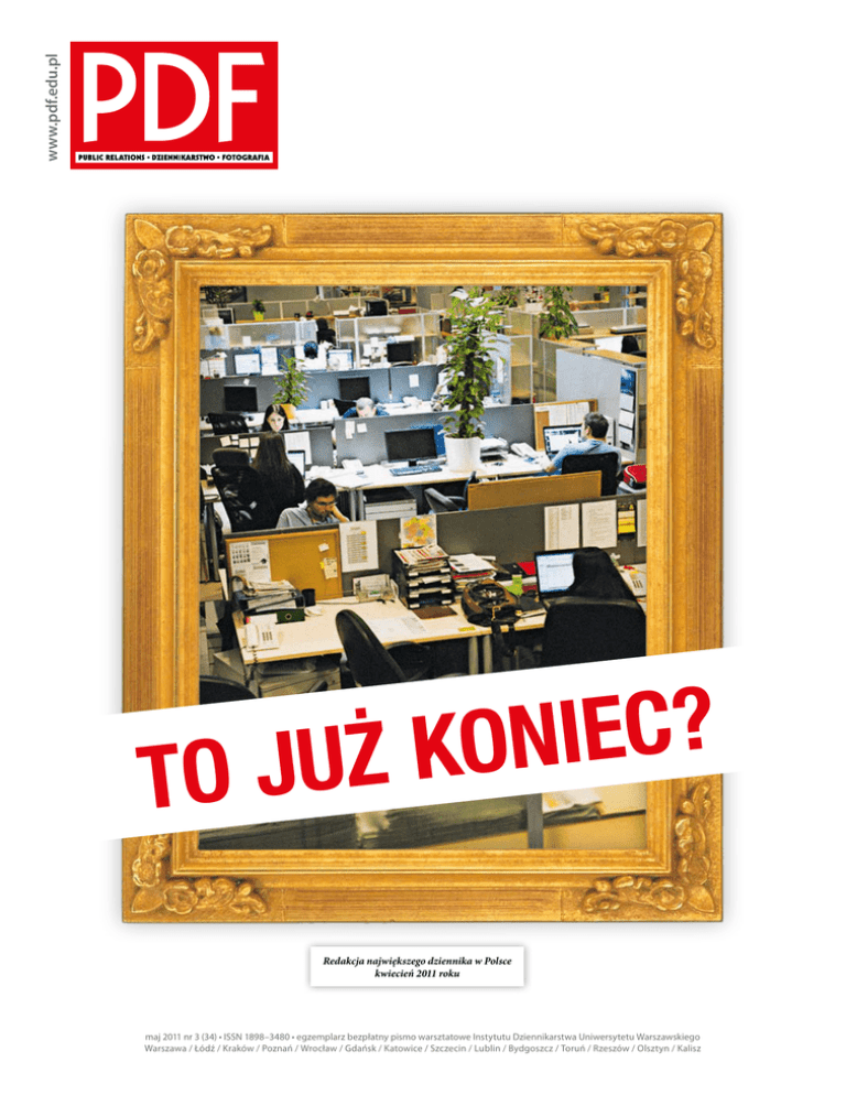 www.pdf.edu.pl ? c e i n o k ż u j To Redakcja największego dziennika w Polsce kwiecień 2011 roku maj 2011 nr 3 (34) • ISSN 1898–3480 • egzemplarz bezpłatny pismo warsztatowe Instytutu Dziennikarstwa Uniwersytetu Warszawskiego Warszawa / Łódź / Kraków / Poznań / Wrocław / Gdańsk / Katowice / Szczecin / Lublin / Bydgoszcz / Toruń / Rzeszów / Olsztyn / Kalisz PDF miesięcznik studencki – maj 2011 www.pdf.edu.pl PDF miesięcznik studencki – maj 2011 www.facebook.com/redakcjaPDF Naczelna strona Spodziewany koniec 3 Korespondent pilnie poszukiwany 4-5 Perły z lamusa - prasa 5 O losach świata decyduje facebook 6 Rozmowa wokół reporterów 8 Na prawo patrz – tygodniki po nowemu Zbigniew Żbikowski 9 Dopalacze na wojnie 10 Casting przepustką do sukcesu 11 Fotografowanie na ulicy 12-13 Fotoreportaż 14 Czeczenia / Irak – dwie wojny, różny obraz 15 Kolumna Zygmunta 16 To PRoste – skradziono logo 17 Case study – siła ojcostwa 18 Na świecie – dobre wzorce Jeśli pewne tendencje w mediach się nasilą i nabiorą przyspieszenia, może się niebawem okazać, że prasa zacznie obchodzić się bez dziennikarzy. Sceptyk powie: wizja wyssana z palca. Przecież dopóki istnieją gazety, istnieć będą musieli ci, którzy zapełniają je tekstami. No właśnie – a kto powiedział, że gazety będą istnieć zawsze? Już dziś mówi się coraz głośniej o kryzysie prasy drukowanej. Przekaz informacyjny coraz bardziej wartkim i głębokim strumieniem płynie przez łącza internetowe, rezygnując z pa- America Online, portal gigant zza oceanu, wszedł na nową drogę, a do sieci wyciekł dokument, który ją wyznacza: więcej zawartości, więcej odsłon, więcej reklam. AOL dołącza tym samym do grona farm produkcji zawartości, dziennikarskiego ekwiwalentu chińskiej szwalni dresów. Czy taka farma to także nasza przyszłość? „Wycieknięty” do internetu dokument wytycza cele firmy na najbliższe miesiące. AOL nie jest taką potęgą jak dawniej, więc potrzebny jest plan. A Tim Armstrong, szef korporac ji, go ma . St ąd „The AOL Way”. Zlecając tematy, redaktorzy AOL mają brać pod uwagę przede wszystkim cztery czynniki: stopę zwrotu włożonych pieniędzy, potencjalną „klikalność”, szybkość produkcji zawartości i zgodność ze standardami redakcyjnymi. Zaraz... jednak są jakieś standardy. Możemy przeczytać jakie, bo ten mail też wyciekł, MIESIĘCZNIK STUDENCKI REDAKCJA redaktor naczelny: Zbigniew Żbikowski z-ca redaktora naczelnego Paweł H. Olek redaktorzy: Tomasz Betka (szef dziennikarstwa), Krystian Szczęsny (szef foto), Szczepan Orłowski i Kajetan Poznański (szefowie kultury) 02 może niedużym nakładem otworzyć własną stację bądź czasopismo internetowe. Inaczej mówiąc: każdy dziś może być dziennikarzem, bo ma możliwość tworzenia informacji w dowolnej formie i puszczania ich w obieg społeczny z pominięciem gazet czy anten. I nie ma większego znaczenia to, że taki domorosły dziennikarz czasami nie wie, jak się konstruuje tekst informacyjny. W przekazie tym liczy się bowiem treść, nie forma. I szybkość. I tu pojawia się niepokojące pytanie – to po co my w ogóle kształcimy dziennikarzy, uczymy ich gatunków dziennikarskich, warsztatu i poprawności językowej, skoro w internetowym postmodernistycznym świecie wykształcają się nowe, hybrydowe formy i każdy może pisać, jak mu się podoba, nie zważając na reguły? Po co uczyć się klasycznego dziennikarstwa, skoro – gdyby dać wiarę najbardziej radykalnym futurologom – zawód ten i tak wkrótce zaniknie? Odpowiedź zasadza się na nadziei, że fachowość Którędy droga na farmę? 19-23 Książe i żebrak – subiektywny przegląd kultury reklama pieru jako nośnika. Konsekwencje tego są poważne, bo wcale nie jest tak, że tylko nośnik się zmienia, a reszta pozostaje po staremu. Zmienia się bowiem przy tym cała – można rzec – filozofia dziennikarstwa. Dziś, jak tego uczą w redakcjach i na studiach, dziennikarz to ten, który pośredniczy w przekazywaniu informacji: zdobywa je (albo otrzymuje), przetwarza i upublicznia. Taki szczególny zawód. Otwarty, ale limitowany. Przynajmniej do niedawna. Liczebność dziennikarzy ograniczała liczba mediów, w których mogli publikować swoje materiały. Liczba stacji telewizyjnych i radiowych jest regulowana przez państwo , a choć wydawanie czasopisma od strony formalnej jest stosunkowo proste, to już od strony finansowej takie łatwe nie jest, co też stanowi poważną przeszkodę w mnożeniu tytułów i powiększania powierzchni do zapełnienia. Od pewnego czasu jednakże te bariery pękają. Dosłownie każdy, kto ma chęć, determinację i komputer, tylko wcześniej. „Nowi” są instruowani, by m. in. nie wyszukiwać nowych tematów, tylko podbierać je mediom tradycyjnym i aby pisać pod wyszukiwarki – tak, aby Google wypluwał tekst jak najwyżej w wynikach. Nie wiadomo, czy po wdrożeniu planu dziennikarze AOL będą mieli czas, żeby mrugnąć, bo szef spodziewa się od każdego z nich od 5 do 10 artykułów dziennie. Na szczęście nie będą musieli zbyt długo myśleć nad tematami – to załatwią za nich spece od wyszukiwarek. Ludzie w yszukują wampir y i Lady zespół redakcyjny: Dorota Bigo , Piotr Czaplicki, Roksana Gowin, Jan Grabek, Magdalena Grzymkowska, Bartek Iwański, Dominika Jędrzejczyk, Patryk Juchniewicz, Anna Maria Juźwin, Mirek Kaźmierczak, Monika Kiepiel, Anna Kiedrzynek, Łukasz Lachecki, Agnieszka Lampka, Klaudia Lis, Marcin Luniewski, Paulina Mućko, Ewa Piskorska, Agnieszka Plister, Radek Pulkowski, Alicja Skorupko, Adrian Stachowski, Agnieszka Stachyra, Krystian Szczęsny, Wioletta Wysocka, Marcel Zatoński grafika, okładka i skład DTP: Karol Grzywaczewski / www.grafikadtp.com Zdjęcie: 29 kwietnia 2011 roku, redakcja "Gazety Stołecznej", dodatku do "Gazety Wyborczej". fot. Mirek Kaźmierczak korekta: Anna Kiedrzynek, Aneta Grabs