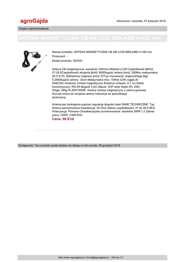 agroGajda Utworzono: czwartek, 07 kwiecień 2016 Części samochodowe ANTENA MAGNETYCZNA CB AM LC29 MIDLAND h=330 mm Nazwa produktu: ANTENA MAGNETYCZNA CB AM LC29 MIDLAND h=330 mm Producent: Model produktu: 033343 Antena CB (magnetyczna, wysokość 330mm) Midland LC29 Częstotliwość [MHz]: 27-28,5Częstotliwość strojenia [kHz]: 600Długość anteny [mm]: 330Moc maksymalna [W P.E.P]: 30Średnica magnesu [mm]: 67Typ mocowania: magnesWaga [kg]: 0,295Długość anteny: 33cm Maksymalna moc: 10Wat (CW) ciągła,30 Wat(CW) chwilowa Uchwyt magnetyczny Średnica uchwytu: 6,7 cm Kabel koncentryczny: RG-58 długość 4,5m Złącze: UHF-wtyk męski (PL 259) Waga: 295g W ZESTAWIE: Antena Uchwyt magnetyczny z osłona gumową Kluczyk imbus do strojenia anteny Instrukcja ze specyfikacja techniczną Antena jest dostrajalna poprzez regulację długości bata DANE TECHNICZNE: Typ: Antena samochodowa Impedancja: 50 Ohm Zakres częstotliwości: 27 do 28.5 MHz Polaryzacja: Pionowa Charakterystyka promieniowania: dookólna SWR:1.2 Zakres pracy i SWR 2:600 KHz Cena: 60.81zł Dostępność: Ten produkt został dodany do sklepu w dniu środa, 09 grudzień 2015 http://www.agrogajda.pl | [email protected] | | Strona 1/1