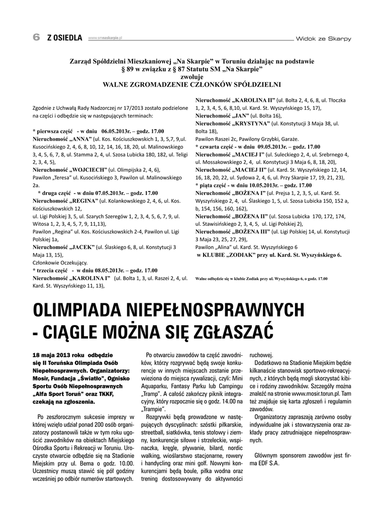 6 z osiedla www.smnaskarpie.pl Widok ze Skarpy Zarząd Spółdzielni Mieszkaniowej „Na Skarpie” w Toruniu działając na podstawie § 89 w związku z § 87 Statutu SM „Na Skarpie” zwołuje WALNE ZGROMADZENIE CZŁONKÓW SPÓŁDZIELNI Zgodnie z Uchwałą Rady Nadzorczej nr 17/2013 zostało podzielone na części i odbędzie się w następujących terminach: * pierwsza część - w dniu 06.05.2013r. – godz. 17.00 Nieruchomość „ANNA” (ul. Kos. Kościuszkowskich 1, 3, 5,7, 9,ul. Kusocińskiego 2, 4, 6, 8, 10, 12, 14, 16, 18, 20, ul. Malinowskiego 3, 4, 5, 6, 7, 8, ul. Stamma 2, 4, ul. Szosa Lubicka 180, 182, ul. Teligi 2, 3, 4, 5), Nieruchomość „WOJCIECH” (ul. Olimpijska 2, 4, 6), Pawilon „Teresa” ul. Kusocińskiego 3, Pawilon ul. Malinowskiego 2a. * druga część - w dniu 07.05.2013r. – godz. 17.00 Nieruchomość „REGINA” (ul. Kolankowskiego 2, 4, 6, ul. Kos. Kościuszkowskich 12, ul. Ligi Polskiej 3, 5, ul. Szarych Szeregów 1, 2, 3, 4, 5, 6, 7, 9, ul. Witosa 1, 2, 3, 4, 5, 7, 9, 11,13), Pawilon „Regina” ul. Kos. Kościuszkowskich 2-4, Pawilon ul. Ligi Polskiej 1a, Nieruchomość „JACEK” (ul. Ślaskiego 6, 8, ul. Konstytucji 3 Maja 13, 15), Członkowie Oczekujący. * trzecia część - w dniu 08.05.2013r. – godz. 17.00 Nieruchomość „KAROLINA I” (ul. Bolta 1, 3, ul. Raszei 2, 4, ul. Kard. St. Wyszyńskiego 11, 13), Nieruchomość „KAROLINA II” (ul. Bolta 2, 4, 6, 8, ul. Tłoczka 1, 2, 3, 4, 5, 6, 8,10, ul. Kard. St. Wyszyńskiego 15, 17), Nieruchomość „JAN” (ul. Bolta 16), Nieruchomość „KRYSTYNA” (ul. Konstytucji 3 Maja 38, ul. Bolta 18), Pawilon Raszei 2c, Pawilony Grzybki, Garaże. * czwarta część - w dniu 09.05.2013r. – godz. 17.00 Nieruchomość „MACIEJ I” (ul. Suleckiego 2, 4, ul. Srebrnego 4, ul. Mossakowskiego 2, 4, ul. Konstytucji 3 Maja 6, 8, 18, 20), Nieruchomość „MACIEJ II” (ul. Kard. St. Wyszyńskiego 12, 14, 16, 18, 20, 22, ul. Sydowa 2, 4, 6, ul. Przy Skarpie 17, 19, 21, 23), * piąta część - w dniu 10.05.2013r. – godz. 17.00 Nieruchomość „BOŻENA I” (ul. Prejsa 1, 2, 3, 5, ul. Kard. St. Wyszyńskiego 2, 4, ul. Ślaskiego 1, 5, ul. Szosa Lubicka 150, 152 a, b, 154, 156, 160, 162), Nieruchomość „BOŻENA II” (ul. Szosa Lubicka 170, 172, 174, ul. Stawisińskiego 2, 3, 4, 5, ul. Ligi Polskiej 2), Nieruchomość „BOŻENA III” (ul. Ligi Polskiej 14, ul. Konstytucji 3 Maja 23, 25, 27, 29), Pawilon „Alina” ul. Kard. St. Wyszyńskiego 6 w KLUBIE „ZODIAK” przy ul. Kard. St. Wyszyńskiego 6. Walne odbędzie się w klubie Zodiak przy ul. Wyszyńskiego 6, o godz. 17.00 Olimpiada niepełnosprawnych - Ciągle można się zgłaszać 18 maja 2013 roku odbędzie się II Toruńska Olimpiada Osób Niepełnosprawnych. Organizatorzy: Mosir, Fundacja „Światło”, Ognisko Sportu Osób Niepełnosprawnych „Alfa Sport Toruń” oraz TKKF, czekają na zgłoszenia. Po zeszłorocznym sukcesie imprezy w której wzięło udział ponad 200 osób organizatorzy postanowili także w tym roku ugościć zawodników na obiektach Miejskiego Ośrodka Sportu i Rekreacji w Toruniu. Uroczyste otwarcie odbędzie się na Stadionie Miejskim przy ul. Bema o godz. 10.00. Uczestnicy muszą stawić się pół godziny wcześniej po odbiór numerów startowych. Po otwarciu zawodów ta część zawodników, którzy rozgrywać będą swoje konkurencje w innych miejscach zostanie przewieziona do miejsca rywalizacji, czyli: Mini Aquaparku, Fantasy Parku lub Campingu „Tramp”. A całość zakończy piknik integracyjny, który rozpocznie się o godz. 14.00 na „Trampie”. Rozgrywki będą prowadzone w następujących dyscyplinach: szóstki piłkarskie, streetball, siatkówka, tenis stołowy i ziemny, konkurencje siłowe i strzeleckie, wspinaczka, kręgle, pływanie, bilard, nordic walking, wioślarstwo stacjonarne, rowery i handycling oraz mini golf. Nowymi konkurencjami będą boule, piłka wodna oraz trening dostosowywany do aktywności ruchowej. Dodatkowo na Stadionie Miejskim będzie kilkanaście stanowisk sportowo-rekreacyjnych, z których będą mogli skorzystać kibice i rodziny zawodników. Szczegóły można znaleźć na stronie www.mosir.torun.pl. Tam też znajduje się karta zgłoszeń i regulamin zawodów. Organizatorzy zapraszają zarówno osoby indywidualne jak i stowarzyszenia oraz zakłady pracy zatrudniające niepełnosprawnych. Głównym sponsorem zawodów jest firma EDF S.A.