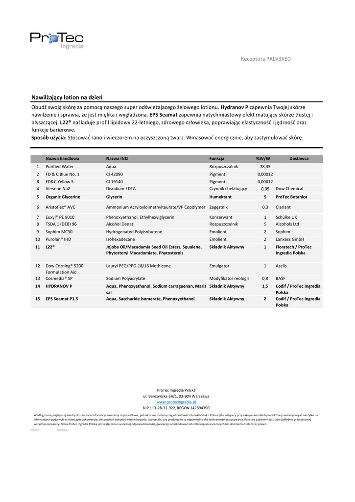 Receptura PALV3XED Nawilżający lotion na dzień Obudź swoją skórę za pomocą naszego super odświeżajacego żelowego lotionu. Hydranov P zapewnia Twojej skórze nawilżenie i sprawia, że jest miękka i wygładzona. EPS Seamat zapewnia natychmiastowy efekt matujący skórze tłustej i błyszczącej. L22® naśladuje profil lipidowy 22-letniego, zdrowego człowieka, poprawiając elastyczność i jędrność oraz funkcje barierowe. Sposób użycia: Stosować rano i wieczorem na oczyszczoną twarz. Wmasować energicznie, aby zastymulować skórę. Nazwa handlowa Nazwa INCI Funkcja 1 Purified Water Aqua Rozpuszczalnik %W/W Dostawca 2 FD & C Blue No. 1 CI 42090 Pigment 0,00012 3 4 FD&C Yellow 5 Versene Na2 CI 19140 Disodium EDTA Pigment Czynnik chelatujący 0,00012 0,05 Dow Chemical 5 Organic Glycerine Glycerin Humektant 6 Aristoflex® AVC Ammonium Acryloyldimethyltaurate/VP Copolymer Zagęstnik 7 8 Euxyl® PE 9010 TSDA 1 (DEB) 96 Phenoxyethanol, Ethylhexylglycerin Alcohol Denat Konserwant Rozpuszczalnik 1 5 Schülke UK Alcohols Ltd 9 78,35 5 0,3 ProTec Botanica Clariant Sophim MC30 Hydrogenated Polyisobutene Emolient 2 Sophim 10 Purolan® IHD Isohexadecane Emolient 2 Lanxess GmbH 11 L22® Jojoba Oil/Macadamia Seed Oil Esters, Squalene, Phytosteryl Macadamiate, Phytosterols Składnik Aktywny 1 Floratech / ProTec Ingredia Polska 12 Lauryl PEG/PPG-18/18 Methicone Emulgator 1 Azelis 13 Dow Corning® 5200 Formulation Aid Cosmedia® SP Sodium Polyacrylate Modyfikator reologii 0,8 BASF 14 HYDRANOV P 1,5 15 EPS Seamat P1.5 Aqua, Phenoxyethanol, Sodium carrageenan, Maris Składnik Aktywny sal Aqua, Saccharide isomerate, Phenoxyethanol Składnik Aktywny Codif / ProTec Ingredia Polska Codif / ProTec Ingredia Polska 2 ProTec Ingredia Polska ul. Berezyńska 6A/1, 03-904 Warszawa www.protecingredia.pl NIP 113-28-31-922, REGON 142894390 Według naszej najlepszej wiedzy dostarczone informacje uważamy za prawidłowe, jednakże nie możemy zagwarantować ich dokładności. Potencjalni nabywcy przy zakupie wszelkich produktów powinni polegać nie tylko na informacjach podanych w niniejszym dokumencie, ale powinni wykonać własne badania, aby ustalić, czy produkty te są odpowiednie dla konkretnego zastosowania. Panstwa zadaniem jest, aby dokładnie przetestować wszystkie preparaty. Firma Protec Ingredia Polska jest wyłączona z wszelkiej odpowiedzialności, gwarancji, odszkodowań lub zobowiązań wyrażonych lub domniemanych przez prawo. Sposób wykonania Do głównej kolby dodać: Purified Water Rozpocząć mieszanie ze średnią prędkością FD & C Blue No. 1 Mieszać do rozpuszczenia FD&C Yellow 5 Mieszać do rozpuszczenia Disodium EDTA Mieszać do rozpuszczenia Glycerin Mieszać do zdyspergowania Aristoflex® AVC Dodawać powoli unikając zlepiania Zwiększyć szybkość mieszania Euxyl® PE 9010 Mieszać do zdyspergowania Alcohol denat Mieszać do uzyskania homogenicznej mieszaniny Mieszać aż mieszanina będzie homogeniczna i pozbawiona grudek. W mniejszej kolbie przygotować mieszaninę: Hydrogenated Polyisobutene Purolan® IHD Lauryl PEG/PPG-18/18 Methicone L22® Sodium Polyacrylate Mieszać do uzyskania jednorodnej mieszaniny Kiedy otrzymamy jednorodną mieszaninę pozbawioną grudek, dodać zawartość mniejszej kolby do kolby głównej. Homogenizować przez 5 minut. Po 5 minutach wyłączyć homogenizator i do głównej kolby dodać: Hydranov P Homogenizować EPS SEAMAT P1.5 Homogenizować Użyć w razie potrzeby homogenizatora, aby otrzymać gładką mieszaninę pozbawioną grudek. Schłodzić do 23C i sprawdzić zgodność ze specyfikacją. Specyfikacja produktu pH 5.50 - 6.30 Lepkość 110-120,000 cps LVT, TBAR D, Szybkość 2.5, 1 minuta Kolor Zielony Wygląd Mobilny żel-krem ProTec Ingredia Polska ul. Berezyńska 6A/1, 03-904 Warszawa www.protecingredia.pl NIP 113-28-31-922, REGON 142894390 Według naszej najlepszej wiedzy dostarczone informacje uważamy za prawidłowe, jednakże nie możemy zagwarantować ich dokładności. Potencjalni nabywcy przy zakupie wszelkich produktów powinni polegać nie tylko na informacjach podanych w niniejszym dokumencie, ale powinni wykonać własne badania, aby ustalić, czy produkty te są odpowiednie dla konkretnego zastosowania. Panstwa zadaniem jest, aby dokładnie przetestować wszystkie preparaty. Firma Protec Ingredia Polska jest wyłączona z wszelkiej odpowiedzialności, gwarancji, odszkodowań lub zobowiązań wyrażonych lub domniemanych przez prawo.