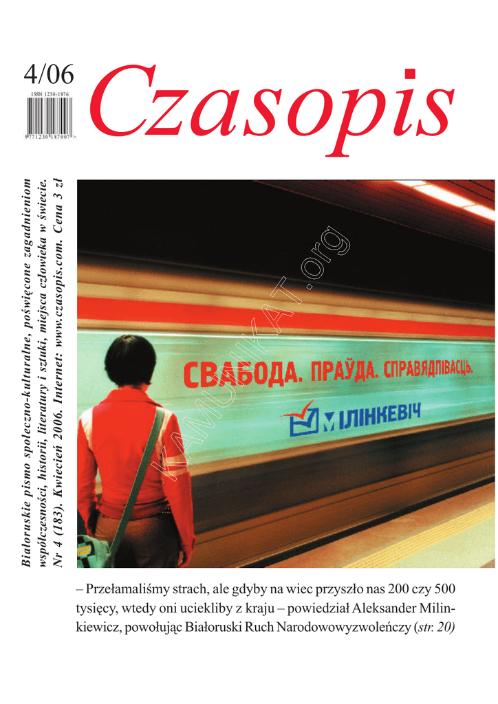 Czasopis Białoruskie pismo społeczno-kulturalne, poświęcone zagadnieniom współczesności, historii, literatury i sztuki, miejsca człowieka w świecie. Nr 4 (183). Kwiecień 2006. Internet: www.czasopis.com. Cena 3 zł 4/06 – Przełamaliśmy strach, ale gdyby na wiec przyszło nas 200 czy 500 tysięcy, wtedy oni uciekliby z kraju – powiedział Aleksander Milinkiewicz, powołując Białoruski Ruch Narodowowyzwoleńczy (str. 20) Шаноўныя чытачы, супрацоўнікі і сябры! Жадаем Вам спакойнага, вясёлага, сямейнага і здаровага Вялікадня! Хай гэта Сьвята напоўніць Вашы сэрцы радасьцю, аптымізмам і дадасьць моцы ў перадольваньні штодзённых праблем. Рэдакцыя W numerze: ■Od Redaktora. Marzec był w Polsce wspaniały. A to... str. 3 ■Юры Гумянюк. Масавы хапун. Слова „хапун” зья... str. 4 ■Сакрат Яновіч. Быць сабою. Савецкі народ Рэс... str. 5 ■Tamara Bołdak-Janowska. Gorzkie krople. Mój k... str. 6 ■Opinie, cytaty. Naród prawosławny nie był nigdy pols... str. 8 ■Minął miesiąc. W regionie. Pod koniec lutego odbył... str. 9 ■Zryw wolności. To były niesamowite, zadziwiają... str. 20 ■Ryszard Radzik. Integrowanie się z Rosją... (wkładka) Od kiedy w 1994 roku XXV Przegląd Piosenki Białoruskiej podniesiono do rangi ogólnopolskiego festiwalu, stał się on jednym z najważniejszych wydarzeń artystycznych Bi... (str.25) – Chodziło o zachowanie ojcowizny. Był to teren dziadka Kornieja, potem ojca Zinowieja, a teraz należy do mnie. Ale żeby siedlisko nie obrastało tylko zielem, krzakami i stary... (str. 27) ■Koncert z jubileuszem. Od kiedy w 1994 roku... str. 25 ■Agroturystyka po białorusku. Rozmowa z Zenob... str. 27 ■Календарыюм. Красавік – гадоў таму. 905 – 14... str. 29 ■Jan Bagiński. Wspomnienia. 32. Dosyć wojny! Nie... str. 30 ■Васіль Петручук. Крошкі. 2. Яны, Яновіч і Плю... str. 32 ■Białostocczyzna pod berłem carów. Niejednokro... str. 33 ■W stronę Szereszewa. 3. Gdynia, lipiec 1968 r. Stat... str. 35 ■Ojciec duchowy Orli. Prawosławna parafia w Orli... str. 36 ■Літаратурная паласа. Каралёўская контррэ... str. 38 ■Tamara Fic. Notatki. Przyjaciele prosili, bym opow... str. 40 ■Юры Гумянюк. Зьмены літліндшафту. 1. Літа... str. 41 ■Bractwo prawosławnych Polaków. 1. Jak bume... str. 43 ■Białoruś. Zakazane piosenki. Sam wybrałeś „B... str. 45 ■Радкі з лістоў, адгалоскі. Szanowna Redakcjo!... str. 46 Na okładce: Plakat wyborczy Aleksandra Milinkiewicza Fot. Paweł Grześ Jerzy Chmielewski Od Redaktora . Marzec był w Polsce wspaniały. A to za sprawą spontanicznych akcji solidarności z Białorusią, które rozlały się na cały kraj. Wiece poparcia, demonstracje i koncerty muzyczne były przepojone najpiękniejszym ideami – wolnością, miłością i patriotyzmem. Tyle ciepłych słów pod adresem Białorusinów nigdy jeszcze w Polsce nie padło. W społecznej świadomości obraz Białorusi zmienił się diametralnie. Jej wyznacznikiem stał się już nie autorytarny przywódca, przeciwko któremu organizowano te akcje, ale wartości europejskie i otwartość na świat, prezentowane przez demokratyczną opozycję. To zasługa głównie młodzieży, wyzbytej dawnych stereotypów i narodowościowych uprzedzeń. W tłumie uczestników solidarnościowej akcji przed białostockim ratuszem czułem prawdziwą świąteczną atmosferę. To był kolorowy festyn przyjaźni, a jego dodatkową ozdobą – występ przewodniczącej BAS-u Ilony Karpiuk jako solistki grupy 5set5. Chociaż białe i czerwone baloniki przesłanie solidarności poniosły za wschodnią granicę, to dały one nadzieję także na poprawę naszego losu, Białorusinów na Podlasiu. Jednak wszystkie te akcje, mimo niezwykle szczytnego celu, jaki im przyświecał, oprócz dodania otuchy wolnościowym środowiskom w Białorusi, jakiegoś praktycznego znaczenia nie miały. Bo marcowa operacja wyborcza została przez władze w Mińsku od początku do końca perfidnie wyreżyserowana, a ostateczny wynik – co było do przewidzenia – w dużym stopniu sfingowa- no. Ale najpierw skutecznie zablokowano wszelkie mechanizmy mogące temu przeszkodzić. Przede wszystkim od dawna nie ma tam alternatywnych źródeł informacji, z których obywatele mogliby się dowiedzieć, co tak naprawdę odbywa się w ich kraju. Niemal wszystkie media są podporządkowane administracji państwowej i przekazują wyłącznie treści prorządowe. Oprócz tego nie ustaje propaganda wobec nieposłusznych, leje się rzeka kłamstw i manipulacji, trwa pranie mózgów. Taka kampania przed marcowymi wyborami oczywiście się nasiliła. Operatorzy państwowych sieci komórkowych wysłali zaś abonentom milion zastraszających sms-ów, by nie popierali opozycji. Jej liderów i działaczy – w sumie ponad trzysta osób – na najgorętszy okres wyborczy pod byle pretekstem pozamykano w więzieniach. Mimo że Aleksander Łukaszenko w dużej mierze dzięki tym brutalnym metodom został prezydentem trzecią kadencję z rzędu, to Białoruś po 19 marca jest już innym krajem. Ze skonsolidowaną i dojrzałą opozycją, której wszak – o ile nie zajdą jakieś nieoczekiwane zdarzenia – przyjdzie toczyć nierówną walkę z populistycznym tyranem pewnie jeszcze długo. Proszony o komentarz do wydarzeń w Białorusi ciągle powtarzam kolegom dziennikarzom z polskich redakcji, że tam wciąż trwa proces samostanowienia i kształtowania się narodu, a błędem jest przykładanie polskich miar do białoruskiej rzeczywistości. Polacy, mając w sercach historyczną skłonność do rewo