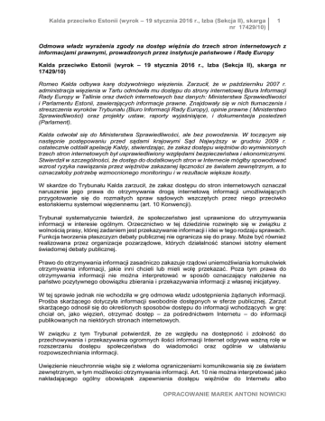 Kalda przeciwko Estonii (wyrok – 19 stycznia 2016 r., Izba (Sekcja II), skarga nr 17429/10) 1 Odmowa władz wyrażenia zgody na dostęp więźnia do trzech stron internetowych z informacjami prawnymi, prowadzonych przez instytucje państwowe i Radę Europy Kalda przeciwko Estonii (wyrok – 19 stycznia 2016 r., Izba (Sekcja II), skarga nr 17429/10) Romeo Kalda odbywa karę dożywotniego więzienia. Zarzucił, że w październiku 2007 r. administracja więzienia w Tartu odmówiła mu dostępu do strony internetowej Biura Informacji Rady Europy w Tallinie oraz dwóch internetowych baz danych: Ministerstwa Sprawiedliwości i Parlamentu Estonii, zawierających informacje prawne. Znajdowały się w nich tłumaczenia i streszczenia wyroków Trybunału (Biuro Informacji Rady Europy), opinie prawne ( Ministerstwo Sprawiedliwości) oraz projekty ustaw, raporty wyjaśniające, i dokumentacja posiedzeń (Parlament). Kalda odwołał się do Ministerstwa Sprawiedliwości, ale bez powodzenia. W toczącym się następnie postępowaniu przed sądami krajowymi Sąd Najwyższy w grudniu 2009 r. ostatecznie oddalił apelację Kaldy, stwierdzając, że zakaz dostępu więźniów do wymienionych trzech stron internetowych był usprawiedliwiony względami bezpieczeństwa i ekonomicznymi. Stwierdził w szczególności, że dostęp do dodatkowych stron w Internecie mógłby spowodować wzrost ryzyka nawiązania przez więźniów zakazanej łączności ze światem zewnętrznym, a to oznaczałoby potrzebę wzmocnionego monitoringu i w rezultacie większe koszty. W skardze do Trybunału Kalda zarzucił, że zakaz dostępu do stron internetowych oznaczał naruszenie jego prawa do otrzymywania drogą internetową informacji umożliwiających przygotowanie się do rozmaitych spraw sądowych wszczętych przez niego przeciwko estońskiemu systemowi więziennemu (art. 10 Konwencji). Trybunał systematycznie twierdził, że społeczeństwo jest uprawnione do utrzymywania informacji w interesie ogólnym. Orzecznictwo w tej dziedzinie rozwinęło się w związku z wolnością prasy, której zadaniem jest przekazywanie informacji i idei w tego rodzaju sprawach. Funkcja tworzenia płaszczyzn debaty publicznej nie ogranicza się do prasy. Może być również realizowana przez organizacje pozarządowe, których działalność stanowi istotny element świadomej debaty publicznej. Prawo do otrzymywania informacji zasadniczo zakazuje rządowi uniemożliwiania komukolwiek otrzymywania informacji, jakie inni chcieli lub mieli wolę przekazać. Poza tym prawa do otrzymywania informacji nie można interpretować w sposób oznaczający nałożenie na państwo pozytywnego obowiązku zbierania i przekazywania informacji z własnej inicjatywy. W tej sprawie jednak nie wchodziła w grę odmowa władz udostępnienia żądanych informacji. Prośba skarżącego dotyczyła informacji swobodnie dostępnych w sferze publicznej. Zarzut skarżącego odnosił się do określonych sposobów dostępu do informacji wchodzących w grę: chciał on, jako więzień, otrzymać dostęp – za pośrednictwem Internetu – do informacji publikowanych na niektórych stronach internetowych. W związku z tym Trybunał potwierdził, że ze względu na dostępność i zdolność do przechowywania i przekazywania ogromnych ilości informacji Internet odgrywa ważną rolę w rozszerzaniu dostępu społeczeństwa do wiadomości oraz ogólnie w ułatwianiu rozpowszechniania informacji. Uwięzienie nieuchronnie wiąże się z wieloma ograniczeniami komunikowania się ze światem zewnętrznym, w tym możliwości otrzymywania informacji. Art. 10 nie można interpretować jako nakładającego ogólny obowiązek zapewnienia dostępu więźniów do Internetu albo OPRACOWANIE MAREK ANTONI NOWICKI 2 Kalda przeciwko Estonii (wyrok – 19 stycznia 2016 r., Izba (Sekcja II), skarga nr 17429/10) konkretnych stron internetowych. W okolicznościach tej sprawy jednak, gdy dostęp do konkretnych stron z informacjami prawnymi był przewidziany prawem estońskim, ograniczenie dostępu do innych - również zawierających informacje prawne - stanowiło ingerencję w prawo do otrzymywania informacji. Ograniczenie korzystania z Internetu było bezspornie oparte na ustawie o więzieniach ograniczającej dostęp więźniów do oficjalnych stron internetowych z ustawodawstwem i bazą danych z orzeczeniami sądów. Dostęp do Internetu poza wyraźnie dozwolonymi stronami był zakazany. Ingerencja wchodząca w grę była przewidziana przez prawo w rozumieniu art. 10 ust. 2 Konwencji i służyła ochronie praw innych osób oraz zapobieganiu zakłóceniom porządku i przestępstwom. W związku z kwestią konieczności w społeczeństwie demokratycznym Trybunał zauważył, że według rządu przyznanie więźniom dostępu do większej liczby stron internetowych podwyższyłoby ryzyko w sferze bezpieczeństwa i wymagało przeznaczenia dodatkowych środków materialnych i zasobów ludzkich, aby je ograniczyć. Skarżący z kolei uważał, że umożliwienie mu dostępu do trzech dodatkowych stron, poza już dostępnymi, nie rodziłoby żadnych dodatkowych problemów w sferze bezpieczeństwa. Możliwe kwestie bezpieczeństwa już wcześniej pozostawały pod kontrolą Ministerstwa Sprawiedliwości, które zablokowało wszelkie linki lub inne funkcje na już dostępnych stronach mogące rodzić problemy związane z bezpieczeństwem. W ocenie skarżącego nie było powodu do innego podejścia w przypadku trzech wnioskowanych stron. Strony internetowe Biura Informacji Rady Europy w Tallinie, Kanclerza Sprawiedliwości oraz parlamentu, do których skarżący chciał mieć dostęp, głównie zawierały informacje prawne i odnoszące się do praw podstawowych, w tym praw więźniów. Na przykład strona parlamentu zawierała projekty ustaw z raportami wyjaśniającymi, protokoły z posiedzeń plenarnych parlamentu i komisji. Strona internetowa Kanclerza Sprawiedliwości (który jest również ombudsma