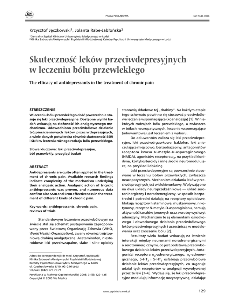 PRACA POGLĄDOWA ISSN 1643–0956 Krzysztof Jęczkowski1, Jolanta Rabe-Jabłońska2 1Centralny 2Klinika Szpital Kliniczny Uniwersytetu Medycznego w Łodzi Zaburzeń Afektywnych i Psychiatrii Młodzieżowej Katedry Psychiatrii Uniwersytetu Medycznego w Łodzi Skuteczność leków przeciwdepresyjnych w leczeniu bólu przewlekłego The efficacy of antidepressants in the treatment of chronic pain STRESZCZENIE W leczeniu bólu przewlekłego dość powszechnie stosuje się leki przeciwdepresyjne. Dostępne wyniki badań wskazują na złożoność ich analgetycznego mechanizmu. Udowodniono przeciwbólowe działanie trójpierścieniowych leków przeciwdepresyjnych, a wiele danych potwierdza również skuteczność SSRI i SNRI w leczeniu różnego rodzaju bólu przewlekłego. Słowa kluczowe: leki przeciwdepresyjne, ból przewlekły, przegląd badań ABSTRACT Antidepressants are quite often applied in the treatment of chronic pain. Available research findings indicate complexity of the mechanism underlying their analgesic action. Analgesic action of tricyclic antidepressants was proven, and numerous data confirm also SSRI and SNRI effectiveness in the treatment of different kinds of chronic pain. Key words: antidepressants, chronic pain, reviews of trials Standardowym leczeniem przeciwbólowym na świecie stał się schemat postępowania zaproponowany przez Światową Organizację Zdrowia (WHO, World Health Organization), zwany również trójstopniową drabiną analgetyczną. Acetaminofen, niesteroidowe leki przeciwzapalne, słabe i silne opioidy Adres do korespondencji: dr med. Krzysztof Jęczkowski Klinika Zaburzeń Afektywnych i Psychiatrii Młodzieżowej Katedry Psychiatrii Uniwersytetu Medycznego w Łodzi ul. Czechosłowacka 8/10, 92–216 Łódź tel./faks: (042) 675 73 71 Psychiatria w Praktyce Ogólnolekarskiej 2005; 3 (5): 129–135 Copyright © 2005 Via Medica stanowią składowe tej „drabiny”. Na każdym etapie tego schematu powinno się stosować przeciwbólowe leczenie wspomagające (koanalgezja) [1]. W niektórych rodzajach bólu przewlekłego, a zwłaszcza w bólach neuropatycznych, leczenie wspomagające (adiuwantowe) jest leczeniem z wyboru. Do adiuwantów zalicza się leki przeciwdepresyjne, leki przeciwdrgawkowe, baklofen, leki znieczulające miejscowo, benzodiazepiny, antagonistów receptora kwasu N-metylo-D-asparaginowego (NMDA), agonistów receptora a2, na przykład klonidynę, kortykosteroidy i inne środki neuromodulujące, na przykład lidokainę. Leki przeciwdepresyjne są powszechnie stosowane w leczeniu bólów przewlekłych, zwłaszcza neuropatycznych. Mechanizm działania leków przeciwdepresyjnych jest wielokierunkowy. Wpływają one na dwa układy neuroprzekaźnikowe — układ serotoninergiczny i noradrenergiczny, w sposób bezpośredni i pośredni działają na receptory opioidowe, blokują receptory histaminowe, muskarynowy, nikotynowy, receptor N-metylo-D-asparaginianu, hamują aktywność kanałów jonowych oraz zwrotny wychwyt adenozyny. Mechanizmy te są elementami ośrodkowego i obwodowego działania przeciwbólowego leków przeciwdepresyjnych i uczestniczą w modelowaniu oraz znoszeniu bólu [2]. Rezultaty wielu badań wskazują na istnienie interakcji między neuronami noradrenergicznymi a serotoninergicznymi, co jest podstawą przeciwbólowego działania leków przeciwdepresyjnych. Antagoniści receptora a2-adrenergicznego, a1-adrenergicznego, 5-HT2 i 5-HT3 osłabiają przeciwbólowe działanie leków przeciwdepresyjnych, co sugeruje udział tych receptorów w analgezji wywoływanej przez te leki [3–6]. Wydaje się, że leki przeciwdepresyjne modulują informację nocyceptywną, działając www.psychiatria.med.pl 129 Psychiatria w Praktyce Ogólnolekarskiej 2005, tom 5, nr 3 głównie nadrdzeniowo (w obrębie wzgórza, podwzgórza, układu limbicznego i kory mózgu), natomiast działanie w obrębie rdzenia może mieć charakter zarówno nasilający, jak i zmniejszający nocycepcję [7]. Receptory adrenergiczne a2 zlokalizowane w rogu tylnym rdzenia kręgowego występują w pobliżu receptorów opioidowych i prawdopodobnie ich aktywacja jest istotna dla wystąpienia analgezji opioidowej. W wielu badaniach wykazano, że działanie przeciwbólowe leków przeciwdepresyjnych może być znacznie zahamowane, ale nie zniesione przez nalokson (inhibitor receptorów opioidowych), a wzmocnione przez łączne podanie z opiatami [8–10]. Leki przeciwdepresyjne mogą uwalniać peptydy opioidowe z miejsc wiązania, modyfikować gęstość receptorów opioidowych i powodować wzrost stężenia endogennych peptydów opioidowych [2]. W badaniu na modelu zwierzęcym wykazano analgetyczne działanie leku przeciwdepresyjnego — wenlafaksyny — które było zmniejszane przez nalokson, a także antagonistę receptora adrenergicznego — johimbinę. Autorzy oceniają, że efekt przeciwbólowy wiąże się z działaniem na receptory opioidowe kappa i delta oraz receptory a2-adrenergiczne [6]. Wyniki wielu badań sugerują, że prawdopodobnym mechanizmem działania przeciwbólowego leków przeciwdepresyjnych jest blokowanie receptora kwasu N-metylo-D-asparaginowego (NMDA) [11, 12]. Leki przeciwdepresyjne, blokując receptor NMDA, obniżają stężenie jonów wapnia wewnątrz neuronu, co prowadzi do hamowania przewodzenia bodźca bólowego [2]. Antagoniści receptora NMDA, na przykład ketamina, wykazują działanie analgetyczne oraz przeciwdepresyjne [13–15]. Jednak wyniki badań na zwierzęcym modelu bólowym, w którym porównywano działanie analgetyczne dordzeniowo podawanych antagonistów receptora NMDA i leków przeciwdepresyjnych, są niejednoznaczne [16, 17]. Leki przeciwdepresyjne hamują również zwrotny wychwyt adenozyny, która uczestniczy w hamowaniu nocycepcji [2]. W badaniach, w których stosowano metyloksantynę (antagonista receptora A1 adenozyny) lub aminofilinę (nieselektywny inhibitor receptorów A1/A2), wykazano zahamowanie efektu analgetycznego