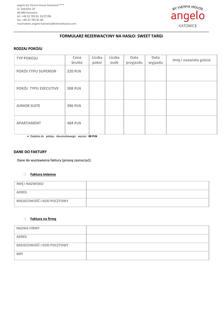 angelo by Vienna House Katowice**** ul. Sokolska 24 40-086 Katowice tel: +48 32 783 81 35/37/06 fax: +48 32 783 81 06 [email protected] FORMULARZ REZERWACYJNY NA HASŁO: SWEET TARGI RODZAJ POKOJU Cena brutto TYP POKOJU POKÓJ TYPU SUPERIOR 220 PLN POKÓJ TYPU EXECUTIVE 308 PLN JUNIOR SUITE 396 PLN APARTAMENT 484 PLN Liczba pokoi Dopłata do pokoju dwuosobowego wynosi 88 PLN DANE DO FAKTURY Dane do wystawienia faktury (proszę zaznaczyć): Faktura imienna IMIĘ I NAZWISKO ADRES MIEJSCOWOŚĆ I KOD POCZTOWY Faktura na firmę NAZWA FIRMY ADRES MIEJSCOWOŚĆ I KOD POCZTOWY NIPl Liczba osób Data przyjazdu Data wyjazdu Imię i nazwisko gościa angelo by Vienna House Katowice**** ul. Sokolska 24 40-086 Katowice tel: +48 32 783 81 35/37/06 fax: +48 32 783 81 06 [email protected] FORMULARZ REZERWACYJNY NA HASŁO: SWEET TARGI WARUNKI REZERWACJI ORAZ ANULACJI 1. 2. Powyższe ceny zawierają śniadanie, podatek VAT, dostęp do internetu oraz wejście do hotelowej sauny i siłowni. Ceny specjalne na hasło SWEET TARGI obowiązują na rezerwacje zrealizowane pomiędzy 25-27.03.2017. Rezerwacji można dokonywać do dnia 17.03.2017. 3. Hotel wymaga danych karty kredytowej Gościa lub przedpłaty na konto bankowe przed przyjazdem gościa do hotelu. 4. W przypadku braku płatności hotel ma prawo anulować rezerwację. 5. Wszystkie rezerwacje przedpłacone są gwarantowane. 6. Przedpłaty za rezerwację proszę dokonać do dnia 17.03.2017 7. Bezkosztowa anulacja/zmiana rezerwacji jest możliwa do dnia 17.03.2017. 8. Opłata staje się bezzwrotna po dokonaniu modyfikacji lub anulacji rezerwacji po upłynięciu terminu bezkosztowej anulacji. 9. Modyfikacje oraz anulacje rezerwacji wymagane są w formie pisemnej (e-mail, fax) 10. Rezerwacje będą potwierdzane w specjalnych cenach do wyczerpania puli pokoi oraz w zależności od dostępności pokoi 11. Doba hotelowa zaczyna się o godz. 14:00, kończy o godz. 12:00 dnia następnego. FORMA PŁATNOŚCI Prosimy o dokonanie rezerwacji gwarantowanej (proszę zaznaczyć): Wyrażam zgodę, na obciążenie poniższej karty kredytowej kosztami rezerwacji: NUMER KARTY:...................................................... DATA WAŻNOŚCI:.................................................. KWOTA:................................................................. Bank Nr PLN Rezerwacja zostanie opłacona przelewem bankowym: mBank S.A. 94 1140 1081 0000 2389 2200 1004 Właściciel W temacie wpłaty proszę o podać imię i nazwisko gościa nocującego. OŚWIADCZAM, ŻE ZAPOZNAŁAM/EM SIĘ I AKCEPTUJĘ WARUNKI REZERWACJI/ANULACJI DATA PODPIS UBX Katowice Sp. z o.o.