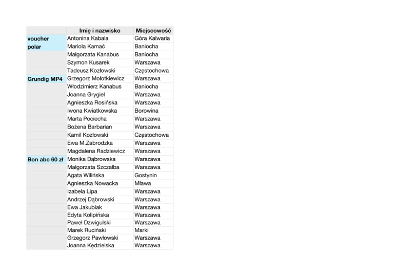 Imię i nazwisko Miejscowość voucher polar Grundig MP4 Bon abc