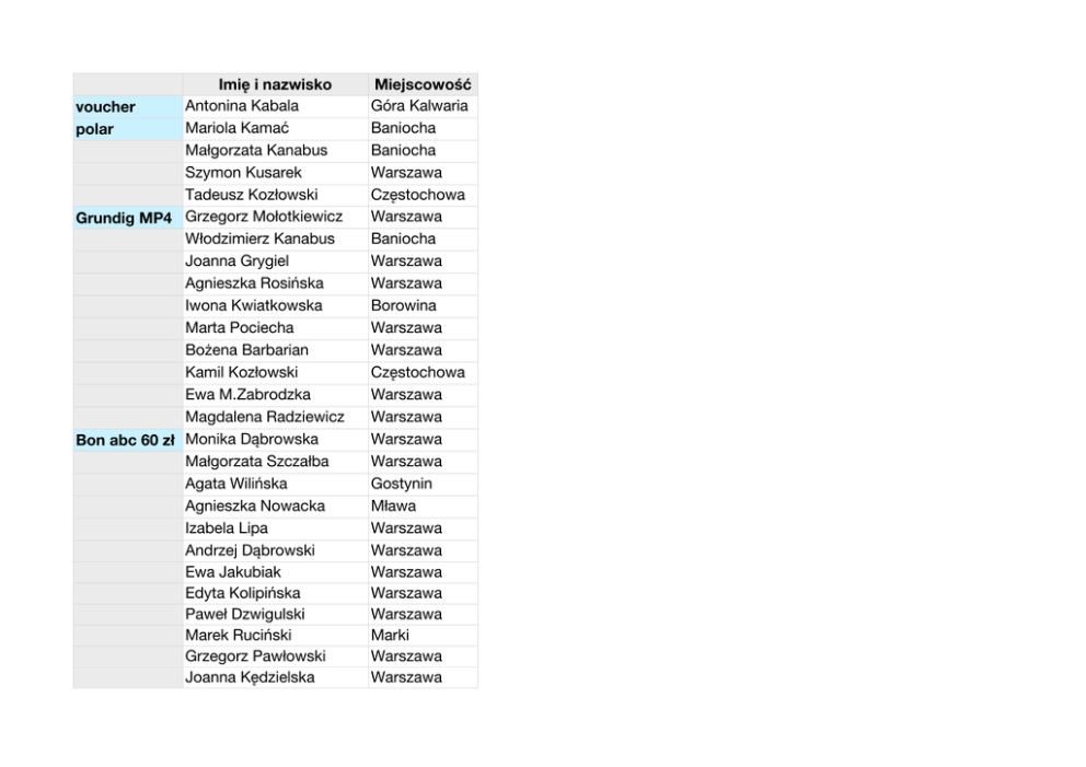 Imię i nazwisko Antonina Kabala voucher Mariola Kamać polar Małgorzata Kanabus Szymon Kusarek Tadeusz Kozłowski Grundig MP4 Grzegorz Mołotkiewicz Włodzimierz Kanabus Joanna Grygiel Agnieszka Rosińska Iwona Kwiatkowska Marta Pociecha Bożena Barbarian Kamil Kozłowski Ewa M.Zabrodzka Magdalena Radziewicz Bon abc 60 zł Monika Dąbrowska Małgorzata Szczałba Agata Wilińska Agnieszka Nowacka Izabela Lipa Andrzej Dąbrowski Ewa Jakubiak Edyta Kolipińska Paweł Dzwigulski Marek Ruciński Grzegorz Pawłowski Joanna Kędzielska Miejscowość Góra Kalwaria Baniocha Baniocha Warszawa Częstochowa Warszawa Baniocha Warszawa Warszawa Borowina Warszawa Warszawa Częstochowa Warszawa Warszawa Warszawa Warszawa Gostynin Mława Warszawa Warszawa Warszawa Warszawa Warszawa Marki Warszawa Warszawa Imię i nazwisko Magdalena Wiśniewska Helena Sołościuk Joalanta Figurska Krzysztof Matusiak Izabela Michalak Miejscowość Warszawa Warszawa Warszawa Żyradów Warszawa