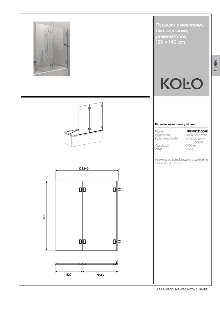 NIVEN Parawan nawannowy dwuczęściowy prawostronny 125 x 140 cm Parawan nawannowy Niven ________________________________ Numer: Wypełnienie: Kolor okuć/profili: Wysokość: Waga: FPNF12222008R szkło hartowane chrom/srebrny połysk 1400 mm 35 kg Parawany do kompletowania z wannami o szerokości od 75 cm. PARAWANY NAWANNOWE NIVEN