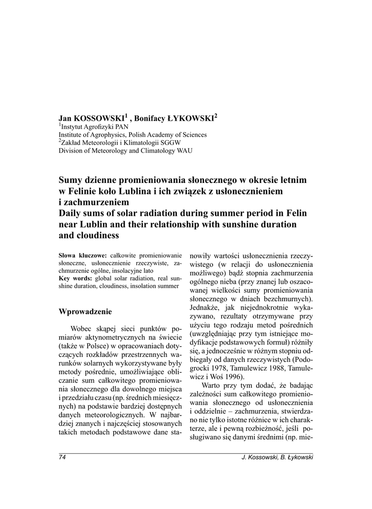 Jan KOSSOWSKI1 , Bonifacy ŁYKOWSKI2 1 Instytut Agrofizyki PAN Institute of Agrophysics, Polish Academy of Sciences 2 Zakład Meteorologii i Klimatologii SGGW Division of Meteorology and Climatology WAU Sumy dzienne promieniowania słonecznego w okresie letnim w Felinie koło Lublina i ich związek z usłonecznieniem i zachmurzeniem Daily sums of solar radiation during summer period in Felin near Lublin and their relationship with sunshine duration and cloudiness Słowa kluczowe: całkowite promieniowanie słoneczne, usłonecznienie rzeczywiste, zachmurzenie ogólne, insolacyjne lato Key words: global solar radiation, real sunshine duration, cloudiness, insolation summer Wprowadzenie Wobec skąpej sieci punktów pomiarów aktynometrycznych na świecie (także w Polsce) w opracowaniach dotyczących rozkładów przestrzennych warunków solarnych wykorzystywane były metody pośrednie, umożliwiające obliczanie sum całkowitego promieniowania słonecznego dla dowolnego miejsca i przedziału czasu (np. średnich miesięcznych) na podstawie bardziej dostępnych danych meteorologicznych. W najbardziej znanych i najczęściej stosowanych takich metodach podstawowe dane sta74 nowiły wartości usłonecznienia rzeczywistego (w relacji do usłonecznienia możliwego) bądź stopnia zachmurzenia ogólnego nieba (przy znanej lub oszacowanej wielkości sumy promieniowania słonecznego w dniach bezchmurnych). Jednakże, jak niejednokrotnie wykazywano, rezultaty otrzymywane przy użyciu tego rodzaju metod pośrednich (uwzględniając przy tym istniejące modyfikacje podstawowych formuł) różniły się, a jednocześnie w różnym stopniu odbiegały od danych rzeczywistych (Podogrocki 1978, Tamulewicz 1988, Tamulewicz i Woś 1996). Warto przy tym dodać, że badając zależności sum całkowitego promieniowania słonecznego od usłonecznienia i oddzielnie – zachmurzenia, stwierdzano nie tylko istotne różnice w ich charakterze, ale i pewną rozbieżność, jeśli posługiwano się danymi średnimi (np. mieJ. Kossowski, B. Łykowski sięcznymi) z wielolecia i gdy korzystano z danych dobowych (Berland 1960, Paltineanu i in. 2002). Ponadto trzeba mieć na uwadze, że na ostateczny kształt tychże zależności znaczący wpływ wywierać może czynnik lokalny, w tym ukształtowanie (topografia) i rodzaj terenu (typ krajobrazu), w jakim ulokowana jest stacja meteorologiczna, a także bliskość zakładów przemysłowych, miast i korytarzy lotniczych. Jest więc raczej normą, iż rzeczywiste (określone drogą pomiarów) stosunki radiacyjne w danym miejscu różnią się od oszacowanych metodami klimatycznymi, a tym bardziej dotyczy to danych uzyskiwanych z interpolacji między stacjami (map). Stąd też wynika potrzeba prowadzenia obserwacji aktynometrycznych w rozmaitych warunkach terenowych oraz publikowania ich wyników, nawet jeśli zebrane materiały nie pochodzą z długiego okresu lub nie obejmują pełnego cyklu rocznego. Niniejsza praca dotyczy podstawowych, bezpośrednich związków wielkości sum dziennych całkowitego promieniowania słonecznego z usłonecznieniem i zachmurzeniem, opisywanych w możliwie najprostszy sposób (równaniami liniowymi lub wielomianem), oraz efektywności stosowania takich równań do szacowania wartości sum tego promieniowania w przypadku posługiwania się danymi dziennymi i uśrednionymi dla dekad. Zależności te rozpatrywano na podstawie danych odnoszących się do okresu zbliżonego do insolacyjnego lata, a dodatkowo do dni bezopadowych i z opadem podczas tego okresu. Materiał i metody Podstawę opracowania stanowi materiał obserwacyjny zebrany podczas kilkuletnich badań prowadzonych na obiektach (Obserwatorium Agrometeorologiczne i pola doświadczalne) lubelskiej Akademii Rolniczej w Felinie koło Lublina (φ N 51o 14`; λ E 22o 38`), a który tylko fragmentarycznie (i pod innym kątem) wykorzystany był w dotychczas opublikowanych pracach (Łykowski 1987, Kossowski i Łykowski 1999, Kossowski 2000). Obejmuje on dane dotyczące sum dziennych promieniowania słonecznego całkowitego (ΣQsd) oraz usłonecznienia rzeczywistego (Ur) i stopnia zachmurzenia ogólnego (No) w dniach od 11 maja do 31 lipca w latach 1978, 1979, 1984, 1988 i 1989. Przyjęty przedział czasowy rozpatrywanych danych jest nieprzypadkowy – jest on tylko nieznacznie krótszy od okresu „insolacyjnego lata” w Lublinie (Filipiuk 1995), a zarazem dostosowany do pełnych dekad. Ponadto charakteryzuje go długi, trwający co najmniej 15,5 godziny, dzień oraz niewielkie zróżnicowanie jego długości, sięgające najwyżej około 7% w stosunku do najdłuższego dnia. Promieniowanie słoneczne mierzono solarymetrem firmy Kipp i Zonen umieszczonym na wysokości 2,5 m nad powierzchnią trawnika stacji, przy czym sygnał napięciowy z przyrządu był rejestrowany (z krokiem czasowym 40 lub 120 s – zależnie od sezonu), a jednocześnie (od połowy sezonu 1979) zliczany dla okresu doby przy użyciu integratora Sumy dzienne promieniowania słonecznego w okresie letnim... 75 tej samej firmy. Zaistniałe z przyczyn technicznych (głównie braku zasilania) luki w ciągu tych pomiarów (po kilka dni w sezonie, w sumie 23) zostały uzupełnione danymi uzyskanymi z Obserwatorium Meteorologicznego UMCS, położonego w centrum Lublina (około 7 km od Felina). Jeśli chodzi o materiały wykorzystywane w pracy (heliograficzne i nefologiczne), to warto jedynie zwrócić uwagę, że średni dla dnia stopień zachmurzenia ogólnego określano na podstawie obserwacji w 3 standardowych terminach, przy stosowaniu jednolitej skali 0–10 (dane z sezonu 1989 notowane w skali 0–8 zostały odpowiednio przeliczone). Opracowanie i analizę materiału obserwacyjnego wykonano dla następujących zbiorów danych: pełnego – z codziennych pomiarów i obserwacji w 8 dekadach rozpatrywanych 5 lat (łącznie 410 dni), ograniczonego do dni bezopadowych (było ich 252) oraz z opadem (158 dni). Kryterium wydzielenia 