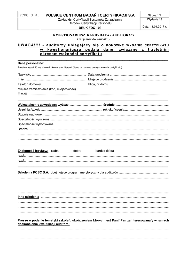 PCBC S.A. POLSKIE CENTRUM BADA I CERTYFIKACJI S.A. Zakład ds. Certyfikacji Systemów Zarządzania Ośrodek Certyfikacji Personelu DRUK FDC - 03 Strona 1/2 Wydanie 13 Data: 11.01.2017 r. KWESTIONARIUSZ KANDYDATA / AUDITORA*) (załącznik do wniosku) UW AG A!!!! - auditorzy ubiegając y się o P O N OW N E W Y D AN I E CE RT Y FI K AT U w kwestionariuszu podają dane, zw iązane z trzyletnim okresem w ażności certyfikatu ______________________________________________________________________________________ Dane personalne: Prosimy wypełnić wyraźnie drukowanymi literami (dane te posłużą do wystawienia certyfikatu) Nazwisko .............................................................. Data urodzenia ................................................................... Imię ...................................................................... Miejsce urodzenia .............................................................. Telefon domowy ................................................. Ulica, nr domu ................................................................... Miejsce zamieszkania (kod, miejscowość) ........................................................................................................ E-mail:……………………………………………………………………………………………………………………… ______________________________________________________________________________________ Wykształcenie zawodowe: wyższe....................................... średnie.............................................................. Uczelnia /szkoła ...................................................................... rok ukończenia................................................... Stopnie naukowe ................................................................................................................................................ Specjalność wyuczona......................................................................................................................................... Specjalność wykonywana.................................................................................................................................... Branża................................................................................................................................................................. ............................................................................................................................................................................. ............................................................................................................................................................................. ______________________________________________________________________________________ Znajomość języków: słaba dobra bardzo dobra język..................................................................................................................................................................... język..................................................................................................................................................................... ______________________________________________________________________________________ Szkolenia PCBC S.A. obejmujące program merytoryczny dla auditorów ........................................................ ............................................................................................................................................................................. ............................................................................................................................................................................. ............................................................................................................................................................................. ............................................................................................................................................................................. Inne szkolenia .................................................................................................................................................. ............................................................................................................................................................................. ............................................................................................................................................................................. ............................................................................................................................................................................. ............................................................................................................................................................................. Proszę o podanie tematyki szkole , uko czeniem których jest Pani/ Pan zainteresowana/y w ramach doskonalenia kwalifikacji auditora: ............................................................................................................................................................................. ............................................................................................................................................................................. ............................................................................................................................................................................. PCBC S.A. POLSKIE CENTRUM BADA I CERTYFIKACJI S.A. Zakład ds. Certyfikacji Systemów Zarządzania Ośrodek Certyfikacji Personelu DRUK FDC - 03 Strona 2/2 Wydanie 13 Data: 11.01.2017 r. Skargi i reklamacje dotyczące działalności auditora (wypełnia osoba będąca auditorem): Liczba skarg i reklamacji w okresie ważności certyfikatu