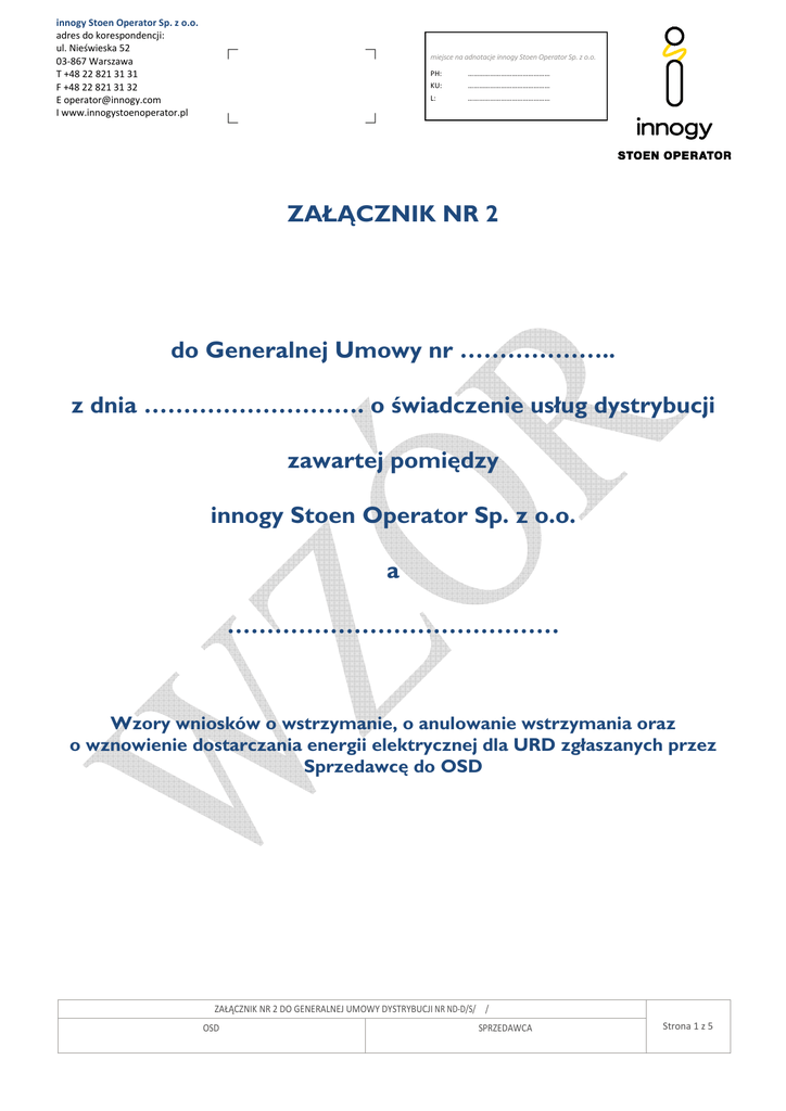 innogy Stoen Operator Sp. z o.o. adres do korespondencji: ul. Nieświeska 52 03-867 Warszawa T +48 22 821 31 31 F +48 22 821 31 32 E [email protected] I www.innogystoenoperator.pl miejsce na adnotacje innogy Stoen Operator Sp. z o.o. PH: ……………………………………… KU: ……………………………………… L: ……………………………………… ZAŁĄCZNIK NR 2 do Generalnej Umowy nr ……………….. z dnia ………………………. o świadczenie usług dystrybucji zawartej pomiędzy innogy Stoen Operator Sp. z o.o. a …………………………………… Wzory wniosków o wstrzymanie, o anulowanie wstrzymania oraz o wznowienie dostarczania energii elektrycznej dla URD zgłaszanych przez Sprzedawcę do OSD ZAŁĄCZNIK NR 2 DO GENERALNEJ UMOWY DYSTRYBUCJI NR ND-D/S/ / OSD SPRZEDAWCA Strona 1 z 5 innogy Stoen Operator Sp. z o.o. adres do korespondencji: ul. Nieświeska 52 03-867 Warszawa T +48 22 821 31 31 F +48 22 821 31 32 E [email protected] I www.innogystoenoperator.pl 1. miejsce na adnotacje innogy Stoen Operator Sp. z o.o. PH: ……………………………………… KU: ……………………………………… L: ……………………………………… Podstawowym sposobem przekazywania OSD wniosków o wstrzymanie dostarczania energii elektrycznej URD, o anulowanie wstrzymania i o wznowienie dostarczania energii elektrycznej jest składanie tych wniosków poprzez dedykowany system informatyczny, o którym mowa w Umowie. 2. W przypadku wystąpienia utrudnień technicznych, o czym OSD poinformuje Sprzedawcę, uniemożliwiających przekazanie wniosków w sposób określony w ust. 1, dopuszcza się przekazanie OSD wniosków na dedykowany adres e-mail wskazany w Załączniku nr 3 do Umowy. W takim przypadku wnioski powinny być wysłane przez upoważnionych przedstawicieli Sprzedawcy wskazanych w Załączniku nr 3 do Umowy, zgodnie z załączonymi wzorami. 3. Sprzedawca zobowiązuje się ponosić pełną odpowiedzialność wobec URD, któremu wstrzymano dostarczanie energii na wniosek Sprzedawcy, jak i wobec OSD, w przypadku gdy wstrzymanie nastąpi z naruszeniem przez Sprzedawcę procedury, o której mowa w ustawie Prawo energetyczne. 4. Zmiana przez OSD wzorów poniższych formularzy nie wymaga aktualizacji Umowy w formie aneksu do Umowy, przy czym OSD, dla zachowania skuteczności dokonanych zmian, zobowiązuje się do przekazywania nowego formularza przy zachowaniu formy pisemnej oraz w formie elektronicznej na adres wymieniony w Załącznika nr 3 do Umowy. ZAŁĄCZNIK NR 2 DO GENERALNEJ UMOWY DYSTRYBUCJI NR ND-D/S/ / OSD SPRZEDAWCA Strona 2 z 5 innogy Stoen Operator Sp. z o.o. adres do korespondencji: ul. Nieświeska 52 03-867 Warszawa T +48 22 821 31 31 F +48 22 821 31 32 E [email protected] I www.innogystoenoperator.pl miejsce na adnotacje innogy Stoen Operator Sp. z o.o. PH: ……………………………………… KU: ……………………………………… L: ……………………………………… WNIOSEK O WSTRZYMANIE DOSTARCZANIA ENERGII ELEKTRYCZNEJ DLA ODBIORCY Sprzedawca wnosi do OSD jako Operatora Systemu Dystrybucyjnego o wstrzymanie dostarczania energii elektrycznej do Odbiorcy, który jest wyszczególniony w poniższej tabeli. Data wniosku Miejscowość Dane Sprzedawcy: Nazwa Sprzedawcy Kod identyfikacyjny nadany przez OSD/OSP Nr umowy pomiędzy OSD a Sprzedawcą Dane teleadresowe Sprzedawcy Dane osoby upoważnionej przez Sprzedawcę do złożenia wniosku (imię i nazwisko, nr telefonu, adres e-mail) Dane URD: Nazwa URD Adres obiektu (kod pocztowy, miejscowość, ulica, nr budynku i nr lokalu) Kod identyfikacyjny PPE Nr telefonu (opcjonalnie) Adres e-mail (opcjonalnie) Sprzedawca oświadcza, że URD zwleka z zapłatą za pobraną energię elektryczną wynikającą z zawartej pomiędzy nimi umowy sprzedaży energii elektrycznej. Sprzedawca potwierdza, iż dopełnił wszelkich obowiązków wynikających z ustawy Prawo energetyczne. Sprzedawca zobowiązuje się do ponoszenia pełnej odpowiedzialności wobec URD, który został wyłączony na wniosek Sprzedawcy, jak i wobec OSD, w przypadku gdy wstrzymanie dostarczania energii elektrycznej nastąpi z naruszeniem przez Sprzedawcę procedury, o której mowa w ustawie Prawo energetyczne. Podpis Sprzedawcy: ………………………………………………….. data/podpis Sprzedawcy Adnotacje OSD: Sposób realizacji wniosku: Przyjęto/odrzucono* Wpłynęło: ………………………… data/podpis Pieczęć/data ZAŁĄCZNIK NR 2 DO GENERALNEJ UMOWY DYSTRYBUCJI NR ND-D/S/ / OSD SPRZEDAWCA Strona 3 z 5 innogy Stoen Operator Sp. z o.o. adres do korespondencji: ul. Nieświeska 52 03-867 Warszawa T +48 22 821 31 31 F +48 22 821 31 32 E [email protected] I www.innogystoenoperator.pl miejsce na adnotacje innogy Stoen Operator Sp. z o.o. PH: ……………………………………… KU: ……………………………………… L: ……………………………………… WNIOSEK O ANULOWANIE WSTRZYMANIA DOSTARCZANIA ENERGII ELEKTRYCZNEJ DLA ODBIORCY Sprzedawca wnosi do OSD o anulowanie wstrzymania dostarczania energii elektrycznej URD, który jest wyszczególniony we wniosku: Data wniosku Miejscowość Dane Sprzedawcy: Nazwa Sprzedawcy Kod identyfikacyjny nadany przez OSD/OSP Nr umowy pomiędzy OSD a Sprzedawcą Dane teleadresowe Sprzedawcy Dane osoby upoważnionej przez Sprzedawcę do złożenia wniosku (imię i nazwisko, nr telefonu, adres e-mail) Dane URD: Nazwa URD Adres obiektu (kod pocztowy, miejscowość, ulica, nr budynku i nr lokalu) Kod identyfikacyjny PPE Nr telefonu (opcjonalnie) Adres e-mail (opcjonalnie) Sprzedawca akceptuje, że realizacja przez OSD wniosku o anulowanie wstrzymania dostarczania energii elektrycznej, w związku z złożonym wcześniej przez Sprzedawcę wnioskiem o wstrzymanie dostarczania energii elektrycznej może być niemożliwa, a wówczas OSD nie ponosi jakiekolwiek odpowiedzialności z tytułu w