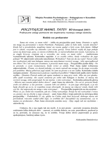 Miejska Poradnia Psychologiczno – Pedagogiczna w Koszalinie ul. Morska 43, tel.: 343 01 99 Red. Aleksandra Danielewicz, Danuta Lewandowska POCZYTAJCIE MAMO, TATO! 80 (listopad 2007) Praktyczne uwagi pomocne we wspieraniu rozwoju swego dziecka Rodzic czy prokurator Sama nie wiem, co mam robić – żaliła się przyjaciółce pani Anna. Ostatnio w ogóle nie mogę się porozumieć z moim Piotrkiem. Pamiętasz, jakie to było miłe, wesołe dziecko? Kiedy był w przedszkolu, mogliśmy śmiać się razem, gadać o byle czym, było fajnie. Odkąd jest w szkole, wszystko się zmieniło i jest coraz gorzej. Teraz ledwie wejdę do jego pokoju zaraz się denerwuje, pyta, co znowu zrobiłem źle, co narozrabiałem tym razem. I powtarza, że ja ciągle krzyczę, czepiam się o wszystko, nie wiem, co mam robić.. – zaaferowana wymachiwała rękoma. Koleżanka zapytała: A co zwykle robisz, kiedy wchodzisz do jego pokoju? W odpowiedzi usłyszała natychmiast. Wchodzisz? Tam nie da się wejść! Nawet sobie nie wyobrażasz jaki tam bałagan, muszę mu natychmiast zwrócić uwagę , żeby uporządkował ten chlew! No i od razu jest awantura, a przecież mam rację… Przyjaciółka pytała dalej - No to powiedz, o czym rozmawiacie, kiedy wróci ze szkoły. Pani Anna nadal wzburzona odpowiedziała - Pytam, czy dostał jedynkę, czy może wpisali mu uwagę, bo do niego wszystko jest podobne. Muszę pilnować jego nauki, bo sam na pewno o to nie zadba. Koleżanka zadała następne pytanie - Rozmawiacie podczas wspólnych posiłków? Odpowiedź padła znów bardzo szybko - Ostatnio Piotrek unika jak ognia siadania ze mną przy stole. Albo nie jest głodny, albo zjadł wcześniej. Ale często zostawia po sobie taki bałagan w kuchni, że muszę mu zwrócić uwagę, żeby posprzątał, bo nie można z nim wytrzymać... Koleżanka pokręciła głową - Mówisz mu czasem jakieś dobre słowo? –pani Anna się zdziwiła - No coś ty, przecież kiedy zrobi coś dobrze- a nie powiem - czasem robi coś dobrze - to jest jego obowiązek, a ja nie będę chwalić go za to, że wypełnia swoje obowiązki. Ja muszę się włączyć wtedy, kiedy robi coś źle. Już naprawdę nie mogę z nim wytrzymać... Przyjaciółka popatrzyła na nią uważnie Wiesz co, ja z kolei nie rozumiem, jak on z Tobą wytrzymuje. Święty by nie wytrzymał. I wiesz co, postaw się na chwilę w jego sytuacji. – pani Anna zbita z tropu patrzyła na mówiącą dalej przyjaciółkę – Podobałoby Ci się, gdyby na Ciebie stale ktoś krzyczał, dobrego słowa nie powiedział, wiecznie szukał tylko tego, co zrobiłaś źle? Zaczęłabyś się zastanawiać, czy to mama czy prokurator…Pani Anna otworzyła szeroko oczy - Ojej, nigdy tak nie myślałam – zdziwiła się. Ciekawe, ilu z nas nigdy tak nie myśli. A to jest proste – powiedz swojemu dziecku codziennie kilka dobrych słów – zauważ, co zrobiło dobrze, na czas, prawidłowo, pochwal je za to, powiedz, że cieszysz się, że to zrobiło. Twoje dobre słowo poprowadzi je przez spokojniejsze, bardziej udane życie. Aleksandra Danielewicz Miejska Poradnia Psychologiczno – Pedagogiczna w Koszalinie ul. Morska 43, tel.: 343 01 99 Red. Aleksandra Danielewicz, Danuta Lewandowska POCZYTAJCIE MAMO, TATO! 80 (listopad 2007) Praktyczne uwagi pomocne we wspieraniu rozwoju swego dziecka Przybliżamy terminologię fachowców Rodzice podczas pobytu z dzieckiem w poradni na badaniu stykają się z nową terminologią, która może być dla nich mało zrozumiała bądź niejasna. Mimo starań pracowników poradni, rodzice przejęci całą sytuacją mają prawo nie zapamiętać wszystkich wyjaśnień i często nowego dla nich słownictwa. Stąd warto przybliżyć najczęściej używane terminy. Diagnoza psychologiczna – określenie to może odnosić się po pierwsze do czynności wykonywanych przez psychologa w celu wyjaśnienia nieprawidłowego funkcjonowania dziecka, jak też określać efekt końcowy pracy czyli opis i wyjaśnienie zaburzeń przez wskazanie ich przyczyn i mechanizmów psychologicznych. Rozwój psychoruchowy dziecka – jest to proces rozwoju, w którym motoryka jest ściśle związana z psychiką. Jeśli rozwój poszczególnych sfer odbywa się w jednakowym tempie mówimy o rozwoju harmonijnym. Natomiast, jeśli poszczególne sfery rozwijają się w innym tempie, to mówimy o nieharmonijności w rozwoju (opóźnieniu lub przyśpieszeniu). Poziom rozwoju intelektualnego – jest to ilościowe określenie ogólnych zdolności dziecka do rozwiązywania nowych problemów, samodzielnego myślenia, a także nabytej już wiedzy i umiejętności. Upośledzenie umysłowe – stan charakteryzujący się istotnie niższym od przeciętnego ogólnym poziomem funkcjonowania intelektualnego i zaburzeniami w zakresie przystosowania się. Zaburzenia w przystosowaniu się przejawiają się trudnościami w uczeniu się i przystosowaniu społecznym. Lateralizacja – dominacja po jednej stronie ciała narządów ruchu (ręki i nogi) i zmysłu (oka, ucha.) Jeśli wszystkie dominujące narządy i zmysły usytuowane są po jednej stronie ciała mówimy o lateralizacji ustalonej: prawo– lub lewostronnej. Jeśli jest to zróżnicowane, to mówimy o lateralizacji skrzyżowanej, a w przypadku braku dominacji wymienionych narządów lateralizacji nieustalonej. Objawy zaburzonej lateralizacji to między innymi: mylenie liter o podobnych kształtach, przestawianie liter, zmienianie ich kolejności, opuszczanie lub dodawanie liter. Za miesiąc ciąg dalszy fachowej terminologii. Joanna Jóźwiak