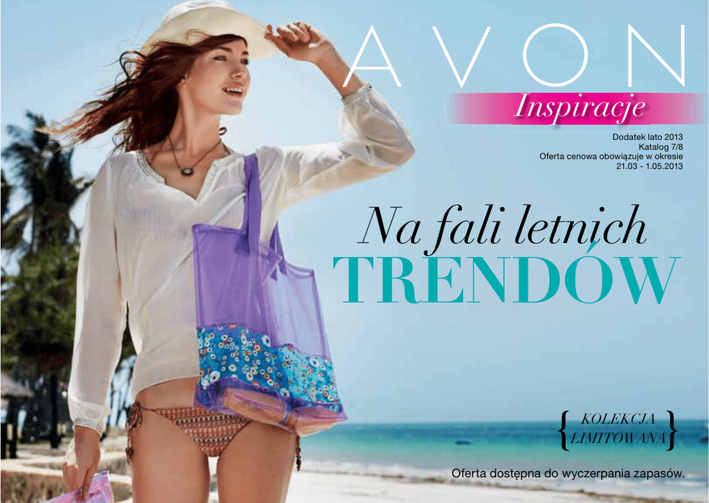 Inspiracje Dodatek lato 2013 Katalog 7/8 Oferta cenowa obowiązuje w okresie 21.03 - 1.05.2013 Na fali letnich TRENDÓW KOLEKCJA LIMITOWANA Oferta dostępna do wyczerpania zapasów. TRENDY na lato pełnia KOLORÓW Zapomnij o pastelach i szarości... Lato już tuż tuż, a więc to najwyższy czas, aby wzbogacić twoją garderobę o soczyste i pełne energii kolory. 2 1 Rozmiar 6 3524 6 5. Torba Beach Bar PVC, biało-różowa, 38 x 44 x 10,3 cm, wys. rączek: 24,5 cm, zamykana na zatrzask, 3 wewnętrzne kieszenie (1 na suwak) Rozmiar 8 3518 8 2 Rozmiar 10 3525 3 0301 2 100,00 Ł ERIA 5 POSREBRZANE MATICZ YM N A R A LN U T A N A SKÓR za jedyne 5999 3 4 Biżuteria Avon jest hipoalergiczna. 1. Pierścionek Color Kick szerokość: 1,2 cm 2. Bransoletka Color Kick średnica: 6 cm 3. Kolczyki Color Kick długość: 3,9 cm 4. Naszyjnik Color Kick długość naszyjnika: 42 + 9 cm, długość przywieszki: 4,5 cm 2978 5 3566 7 3526 1 45,00 50,00 35,00 50,00 2999 3499 2499 2999 3 TRENDY na lato róż BLUES A skoro już mowa o kolorach... Róż będzie królował tego lata – to niewybaczalny błąd nie mieć go na sobie. Róż i soczysta pomarańcza to najgorętsza para tego sezonu! 4 4 4. Zegarek Jazreena średnica koperty: 3,5 cm, średnica tarczy: ok. 2,8 cm, regulowany pasek, maks. długość: 20,5 cm 2 1 WJE! WOO ŻNA ! efek t M YĆ Z ŁOŻ 2026 3 pię kn yc h, d 100,00 ł ug ic h nó g i dzięki 3 cm koturnow Biżuteria Avon jest hipoalergiczna. Wszystkie zegarki zawierają wymienne baterie i mają 2 lata gwarancji. za jedyne 6499 3 3. Torba Treena PVC, 26 x 44,7 x 11 cm, wys. rączek: 17 cm, 3 wewnętrzne kieszenie (1 na suwak) 3036 1 2. Sandały Treena Poliester, rozmiary: 37-40 6495 6 - rozmiar 37 6494 9 - rozmiar 38 6492 3 - rozmiar 39 6491 5 - rozmiar 40 50,00 70,00 110,00 3499 4999 8999 1. Okulary przeciwsłoneczne Beach Casual ochrona UV 400, szerokość: 13,9 cm 2967 8 5 TRENDY na lato nowy ROMANTYZM Możesz zachwycać, nawet jeśli nie lubisz stylistycznych eksperymentów! Na ten sezon projektanci oferują również bardziej subtelny, romantyczny, ale i nowoczesny styl oparty na bieli i srebrnych dodatkach. 6 podsz k rop i ka w k ew 1 3 4 5. Bransoletka Valerie wymiary: 18,5 + 2,5 cm 2121 2 E YCZN KLASERŁY P M A LN Y 35,00 POSREBRZANE YGIN W OR YDANIU W za jedyne 2499 UV 400 2 1. Torba Faye PVC, kremowa, 30 x 40 x 15 cm, wysokość rączki: 23 cm, zapinana na suwak i zatrzask, 2 kieszenie wewnętrzne (1 na suwak). 2. Okulary przeciwsłoneczne Odette ochrona UV 400, szerokość: 15 cm 3. Naszyjnik Valerie długość: 42+ 9 cm 4. Kolczyki Valerie długość: 4,5 cm 3755 6 2970 2 2099 0 2128 7 110,00 50,00 50,00 30,00 8999 3499 2499 1999 5 Biżuteria Avon jest hipoalergiczna. 7 TRENDY na lato odważna W STYLU BOHO Kolory czerpiące z natury i złoto są zawsze modne. Jest to idealne rozwiązanie dla tych, którzy cenią sobie wygodę, a jednocześnie nie chcą sztywno trzymać się zasad. sandałki dostępne na str. 11 8 3 1 NIE Z IS MUSSZUKAĆ 4. Naszyjnik Pszczółka długość naszyjnika: 42 + 9 cm, wymiary przywieszki: 2,7 x 2,4 cm JUŻ NYCH! B D RO 0026 5 40,00 za jedyne 2499 4 1. Zestaw Denia: naszyjnik i kolczyki naszyjnik: 42+9 cm, kolczyki: 3 cm 2. Okulary przeciwsłoneczne Taranna ochrona UV 400, szerokość: 18,2 cm 3. Torba Summer Tote poliester, kremowy, 34 x 44 x 33 cm, wysokość rączek: 22,3 cm, pełna długość paska: 110 cm, zapinana na suwak, 2 wewnętrzne kieszenie w tym 1 na telefon. Odpinany/ regulowany pasek i odpinana portmonetka, 11,1 x 14,2 cm 3057 7 0318 6 0912 6 50,00 50,00 110,00 3999 3499 6999 2 Biżuteria Avon jest hipoalergiczna. 9 TRENDY na lato egzotyczna BOGINI Idealnie dobrane dodatki w odcieniach stonowanego brązu i złota to świetny wybór dla kobiet, które pragną podkreślać swoją kobiecość. 10 3 2 A ION K PLEC JEST TO 4. Naszyjnik Tatianna długość: 42+ 9 cm, długość przywieszki: 3 cm TO! 4155 8 50,00 2999 5. Pierścionek Tatianna szerokość: 2 cm 45,00 4 za jedyne 5 1 1. Sandały Beach Bar Poliuretan, rozmiary: 1811 9 - 38/39 1804 4 - 40/41 70,00 99 59 1999 2. Torebka Viona PVC, poliester, kremowa, wymiary: 26,5 x 21 cm, ozdobne frędzelki: 15,5 cm, maks. długość paska: 123,5 cm 3. Bransoletka Tatianna obwód: 19 cm, szerokość: 2 cm 0353 3 4233 3 60,00 50,00 99 49 rozmiar 6 0415 0 rozmiar 8 4072 5 99 34 Biżuteria Avon jest hipoalergiczna. 11 TRENDY na lato subtelne PIĘKNO 12 Mniej oznacza więcej! Jeśli przygotowujesz się na wakacyjną imprezę, dodaj do swojej garderoby skromne, ale zauważalne dodatki. Niewielka, lśniąca torebka Mary Box, elegancka biżuteria – czego więcej trzeba... 2 ! WOOŻW ESZ Ć M OŻ Y Ł JE ZHOWAĆ I! I SC ORE BK DO T 4 5. Kolczyki Bubble Brights długość: 4,5 cm 2076 8 30,00 za jedyne 1999 1 3 rozmiar: 6 rozmiar: 8 rozmiar: 10 2061 0 2063 6 2062 8 5 1. Miękkie baleriny Haedi materiał: poliuretan rozmiary: 2116 2 - 37-38 (24,5 x 7,5 cm) 2140 2 - 39-40 (26 x 8,1 cm) 2. Torba Mary Box PVC, poliester, 9 x 15 x 5 cm, długość paska na łańcuszku: 122 cm 1111 4 3. Pierścionek Bubble Brights szerokość: 1,7 cm 70,00 70,00 35,00 40,00 3499 4999 2999 2999 4. Naszyjnik Bubble Brights naszyjnik: 42+ 9 cm, długość przywieszki: 2 cm 2060 2 POSREBRZANE Biżuteria Avon jest hipoalergiczna. 13 TRENDY na lato 3 2. Dół od bikini Maya materiał: 88% poliester, 12% elastan S - 0611 4 M - 0528 0 L - 0546 2 1 40,00 2299 1. Góra bikini Maya materiał: 90% poliester, 10% elastan wyjmowane wkładki. S - 0451 5 M - 0460 6 2 L - 0449 9 40,00 14 za jedyne 2299 3. Sukienka plażowa Maya wzór aztecki. materiał: 97% poliester, 3% elastan długość: ok. 127 cm S - 0916 7 M - 0898 7 L - 0915 9 IDEALNA NA PLAŻĘ I SPACER NADMORSKĄ PROMENADĄ 80,00 4999 tabela rozmiarów dostępna na stronie nr 18 ruszamy NA PLAŻĘ! 4. Fioletowa torba plażowa PVC, 37 x 45 x 12 cm, wysokość rączki: 21 cm Wszystko, czego potrzebujesz, aby rozkoszować się wakacyjnym relaksem. 0089 3 70,00 A ODYNCZNA MAKT TA, Z YS R