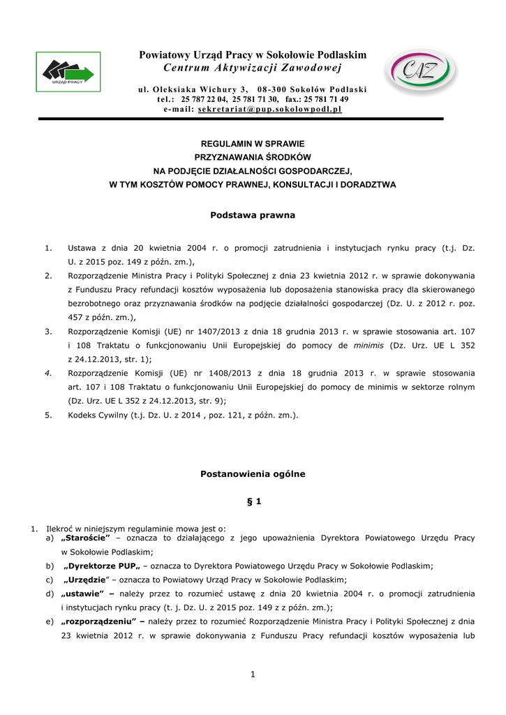 Powiatowy Urząd Pracy w Sokołowie Podlaskim Centrum Aktywiza cji Zawod owej ul. O le ks ia ka Wi ch ury 3 , 0 8 - 3 0 0 So ko łó w Po dla s ki t el.: 25 787 22 04, 25 781 71 30, fax.: 25 781 71 49 e- ma il: se kr eta r ia t @p u p. so ko lo w po dl. p l REGULAMIN W SPRAWIE PRZYZNAWANIA ŚRODKÓW NA PODJĘCIE DZIAŁALNOŚCI GOSPODARCZEJ, W TYM KOSZTÓW POMOCY PRAWNEJ, KONSULTACJI I DORADZTWA Podstawa prawna 1. Ustawa z dnia 20 kwietnia 2004 r. o promocji zatrudnienia i instytucjach rynku pracy (t.j. Dz. U. z 2015 poz. 149 z późn. zm.), 2. Rozporządzenie Ministra Pracy i Polityki Społecznej z dnia 23 kwietnia 2012 r. w sprawie dokonywania z Funduszu Pracy refundacji kosztów wyposażenia lub doposażenia stanowiska pracy dla skierowanego bezrobotnego oraz przyznawania środków na podjęcie działalności gospodarczej (Dz. U. z 2012 r. poz. 457 z późn. zm.), 3. Rozporządzenie Komisji (UE) nr 1407/2013 z dnia 18 grudnia 2013 r. w sprawie stosowania art. 107 i 108 Traktatu o funkcjonowaniu Unii Europejskiej do pomocy de minimis (Dz. Urz. UE L 352 z 24.12.2013, str. 1); 4. Rozporządzenie Komisji (UE) nr 1408/2013 z dnia 18 grudnia 2013 r. w sprawie stosowania art. 107 i 108 Traktatu o funkcjonowaniu Unii Europejskiej do pomocy de minimis w sektorze rolnym (Dz. Urz. UE L 352 z 24.12.2013, str. 9); 5. Kodeks Cywilny (t.j. Dz. U. z 2014 , poz. 121, z późn. zm.). Postanowienia ogólne §1 1. Ilekroć w niniejszym regulaminie mowa jest o: a) „Staroście” – oznacza to działającego z jego upoważnienia Dyrektora Powiatowego Urzędu Pracy w Sokołowie Podlaskim; b) „Dyrektorze PUP„ – oznacza to Dyrektora Powiatowego Urzędu Pracy w Sokołowie Podlaskim; c) „Urzędzie” – oznacza to Powiatowy Urząd Pracy w Sokołowie Podlaskim; d) „ustawie” – należy przez to rozumieć ustawę z dnia 20 kwietnia 2004 r. o promocji zatrudnienia i instytucjach rynku pracy (t. j. Dz. U. z 2015 poz. 149 z z późn. zm.); e) „rozporządzeniu” – należy przez to rozumieć Rozporządzenie Ministra Pracy i Polityki Społecznej z dnia 23 kwietnia 2012 r. w sprawie dokonywania z Funduszu Pracy refundacji kosztów wyposażenia lub 1 doposażenia stanowiska pracy dla skierowanego bezrobotnego oraz przyznawania środków na podjęcie działalności gospodarczej (Dz. U. z 2012 r. poz. 457 z późn. zm.), f) „pomocy de minimis” - oznacza to wsparcie państwa udzielane przedsiębiorcom lub osobom fizycznym, które nie wymaga notyfikacji Komisji Europejskiej. Jest to pomoc publiczna, w ramach której przyjęto założenie, że ze względu na swoją wartość ma ona nieznaczny wpływ na konkurencję oraz wymianę handlową między państwami członkowskimi; g) „bezrobotnym” – oznacza osobę spełniającą przesłanki wynikające z art. 2 ust. 1 pkt 1 ustawy oraz dla której Urząd ustalił profil pomocy I lub II na podstawie art. 33 ust. 2 b i 2c ustawy; h) „absolwencie centrum integracji społecznej” – dalej zwanym absolwentem CIS, oznacza to osobę, która przez okres nie krótszy niż 6 miesięcy uczestniczyła w zajęciach w centrum integracji społecznej i otrzymała zaświadczenie wydane przez kierownika Centrum, potwierdzające uczestnictwo w zajęciach i umiejętności nabyte w ramach reintegracji zawodowej i społecznej; osoba ta jest absolwentem centrum integracji społecznej przez okres 6 miesięcy od dnia zakończenia zajęć w centrum integracji społecznej (Dz. U. z 2011 r. nr 43, poz. 225 i nr 205, poz.1211); i) „absolwencie klubu integracji społecznej” – oznacza to osobę, która uczestniczyła w klubie integracji społecznej przez okres nie krótszy niż 6 miesięcy, posiada ważne zaświadczenie wydane przez podmiot prowadzący klub integracji społecznej, nie później jednak niż 2 miesiące od daty zakończenia zajęć w klubie integracji społecznej oraz zrealizowała postanowienia kontraktu socjalnego. Zaświadczenie wydawane jest na wniosek osoby, która uczestniczyła w klubie integracji społecznej i zachowuje ważność w terminie 4 miesięcy od daty wystawienia (Dz.U. z 2011 r. nr 43, poz. 225 i nr 205, poz.1211); j) "przeciętnym wynagrodzeniu" – oznacza to przeciętne wynagrodzenie w poprzednim kwartale, od pierwszego dnia następnego miesiąca po ogłoszeniu przez Prezesa Głównego Urzędu Statystycznego w Dzienniku Urzędowym Rzeczypospolitej Polskiej "Monitor Polski" na podstawie art. 20 pkt 2 ustawy z dnia 17 grudnia 1998 r. o emeryturach i rentach z Funduszu Ubezpieczeń Społecznych (t.j. Dz.U. z 2013 r. poz. 1440 z późn. zm.). 2. Zgodnie z art. 46 ust.1 ustawy oraz rozporządzeniem Starosta ze środków Funduszu Pracy może przyznać bezrobotnemu jednorazowe środki na podjęcie działalności gospodarczej, w tym na pokrycie kosztów pomocy prawnej, konsultacji i doradztwa związanego z podjęciem tej działalności, w wysokości określonej w umowie, nie wyższej jednak niż 6-krotność przeciętnego wynagrodzenia. 3. Wysokość przeciętnego wynagrodzenia, jest przyjmowana na dzień zawarcia umowy z bezrobotnym. 4. Osoba, która otrzymała z Funduszu Pracy jednorazowo środki na podjęcie działalności gospodarczej, jest obowiązana dokonać zwrotu otrzymanych środków wraz z odsetkami, jeżeli prowadziła działalność gospodarczą przez okres krótszy niż 12 miesięcy albo naruszone zostały inne warunki umowy dotyczące przyznania tych środków. 2 Warunki przyznawania bezrobotnemu, absolwentowi CIS i absolwentowi KIS środków na podjęcie działalności gospodarczej, w tym na pokrycie kosztów pomocy prawnej, konsultacji i doradztwa związanych z podjęciem tej działalności §2 1. O jednorazowe środki na podjęcie działalności gospodarczej może się ubiegać: bezrobotny, absolwent CIS lub absolwent KIS, który spełnia następujące warunki: a) nie otrzymał bezzwrotnych środków Funduszu Pracy lub innych bezzwrotnych środków publicznych na podjęcie działalności gospodarczej lub rolniczej, założenie l