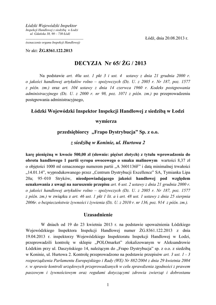 Łódzki Wojewódzki Inspektor Inspekcji Handlowej z siedzibą w Łodzi ul. Gdańska 38, 90 – 730 Łódź Łódź, dnia 20.08.2013 r. ..................................................... (oznaczenie organu Inspekcji Handlowej) Nr akt: ŻG.8361.122.2013 DECYZJA Nr 65/ ŻG / 2013 Na podstawie art. 40a ust. 1 pkt 3 i ust. 4 ustawy z dnia 21 grudnia 2000 r. o jakości handlowej artykułów rolno – spożywczych (Dz. U. z 2005 r. Nr 187, poz. 1577 z późn. zm.) oraz art. 104 ustawy z dnia 14 czerwca 1960 r. Kodeks postępowania administracyjnego (Dz. U. z 2000 r. nr 98, poz. 1071 z późn. zm.) po przeprowadzeniu postępowania administracyjnego, Łódzki Wojewódzki Inspektor Inspekcji Handlowej z siedzibą w Łodzi wymierza przedsiębiorcy „Frapo Dystrybucja” Sp. z o.o. z siedzibą w Koninie, ul. Hurtowa 2 karę pieniężną w kwocie 500,00 zł (słownie: pięćset złotych) z tytułu wprowadzenia do obrotu handlowego 1 partii syropu owocowego o smaku malinowym wartości 8,37 zł o objętości 1000 ml oznaczonego numerem partii „A 3601136F” i datą minimalnej trwałości „14.01.14”, wyprodukowanego przez „Centrum Dystrybucji Excellence” SA, Tymianka Lipa 20a; 95–010 Stryków, nieodpowiadającego jakości handlowej pod względem oznakowania z uwagi na naruszenie przepisu art. 6 ust. 2 ustawy z dnia 21 grudnia 2000 r. o jakości handlowej artykułów rolno – spożywczych (Dz. U. z 2005 r. Nr 187, poz. 1577 z późn. zm.) w związku z art. 46 ust. 1 pkt 1 lit. a i art. 48 ust. 1 ustawy z dnia 25 sierpnia 2006r. o bezpieczeństwie żywności i żywienia (Dz. U. z 2010 r. nr 136, poz. 914 z późn. zm.). Uzasadnienie W dniach od 19 do 23 kwietnia 2013 r. na podstawie upoważnienia Łódzkiego Wojewódzkiego Inspektora Inspekcji Handlowej numer ŻG.8361.122.2013 z dnia 19.04.2013 r. inspektorzy Wojewódzkiego Inspektoratu Inspekcji Handlowej w Łodzi, przeprowadzili kontrolę w sklepie „POLOmarket” zlokalizowanym w Aleksandrowie Łódzkim przy ul. Daszyńskiego 14, należącym do „Frapo Dystrybucja” sp. z o.o. z siedzibą w Koninie, ul. Hurtowa 2. Kontrolę przeprowadzono na podstawie przepisów art. 3 ust. 1 - 3 rozporządzenia Parlamentu Europejskiego i Rady (WE) Nr 882/2004 z dnia 29 kwietnia 2004 r. w sprawie kontroli urzędowych przeprowadzanych w celu sprawdzenia zgodności z prawem paszowym i żywnościowym oraz regułami dotyczącymi zdrowia zwierząt i dobrostanu 1 zwierząt (Dz. U. L 165 z 30.4.2004 ze zm.), art. 17 ust. 3 ustawy z dnia 21 grudnia 2000 r. o jakości handlowej artykułów rolno-spożywczych (Dz. U. z 2005 r. nr 187, poz. 1577, z późn. zm.) w związku z art. 3 ust. 1 pkt 1, 2 i 6 ustawy z dnia 15 grudnia 2000 r. o Inspekcji Handlowej (Dz. U. z 2009 r. Nr 151, poz. 1219 z późn. zm.) w obecności osoby upoważnionej kierownika sklepu (…). W trakcie prowadzonych działań kontrolnych stwierdzono, że do sprzedaży oferowano 3 opakowania syropu owocowego o smaku malinowym o objętości 1000 ml oznaczonego numerem partii „A 3601136F” i datą minimalnej trwałości „14.01.14”, wyprodukowanego przez „Centrum Dystrybucji Excellence” SA, Tymianka Lipa 20a; 95 – 010 Stryków w cenie 2,79 zł. W wyniku oględzin opakowań jednostkowych przedmiotowego produktu stwierdzono, że w jego oznakowaniu zastosowano podwójne, niespójne nazewnictwo. Z boku opakowania umieszczono nazwę rodzajową „syrop owocowy o smaku malinowym”, zaś z przodu opakowania, znacznie większą czcionką, umieszczono nazwę handlową „syrop polski malinowy”. Z zamieszczonego na opakowaniu składu wynikało, iż przedmiotowy syrop został wyprodukowany m.in. z soku malinowego (19%) odtworzonego z zagęszczonego soku, zagęszczonego soku aroniowego, ekstraktu z czerwonych winogron. Biorąc powyższe pod uwagę należy stwierdzić, że zastosowana nazwa handlowa (wyeksponowana w głównym polu widzenia opakowania) była bezzasadna i myląca co do nazwy, rodzaju i właściwości produktu i mogła wprowadzać konsumenta w błąd, zaś zastosowane podwójne nazewnictwo (mówiące o różnych właściwościach produktu) powodowało, że środek ten oznakowany był w sposób niezrozumiały dla konsumenta. Z nazwy handlowej wynikało, że syrop został wyprodukowany tylko na bazie soku malinowego, natomiast nazwa rodzajowa i zamieszczony wykaz składników dowodzą, że produkt oprócz soku malinowego zawierał również sok aroniowy i ekstrakt winogronowy, które również miały wpływ na jego właściwości, zatem wprowadzony do obrotu syrop nie spełniał wymagań jakości handlowej z uwagi na naruszenie przepisu art. 6 ust. 2 ustawy z dnia 21 grudnia 2000 r. o jakości handlowej artykułów rolno – spożywczych (Dz. U. z 2005 r. Nr 187, poz. 1577 z późn. zm.) zwanej dalej „ustawa o jakości” w związku z art. 46 ust. 1 pkt 1 lit. a i art. 48 ust. 1 ustawy z dnia 25 sierpnia 2006 r. o bezpieczeństwie żywności i żywienia (Dz. U. z 2010 r. nr 136, poz. 914 z późn. zm.) zwanej dalej „ ustawą o bezpieczeństwie żywności i żywienia”. Powyższe nieprawidłowości zostały udokumentowane w protokóle kontroli numer ŻG.8361.122.2013 oraz na zdjęciach wykonanych w toku kontroli. W związku z powyższym w dniu 23 lipca 2013 r. zostało wszczęte z urzędu postępowanie administracyjne w przedmiocie wymierzenia, na podstawie art. 40a ust. 1 pkt 3 ustawy o jakości, kary pieniężnej z tytułu wprowadzenia do obrotu środka spożywczego nieodpowiadającego jakości handlowej. Strona została poinformowana o wszczęciu postępowania z urzędu oraz o przysługującym prawie do zapoznania się z aktami sprawy, wypowiedzenia się co do zebranych dowodów i materiałów, lecz z tego prawa nie skorzystała. Jednocześnie poproszono stronę o przesłanie informacji na temat wielkości 2 obrotu za rok 2012. Przedmiotowe pismo zostało odebrane przez stronę w dniu 29 lipca 2013r. W dniu 14 sierpnia 2013 r. do Wojewódzkiego Inspektoratu Inspekcji Handlo