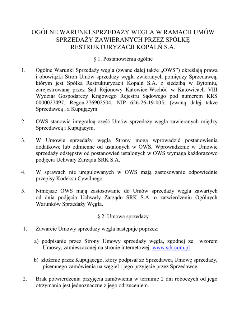 OGÓLNE WARUNKI SPRZEDAŻY WĘGLA W RAMACH UMÓW SPRZEDAŻY ZAWIERANYCH PRZEZ SPÓŁKĘ RESTRUKTURYZACJI KOPALŃ S.A. § 1. Postanowienia ogólne 1. Ogólne Warunki Sprzedaży węgla (zwane dalej także „OWS”) określają̨ prawa i obowiązki Stron Umów sprzedaży węgla zwieranych pomiędzy Sprzedawcą, którym jest Spółka Restrukturyzacji Kopalń S.A. z siedzibą w Bytomiu, zarejestrowaną przez Sąd Rejonowy Katowice-Wschód w Katowicach VIII Wydział Gospodarczy Krajowego Rejestru Sądowego pod numerem KRS 0000027497, Regon 276902504, NIP 626-26-19-005, (zwaną dalej także Sprzedawcą , a Kupującym. 2. OWS stanowią̨ integralną część Umów sprzedaży węgla zawieranych między Sprzedawcą i Kupującym. 3. W Umowie sprzedaży węgla Strony mogą̨ wprowadzić postanowienia dodatkowe lub odmienne od ustalonych w OWS. Wprowadzenie w Umowie sprzedaży odstępstw od postanowień ustalonych w OWS wymaga każdorazowo podjęcia Uchwały Zarządu SRK S.A. 4. W sprawach nie uregulowanych w OWS mają zastosowanie odpowiednie przepisy Kodeksu Cywilnego. 5. Niniejsze OWS mają zastosowanie do Umów sprzedaży węgla zawartych od dnia podjęcia Uchwały Zarządu SRK S.A. o zatwierdzeniu Ogólnych Warunków Sprzedaży Węgla. § 2. Umowa sprzedaży 1. Zawarcie Umowy sprzedaży węgla następuje poprzez: a) podpisanie przez Strony Umowy sprzedaży węgla, zgodnej ze Umowy, zamieszczonej na stronie internetowej: www.srk.com.pl wzorem b) złożenie przez Kupującego, który podpisał ze Sprzedawcą Umowę̨ sprzedaży, pisemnego zamówienia na węgiel i jego przyjęcie przez Sprzedawcę. 2. Brak potwierdzenia przyjęcia zamówienia w terminie 2 dni roboczych od jego otrzymania jest jednoznaczne z jego odrzuceniem. 3. Zawarcie Umowy sprzedaży węgla rodzi po stronie Kupującego zobowiązanie do dokonania przedpłaty zgodnie z § 4 poniżej. Dokonanie przez Kupującego przedpłaty rodzi po stronie Sprzedawcy zobowiązanie do wydania zamówionej ilości węgla. 4. Sprzedawca zastrzega sobie prawo do odmowy przyjęcia zamówienia na węgiel, jeżeli Kupujący nie zamieścił w zamówieniu wszystkich niezbędnych danych lub wypełnił je w sposób uniemożliwiający prawidłową realizację wysyłki lub zamówienie nie może być zrealizowane z innych przyczyn leżących po stronie Kupującego. § 3. Cena 1. Cena węgla określona jest na warunkach FCA zakład górniczy Sprzedawcy (KWK „Makoszowy” w Zabrzu Makoszowach) i obejmuje koszt węgla, załadunku, ważenia oraz koszt wystawienia dokumentów przewozowych. 2. Sprzedaż węgla realizowana jest na podstawie cennika obowiązującego u Sprzedawcy. 3. Sprzedawca zastrzega sobie prawo do wprowadzenia zmian w cenniku węgla, uwzględniających między innymi sezonowość popytu na węgiel. Zmiana cen wymaga zawarcia aneksu do Umowy. 4. Cena węgla jest ceną netto, do której zostanie doliczony podatek od towarów i usług (VAT) oraz, jeżeli będą̨ tego wymagać obowiązujące w dniu sprzedaży przepisy prawa, podatek akcyzowy. § 4. Warunki płatności 1. Warunkiem wydania węgla jest dokonanie przez Kupującego przedpłaty w formie przelewu, na konto bankowe wskazane przez Sprzedawcę, w wysokości odpowiadającej 100% wartości brutto zamówionej i przyjętej przez Sprzedawcę ilości węgla. 2. Przedpłata musi wpłynąć na konto bankowe Sprzedawcy nie później niż na 2 dni robocze przed planowanym terminem wydania węgla. Brak przedpłaty w wyżej wymienionym terminie powoduje anulowanie zamówienia z winy Kupującego, zobowiązanie do wydania węgla wygasa, a Sprzedawcy przysługuje prawo do odstąpienia od Umowy sprzedaży węgla. 3. Po otrzymaniu przedpłaty Sprzedawca wystawi fakturę zaliczkową na wartość dokonanej przedpłaty na poczet zakupu węgla, następnie po wysyłce węgla zostanie sporządzony dowód dostawy na każdą partię węgla wydaną Kupującemu oraz zostaną wystawione faktury rozliczające. 4. Faktura i dowód dostawy zawierają informacje o sortymencie węgla, parametrach jakościowych, cenie węgla odpowiadającej tym parametrom, tonażu i wartości dostawy, nazwie Kopalni wysyłającej węgiel, numerze dokumentu przewozowego danej partii węgla. 5. Do wartości węgla wyliczonej z tonażu i ceny węgla podanej na fakturze Sprzedawca doliczy podatek od towarów i usług (VAT) według stawki obowiązującej w okresie realizacji Umowy. 6. Faktury korygujące dotyczące zwrotu niewykorzystanej przedpłaty będą wystawiane w okresach rocznych, bądź niezwłocznie po otrzymaniu od Kupującego pisma o sposobie rozliczenia wniesionej przedpłaty. 7. Przedpłaty wraz ze wskazaniem tytułu płatności winny być dokonywane przez Kupującego na konto bankowe Sprzedawcy: ING Bank Śląski S.A. 45 1050 1230 1000 0024 1350 2739 § 5. Obowiązki Sprzedawcy 1. Sprzedawca zobowiązuje się̨ do sprzedaży węgla w ilości, jakości, sortymencie i w terminach uzgodnionych z Kupującym. 2. Sprzedawca zobowiązany jest do: a) prowadzenia na swój koszt wysyłki, czyli załadunku węgla na podstawiony przez Kupującego środek transportu, b) wystawiania na swój koszt dokumentów przewozowych, zgodnych z zamówieniem Kupującego przyjętym przez Sprzedawcę̨, c) wystawiania certyfikatu jakości węgla na żądanie Kupującego, d) wystawienia na swój koszt dokumentu „Dokument dostawy”, e) przeniesienia na Kupującego własności wydawanego węgla, wolnego od jakichkolwiek obciążeń lub innego prawa osoby trzeciej, w miejscu sprzedaży z chwilą załadunku tego węgla na podstawiony przez Kupującego środek transportu. 3. W okresie zimowym, gdy występują̨ temperatury otoczenia zbliżone do zera i ujemne, Sprzedawca zobowiązuje się̨ na swój koszt, bez dodatkowego wezwania, stosować skuteczne środki przeciwko przymarzaniu węgla do ścian i podłóg w przypadku transportu wagonowego. 4. Zasady reklamacji jakościowych i ilościowych w Spółce Restrukturyzacji Kopalń S.A. są dostępne na stronie: www.