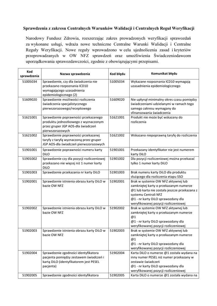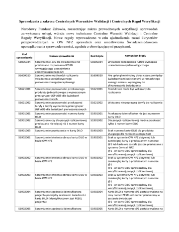 Sprawdzenia z zakresu Centralnych Warunków Walidacji i Centralnych Reguł Weryfikacji Narodowy Fundusz Zdrowia, rozszerzając zakres prowadzonych weryfikacji sprawozdań za wykonane usługi, wdraża nowe techniczne Centralne Warunki Walidacji i Centralne Reguły Weryfikacji. Nowe reguły wprowadzono w celu ujednolicenia zasad i kryteriów przeprowadzanych w OW NFZ sprawdzeń oraz umożliwienia Świadczeniodawcom uporządkowania sprawozdawczości, zgodnie z obowiązującymi przepisami. Kod sprawdzenia 51005034 Nazwa sprawdzenia Kod błędu Komunikat błędu Sprawdzenie, czy dla świadczenia nie przekazano rozpoznania ICD10 wymagającego uzasadnienia epidemiologicznego (2) Sprawdzenie możliwości rozliczenia świadczenia specjalistycznego pierwszorazowego/receptowego 51005034 Wykazane rozpoznania ICD10 wymagają uzasadnienia epidemiologicznego 51609020 Sprawdzenie poprawności przekazanego produktu jednostkowego z wyznaczonym przez gruper JGP AOS-dla świadczeń pierwszorazowych Sprawdzenie poprawności przekazanej taryfy z taryfą wyznaczoną przez gruper JGP AOS-dla świadczeń pierwszorazowych 51621001 Nie upłynął minimalny okres czasu pomiędzy świadczeniami udzielanymi w ramach tego samego zakresu wymagany do sfinansowania świadczenia Produkt nie może być wskazany do rozliczenia 51621002 Wskazano niepoprawną taryfę do rozliczenia Sprawdzenie poprawności numeru karty DiLO Sprawdzenie czy dla pozycji rozliczeniowej przekazano nie więcej niż 1 numer karty DiLO Sprawdzenie przekazania nr karty DiLO 51901001 Przekazany identyfikator nie jest numerem karty DiLO Dla pozycji rozliczeniowej można przekazać tylko 1 numer karty DiLO 51902001 Sprawdzenie istnienia obrazu karty DiLO w bazie OW NFZ 51902001 51902002 Sprawdzenie istnienia obrazu karty DiLO w bazie OW NFZ 51902002 51902003 Sprawdzenie istnienia obrazu karty DiLO w bazie OW NFZ 51902003 51902004 Sprawdzenie zgodności identyfikatora pacjenta pomiędzy zestawem świadczeń i kartą DiLO (identyfikatorem jest PESEL pacjenta) 51902004 51902005 Sprawdzenie zgodności identyfikatora 51902005 51609020 51621001 51621002 51901001 51901002 51901003 51901002 51901003 Brak numeru karty DiLO dla produktu służącego dla rozliczenia etapu SSO Brak w systemie OW NFZ aktywnej lub zamkniętej karty o przekazanym numerze @1 lub karta nie została jeszcze przekazana z systemu Centrali NFZ @1 - nr karty DiLO sprawozdany dla weryfikowanej pozycji rozliczeniowej Brak w systemie OW NFZ aktywnej lub zamkniętej karty o przekazanym numerze @1 @1 - nr karty DiLO sprawozdany dla weryfikowanej pozycji rozliczeniowej Brak w systemie OW NFZ aktywnej lub zamkniętej karty o przekazanym numerze @1 @1 - nr karty DiLO sprawozdany dla weryfikowanej pozycji rozliczeniowej Karta DiLO o numerze @1 została wydana na inny numer PESEL niż numer przekazany w zestawie świadczeń @1 - nr karty DiLO sprawozdany dla weryfikowanej pozycji rozliczeniowej Karta DiLO o numerze @1 została wydana na pacjenta pomiędzy zestawem świadczeń i kartą DiLO (identyfikatorem NIE jest PESEL pacjenta) 51903001 Sprawdzenie zgodności kodu świadczeniodawcy wydającego kartę DiLO w POZ 51903001 51903002 Sprawdzenie miejsca wydania karty DiLO rozliczanej produktem wydania karty w POZ 51903002 51903003 Sprawdzenie zgodności numeru umowy w 51903003 ramach której została wydana karta DiLO w POZ 51903004 Sprawdzenie zgodności kodu technicznego miejsca w ramach której została wydana kartę DiLO w POZ 51903004 51903005 Sprawdzenie czy personel realizujący sprawozdany do rozliczenia wydania karty DiLO w POZ jest lekarzem 51903005 51903006 Sprawdzenie zgodności numeru prawa wykonywania zawodu lekarza wystawiającego kartę DiLO w POZ 51903006 51903007 Sprawdzenie czy data wydania karty zawiera się w datach porady poz 51903007 51903008 Sprawdzenie czy data wydania karty jest równa dacie końca weryfikowanej pozycji rozliczeniowej 51903008 51903011 Sprawdzenie czy nie nastąpiła próba podwójnego rozliczenia produktu wydania karty w POZ 51903011 51904001 Sprawdzenie czy karta DiLO została wydana 51904001 w POZ 51904002 Sprawdzenie czy karta DiLO posiada zakończony etap diagnostyki wstępnej zrealizowany przez świadczeniodawcę, który rozlicza pozycję 51904002 51904003 Sprawdzenie zgodności numeru umowy w ramach której następuje rozliczenie 51904003 inny numer PESEL niż numer przekazany w zestawie świadczeń @1 - nr karty DiLO sprawozdany dla weryfikowanej pozycji rozliczeniowej Wskazana karta DiLO o numerze @1 została wydana w POZ w ramach innego świadczeniodawcy. @1 - nr karty DiLO sprawozdany dla weryfikowanej pozycji rozliczeniowej Wskazana karta DiLO o numerze @1 nie została wydana w POZ. @1 - nr karty DiLO sprawozdany dla weryfikowanej pozycji rozliczeniowej Wskazana karta DiLO o numerze @1 została wydana w POZ w ramach innej umowy. @1 - nr karty DiLO sprawozdany dla weryfikowanej pozycji rozliczeniowej Wskazana karta DiLO o numerze @1 została wydana w POZ w ramach innej komórki organizacyjnej. @1 - nr karty DiLO sprawozdany dla weryfikowanej pozycji rozliczeniowej Realizacja wydania karty DiLO o numerze @1 w POZ przez osobę nie będącą lekarzem @1 - nr karty DiLO sprawozdany dla weryfikowanej pozycji rozliczeniowej Wskazana karta DiLO o numerze @1 została wydana w POZ przez lekarza o innym NPWZ. @1 - nr karty DiLO sprawozdany dla weryfikowanej pozycji rozliczeniowej Data wydania karty DiLO o numerze @1 w POZ nie zwiera się w datach wizyty. @1 - nr karty DiLO sprawozdany dla weryfikowanej pozycji rozliczeniowej Data wydania karty DiLO o numerze @1 w POZ jest różna od daty zakończenia produktu rozliczającego to wydanie @1 - nr karty DiLO sprawozdany dla weryfikowanej pozycji rozliczeniowej W bazie danych OW NFZ istnieje więcej niż 1 aktywna pozycja rozliczeniowa dla wydania karty DiLO o numerze @1 w ramach POZ. @1 - nr karty DiLO sprawozdany dla weryfikowanej pozycji rozliczeniowej Karta DiLO o nr @1 nie została wydana w POZ @1 - nr karty D