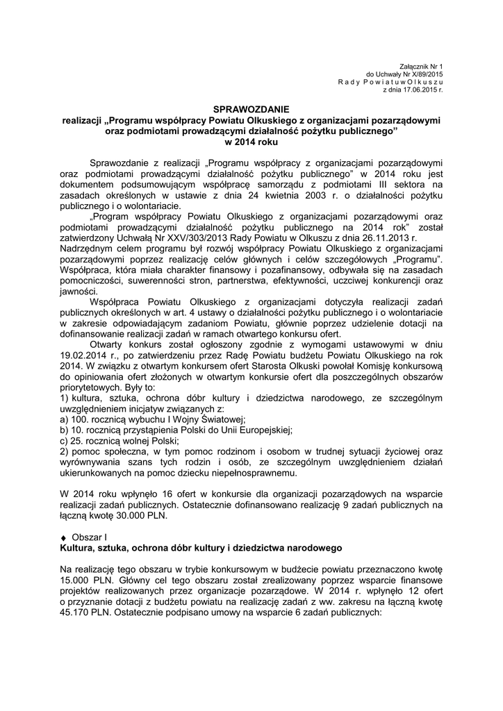 Załącznik Nr 1 do Uchwały Nr X/89/2015 Rady PowiatuwOlkuszu z dnia 17.06.2015 r. SPRAWOZDANIE realizacji „Programu współpracy Powiatu Olkuskiego z organizacjami pozarządowymi oraz podmiotami prowadzącymi działalność pożytku publicznego” w 2014 roku Sprawozdanie z realizacji „Programu współpracy z organizacjami pozarządowymi oraz podmiotami prowadzącymi działalność pożytku publicznego” w 2014 roku jest dokumentem podsumowującym współpracę samorządu z podmiotami III sektora na zasadach określonych w ustawie z dnia 24 kwietnia 2003 r. o działalności pożytku publicznego i o wolontariacie. „Program współpracy Powiatu Olkuskiego z organizacjami pozarządowymi oraz podmiotami prowadzącymi działalność pożytku publicznego na 2014 rok” został zatwierdzony Uchwałą Nr XXV/303/2013 Rady Powiatu w Olkuszu z dnia 26.11.2013 r. Nadrzędnym celem programu był rozwój współpracy Powiatu Olkuskiego z organizacjami pozarządowymi poprzez realizację celów głównych i celów szczegółowych „Programu”. Współpraca, która miała charakter finansowy i pozafinansowy, odbywała się na zasadach pomocniczości, suwerenności stron, partnerstwa, efektywności, uczciwej konkurencji oraz jawności. Współpraca Powiatu Olkuskiego z organizacjami dotyczyła realizacji zadań publicznych określonych w art. 4 ustawy o działalności pożytku publicznego i o wolontariacie w zakresie odpowiadającym zadaniom Powiatu, głównie poprzez udzielenie dotacji na dofinansowanie realizacji zadań w ramach otwartego konkursu ofert. Otwarty konkurs został ogłoszony zgodnie z wymogami ustawowymi w dniu 19.02.2014 r., po zatwierdzeniu przez Radę Powiatu budżetu Powiatu Olkuskiego na rok 2014. W związku z otwartym konkursem ofert Starosta Olkuski powołał Komisję konkursową do opiniowania ofert złożonych w otwartym konkursie ofert dla poszczególnych obszarów priorytetowych. Były to: 1) kultura, sztuka, ochrona dóbr kultury i dziedzictwa narodowego, ze szczególnym uwzględnieniem inicjatyw związanych z: a) 100. rocznicą wybuchu I Wojny Światowej; b) 10. rocznicą przystąpienia Polski do Unii Europejskiej; c) 25. rocznicą wolnej Polski; 2) pomoc społeczna, w tym pomoc rodzinom i osobom w trudnej sytuacji życiowej oraz wyrównywania szans tych rodzin i osób, ze szczególnym uwzględnieniem działań ukierunkowanych na pomoc dziecku niepełnosprawnemu. W 2014 roku wpłynęło 16 ofert w konkursie dla organizacji pozarządowych na wsparcie realizacji zadań publicznych. Ostatecznie dofinansowano realizację 9 zadań publicznych na łączną kwotę 30.000 PLN. Obszar I Kultura, sztuka, ochrona dóbr kultury i dziedzictwa narodowego Na realizację tego obszaru w trybie konkursowym w budżecie powiatu przeznaczono kwotę 15.000 PLN. Główny cel tego obszaru został zrealizowany poprzez wsparcie finansowe projektów realizowanych przez organizacje pozarządowe. W 2014 r. wpłynęło 12 ofert o przyznanie dotacji z budżetu powiatu na realizację zadań z ww. zakresu na łączną kwotę 45.170 PLN. Ostatecznie podpisano umowy na wsparcie 6 zadań publicznych: 1. Stowarzyszenie Olkuska Grupa Turystyczna AMONIT Nazwa zadania: „1914 – Wielka Wojna na Ziemi Olkuskiej” Dotacja w wysokości: 2.200 PLN 2. Ochotnicza Straż Pożarna w Krzywopłotach Nazwa zadania: „III Piknik historyczny – Jura 1914 w Krzywopłotach” Dotacja w wysokości: 3.800 PLN 3. Stowarzyszenie „Złota Arka” nauczycieli i Absolwentów I LO w Olkuszu Nazwa zadania: „Zeszyty historyczne Olkusza nr 18 – jako element integracyjny wszystkich szkół średnich w Olkuszu ze społecznością Ziemi Olkuskiej” Dotacja w wysokości: 2.500 PLN 4. Ochotnicza Straż Pożarna w Rodakach Nazwa zadania: „Wojciech Kossak na szlaku I Wojny Światowej” Dotacja w wysokości: 2.300 PLN 5. Stowarzyszenie „Zamek Rabsztyn” Nazwa zadania: „Powiatowy plener plastyczny – Zamek Rabsztyn – historia, przyroda i Unia Europejska” Dotacja w wysokości: 2.100 PLN 6. Ochotnicza Straż Pożarna w Olkuszu Nazwa zadania: „Wydanie książki „Olkusz i ziemia olkuska podczas I wojny światowej w pamiętnikach Jana Jarno” Dotacja w wysokości: 2.100 PLN Łączna kwota przyznanych dotacji w tym obszarze – 15.000 PLN Obszar II Pomoc społeczna, w tym pomoc rodzinom i osobom w trudnej sytuacji życiowej oraz wyrównywania szans tych rodzin i osób Na realizację tego obszaru w trybie konkursowym powiat przeznaczył kwotę 15.000 PLN. W konkursie, na realizację zadań w tym obszarze wpłynęły 4 oferty na łączną kwotę 28.345 PLN. Ostatecznie zrealizowano 3 następujące zadania publiczne: 1. Polskie Stowarzyszenie na rzecz osób z upośledzeniem umysłowym Koło w Olkuszu Nazwa zadania: „Rehabilitacja drogą do sprawności” Dotacja w wysokości: 1.500 PLN 2. Stowarzyszenie Dobroczynne RES SACRA MISER w Olkuszu Nazwa zadania: „Dać szansę – terapia i rehabilitacja małego dziecka niepełnosprawnego oraz wsparcie jego rodziny wzmocnieniem i sposobem na wyrównywanie szans i integracje z otoczeniem” Dotacja w wysokości: 9.000 PLN 3. Stowarzyszenie „Pro Psyche” na rzecz zdrowia psychicznego Nazwa zadania: „Poprawa wydolności wychowawczej rodzin, dzieci z niepełnosprawnością psychiczną, które są pod opieką instytucji pomocowych” Dotacja w wysokości: 4.500 PLN Łączna kwota przyznanych dotacji w tym obszarze – 15.000 PLN Suma wnioskowanych kwot dotacji w 2014 r. łącznie to: 73.515 PLN, w tym: Kultura, sztuka, ochrona dóbr kultury i Pomoc społeczna, w tym pomoc dziedzictwa narodowego rodzinom i osobom w trudnej sytuacji życiowej oraz wyrównywania szans tych rodzin i osób 45.170 PLN 28.345 Środki finansowe zabezpieczone w budżecie Powiatu Olkuskiego na 2014 r. z przeznaczeniem na dotacje celowe przekazywane organizacjom pozarządowym w trybie otwartego konkursu ofert – 30.000 PLN, w tym: Kultura, sztuka, ochrona dóbr kultury i Pomoc społeczna, w tym pomo