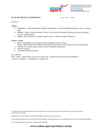 RADSAS SPORT Radosław Sąsiadek ul. Pilotów 19F/8, 80-460 Gdańsk NIP: 744-155-64-05 www.radsas-sport.pl tel. 513-726-102; 510-073-356 ŚLADAMI MIKOŁAJA KOPERNIKA cena: 200 zł / osoba Program: 1 Dzień Frombork - zwiedzanie Katedry Kapituły Warmińskiej z Muzeum Mikołaja Kopernika, seans w planetarium, Olsztyn - Zamek i Muzeum Warmii i Mazur, Dom Gazety Olsztyńskiej, Muzeum Przyrody, Amfiteatr w fosie, Wysoka Brama, Toruń - nocą (Fontanna Cosmopolis, Baj Pomorski - starówka, Punkt Widokowy), 2 Dzień - Toruń Bulwar Filadelfijski, mury miejskie, Brama Żeglarska, Krzywa Wieża, Ratusz, Aleja Gmerków, Piernikowa aleja gwiazd, aleja Herbów Miast Hanzeatyckich i Handlowych, Katedra św.św. Janów (gdzie odbył się chrzest Mikołaja Kopernika), Zamek krzyżacki, zwiedzanie Domu Kopernika, Cena zawiera: bilety wstępu - opiekę pilota wycieczki na całej trasie - usługi licencjonowanych przewodników – 1 nocleg, 1 śniadanie, 1 obiadokolacja - podatek VAT * Ceny imprez nie zawierają kosztów transportu, gdyż jest on uzależniony od liczby uczestników oraz miejsca rozpoczęcia i zakończenia wycieczki. *Realizujemy również imprezy z transportem organizowanym przez zleceniodawcę. *Ceny zostały skalkulowane dla około 38 osób. Poszczególne ceny obejmują koszt wyszczególnionych świadczeń na jednego uczestnika. * Na 15 płatnych osób uczestnictwo 1 opiekuna jest bezpłatne. www.radsas-sport.pl/zielone-szkoly