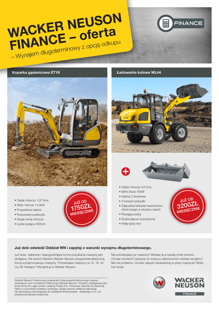 N O S U E N R E K a t r WAC e f o – E C kupu d N o ją A c p o FINjem długoterminowy z FINANCE – Wyna Koparka gąsienicowa ET18 Ładowarka kołowa WL44 • Ciężar roboczy 4,6 tony • Silnik Deutz 45kW • Kabina 2 drzwiowa • Ciężar roboczy 1,97 tony • Silnik Yanmar 13,4kW • Przeszklona kabina • Rozsuwane podwozie D JUŻ O 175IĘ0CZZNŁIE MIES • 3 funkcja hydrauliki • Załączalna blokada mechanizmu różnicowego w obydwu osiach • Pływająca łyżka • Długie ramię robocze • Szybkozłącze hydrauliczne • Łyżka kopiąca 300mm • Widły łyżka 4w1 D JUŻ O 320IĘ0CZZNŁIE MIES Już dziś odwiedź Oddział WN i zapytaj o warunki wynajmu długoterminowego. Już teraz, najtańsza i najwygodniejsza forma pozyskania maszyny jest dostępna. Dla swoich klientów Wacker Neuson przygotował elastyczną formę wynajmu/zakupu maszyny. Potrzebujesz maszyny na 12, 18, 24 czy 36 miesięcy? Wynajmij ją w Wacker Neuson. Wacker Neuson Finance jest programem finansowania fabrycznego maszyn sprzedawa-nych na terenie Polski przez Wacker Neuson. Program obsługiwany jest przez firmę De Lage Landen Leasing Polska S.A. Powyższe warunki nie stanowią oferty w rozumieniu kodeksu cywilnego, będąc jedynie wstępną kalkulacją, nie stanowiącą zobowiązania do udzielenia finansowania – zależnego m.in. od pozytywnej decyzji kredytowej. Nie potrzebujesz już maszyny? Możesz ją w każdej chwili zwrócić. Chcesz wymienić maszynę na nową po zakończonym okresie wynajmu? Nie ma problemu. Chcesz zakupić sprawdzoną w pracy maszynę? Może być twoja. Aby uzyskać więcej informacji prosimy o kontakt: Wacker Neuson Sp. z o.o. Sprzedaż, Serwis, Wynajem: Tel. 608 920 930 Dział Sprzedaży Części: Tel. 608 921 930 Centrala: Tel. 22 490 35 00 www.wackerneuson.pl [email protected] 801 Olsztyn Szczecin 101 802 701 102 901 501 101 Region 802 Sprzedaż Maszyn Tel. 604 12 87 28 Serwis, Wynajem Tel. 56 657 20 03 Region 901 Sprzedaż Maszyn Tel. 604 58 31 09 Serwis, Wynajem Tel. 42 278 73 20 Warszawa 601 Zielona Góra Region 801 Sprzedaż Maszyn Tel. 602 57 95 16 Serwis, Wynajem Tel. 58 309 11 02 Lublin Kielce Opole 401 Katowice Kraków 402 Rzeszów 403 Region 101 Sprzedaż Maszyn Tel. 604 91 85 53 Serwis, Wynajem Tel. 22 490 42 00 Region 401 Sprzedaż Maszyn Tel. 604 95 78 31 Serwis, Wynajem Tel. 32 781 00 01 Region 403 Sprzedaż Maszyn Tel. 602 14 78 85 Serwis, Wynajem Tel. 17 741 20 41 Region 601 Sprzedaż Maszyn Tel. 606 94 02 22 Serwis, Wynajem Tel. 61 868 12 28 Region 102 Sprzedaż Maszyn Tel. 602 31 90 66 Serwis, Wynajem Tel. 22 490 42 00 Region 402 Sprzedaż Maszyn Tel. 604 45 29 52 Serwis, Wynajem Tel. 12 378 40 04 Region 501 Sprzedaż Maszyn Tel. 604 44 80 22 Serwis, Wynajem Tel. 71 399 18 88 Region 701 Sprzedaż Maszyn Tel. 666 02 45 00 Serwis, Wynajem Tel. 91 462 73 53 www.wackerneuson.pl
