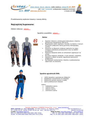 Przedstawiamy wybrane towary z naszej oferty. Najczęściej kupowane: Odzież robocza: więcej.... Spodnie szwedzkie: więcej.... Better Spodnie robocze w atrakcyjnej kolorystyce z tkaniny poliestrowo-bawełnianej 290 g/m2. Regulowane szelki zapinane z przodu na klamry z tylnym karczkiem połączone taśmą gumową niekrępującą ruchów. Kieszenie na Bawecie (większa zapinana na rzepy, mniejsza podzielona przeszyciem) oraz na telefon komórkowy. Pojemne kieszenie dolne ze schowkiem zapinanym na suwak. Na lewej nogawce zasobniki. Z tyłu kieszeń i zasobnik. Zapięcie w pasie na guziki regulowane gumowym ściągaczem. Na kolanach wzmocnienia z tkaniny o podwyższonej odporności na ścieranie. Spodnie ogrodniczki EMIL 100% bawełna o gramaturze 260g/m2 dodatkowe wzmocnienie na kolanach elastyczna gumka wszyta w szelki sporo praktycznych kieszeni kolory: niebieskie+czarny czarne+szary zielone+czarny czerwone+czarny Partner Handlowy LYONESS Poland Sp. z o.o. www.lyoness.pl BHP LESTAR s.c. S.G. Gwiazda, 43-400 Cieszyn, ul. Majowa 159A, NIP PL5482643117 tel. 33 851-44-23, tel/fax 33 851-44-24, tel. kom. +48 501-432-173 REGON 241932346 sklep on-line: www.bhp-lestar.pl www.lestars.pl e-mail: [email protected] BPH: 81 1060 0076 0000 3200 0007 2967 (PLN) ING: 07 1050 1083 1000 0090 7947 1653 (PLN) ALIOR: 79 2490 0005 0000 4500 2051 9112 (PLN) ING: PL 18 1050 1083 1000 0090 7989 6024 (EUR) Ogrodniczki Monterskie EMERTON wysoka jakość materiału wysoka jakość wykonania wzmocnione materiałem 600D poliester (czarny) w najbardziej narażonych miejscach ryglowanie w 24 miejscach najbardziej narażonych na rozprucie 11 kieszeni na narzędzia wzmocnienia na kolanach - kieszenie na wkładki nakolannikowe Skład: poliester/bawełna (65/35%) Kolor: ciemny szary + wstawki pomarańczowe Gramatura: 280 g/m2, wstawki poliester 600D - czarny Znakomicie nadaje się do pracy w budownictwie, warsztatach, zakładach produkcyjnych. Wysoka odporność na ścieranie i rozdarcie, duża ilość odpowiednio dobranych kieszeni pozwala wygodnie rozmieścić najpotrzebniejsze narzędzia. Nie należy stosować przy pracy z ogniem (np. spawacze). Spodnie do pasa więcej.... Better Spodnie robocze do pasa z tkaniny poliestrowobawełnianej w atrakcyjne kolorystyce z kieszeniami i zasobnikami. Alternatywa dla spodni typu ogrodniczki w zestawach ubraniowych BETTER. Partner Handlowy LYONESS Poland Sp. z o.o. www.lyoness.pl BHP LESTAR s.c. S.G. Gwiazda, 43-400 Cieszyn, ul. Majowa 159A, NIP PL5482643117 tel. 33 851-44-23, tel/fax 33 851-44-24, tel. kom. +48 501-432-173 REGON 241932346 sklep on-line: www.bhp-lestar.pl www.lestars.pl e-mail: [email protected] BPH: 81 1060 0076 0000 3200 0007 2967 (PLN) ING: 07 1050 1083 1000 0090 7947 1653 (PLN) ALIOR: 79 2490 0005 0000 4500 2051 9112 (PLN) ING: PL 18 1050 1083 1000 0090 7989 6024 (EUR) Spodnie robocze do pasa JOSEF 100% bawełna o gramaturze 260g/m2 dodatkowe wzmocnienia na kolanach łatwe dopasowanie do sylwetki dzięki elastycznej gumce wszytej z tyłu spodni kolory: czarne+szary niebieskie+czarny czerwone+czarny zielone+czarny szare+czerwony Spodnie do pasa Monterskie EMERTON wysoka jakość materiału wysoka jakość wykonania wzmocnione materiałem 600D poliester (czarny) w najbardziej narażonych miejscach ryglowanie w 30 miejscach najbardziej narażonych na rozprucie 9 kieszeni na narzędzia wzmocnienia na kolanach - kieszenie na wkładki nakolannikowe Skład: poliester/bawełna (65/35%) Kolor: ciemny szary + wstawki pomarańczowe Gramatura: 280 g/m2, wstawki poliester 600D - czarny Znakomicie nadaje się do pracy w budownictwie, warsztatach, zakładach produkcyjnych. Wysoka odporność na ścieranie i rozdarcie, duża ilość odpowiednio dobranych kieszeni pozwala wygodnie rozmieścić najpotrzebniejsze narzędzia. Nie należy stosować przy pracy z ogniem (np. spawacze). Partner Handlowy LYONESS Poland Sp. z o.o. www.lyoness.pl BHP LESTAR s.c. S.G. Gwiazda, 43-400 Cieszyn, ul. Majowa 159A, NIP PL5482643117 tel. 33 851-44-23, tel/fax 33 851-44-24, tel. kom. +48 501-432-173 REGON 241932346 sklep on-line: www.bhp-lestar.pl www.lestars.pl e-mail: [email protected] BPH: 81 1060 0076 0000 3200 0007 2967 (PLN) ING: 07 1050 1083 1000 0090 7947 1653 (PLN) ALIOR: 79 2490 0005 0000 4500 2051 9112 (PLN) ING: PL 18 1050 1083 1000 0090 7989 6024 (EUR) Koszule i koszulki więcej.... Koszula flanelowa Polska Koszula z długim rękawem zapinana na guziki, usztywniony kołnierzyk. Kolory: czerwony, zielony, niebieski. Flanela drapowana o gramaturze 170g T-shirt PROMOSTARS standard biały T-shirt PROMOSTARS standard kolor Rozmiary: XS, S, M, L, XL, XXL Waga: 150g/m2 Skład: 100% bawełny półczesanej Opis: elastyczny ściągacz; taśma wzmacniająca na ramionach; boki bezszwowe; podwójne szwy Partner Handlowy LYONESS Poland Sp. z o.o. www.lyoness.pl BHP LESTAR s.c. S.G. Gwiazda, 43-400 Cieszyn, ul. Majowa 159A, NIP PL5482643117 tel. 33 851-44-23, tel/fax 33 851-44-24, tel. kom. +48 501-432-173 REGON 241932346 sklep on-line: www.bhp-lestar.pl www.lestars.pl e-mail: [email protected] BPH: 81 1060 0076 0000 3200 0007 2967 (PLN) ING: 07 1050 1083 1000 0090 7947 1653 (PLN) ALIOR: 79 2490 0005 0000 4500 2051 9112 (PLN) ING: PL 18 1050 1083 1000 0090 7989 6024 (EUR) Polary więcej.... Polar Otawa Polar z zamkiem błyskawicznym, ściągacz, 2 kieszenie, 450 g/m2 polar fleece Obuwie robocze: więcej.... Trzewiki zawodowe antyelektrostatyczne 305 Charakterystyka obuwia i jego walory użytkowe: * Cholewki wykonane ze skór naturalnych z wstawką z oddychającego" materiału Cordura produkowanego na licencji firmy DuPont. Materiał ten posiada bardzo dobre właściwości higieniczne, jest trwały i odporny na rozdzieranie. Stanowi membranę termoaktywną zapewniającą wodoi wiatroszczelność przy jednoczesnym odprowadzaniu potu na zewnątrz. * Górna część cholewki zakończona przyjaznym dla nogi kołnierzem ochronnym, wypełnionym pianką lateksową, Podszewka przyszwy z tkaniny Ibiline, po