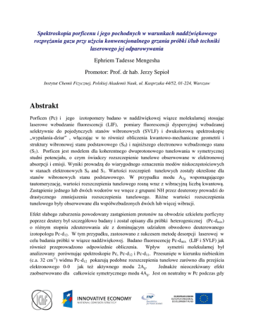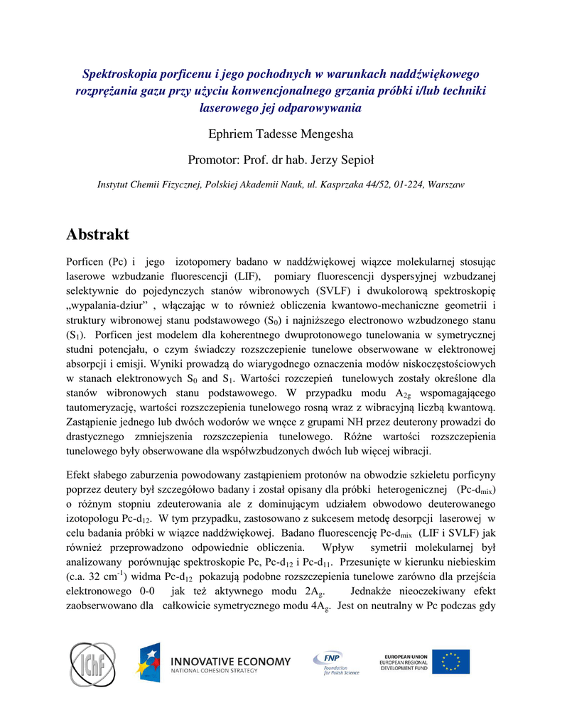 Spektroskopia porficenu i jego pochodnych w warunkach naddźwiękowego rozprężania gazu przy użyciu konwencjonalnego grzania próbki i/lub techniki laserowego jej odparowywania Ephriem Tadesse Mengesha Promotor: Prof. dr hab. Jerzy Sepioł Instytut Chemii Fizycznej, Polskiej Akademii Nauk, ul. Kasprzaka 44/52, 01-224, Warszaw Abstrakt Porficen (Pc) i jego izotopomery badano w naddźwiękowej wiązce molekularnej stosując laserowe wzbudzanie fluorescencji (LIF), pomiary fluorescencji dyspersyjnej wzbudzanej selektywnie do pojedynczych stanów wibronowych (SVLF) i dwukolorową spektroskopię „wypalania-dziur” , włączając w to również obliczenia kwantowo-mechaniczne geometrii i struktury wibronowej stanu podstawowego (S0) i najniższego electronowo wzbudzonego stanu (S1). Porficen jest modelem dla koherentnego dwuprotonowego tunelowania w symetrycznej studni potencjału, o czym świadczy rozszczepienie tunelowe obserwowane w elektronowej absorpcji i emisji. Wyniki prowadzą do wiarygodnego oznaczenia modów niskoczęstościowych w stanach elektronowych S0 and S1. Wartości rozczepień tunelowych zostały określone dla stanów wibronowych stanu podstawowego. W przypadku modu A2g wspomagającego tautomeryzację, wartości rozszczepienia tunelowego rosną wraz z wibracyjną liczbą kwantową. Zastąpienie jednego lub dwóch wodorów we wnęce z grupami NH przez deuterony prowadzi do drastycznego zmniejszenia rozszczepienia tunelowego. Różne wartości rozszczepienia tunelowego były obserwowane dla współwzbudzonych dwóch lub więcej wibracji. Efekt słabego zaburzenia powodowany zastąpieniem protonów na obwodzie szkieletu porficyny poprzez deutery był szczegółowo badany i został opisany dla próbki heterogenicznej (Pc-dmix) o różnym stopniu zdeuterowania ale z dominującym udziałem obwodowo deuterowanego izotopologu Pc-d12. W tym przypadku, zastosowano z sukcesem metodę desorpcji laserowej w celu badania próbki w wiązce naddźwiękowej. Badano fluorescencję Pc-dmix (LIF i SVLF) jak również przeprowadzono odpowiednie obliczenia. Wpływ symetrii molekularnej był analizowany porównując spektroskopie Pc, Pc-d12 i Pc-d11. Przesunięte w kierunku niebieskim (c.a. 32 cm-1) widma Pc-d12 pokazują podobne rozszczepienia tunelowe zarówno dla przejścia elektronowego 0-0 jak też aktywnego modu 2Ag. Jednakże nieoczekiwany efekt zaobserwowano dla całkowicie symetrycznego modu 4Ag. Jest on neutralny w Pc podczas gdy w Pc-d12 zwiększa rozszczepienie. Ten efekt można wyjaśnić analizując wektory przesunięcia atomów w modzie 4Ag po deuteracji. Model symetrycznego sprzężenia modu (SMC) został zastosowany do śledzenia efektu sprzężenia modu na dwuwymiarowej powierzchni potencjału (jeden wymiar wzdłuż współrzędnej tunelowania i drugi wzdłuż współrzędnej modu wspomagającego 2Ag) porficenu. Wyniki doświadczalne rozszczepienia tunelowego zostały dobrze odtworzone przez powyższy model. Mocniejsze perturbacje zaobserwowano w zjawisku tunelowania protonów dla 2,7,12,17cztero-tert-butylo-porficenu (TTPc) w naddźwiękowej wiązce molekularnej. Wyniki pomiarów widm LIF i SVLF dla TTPc wprowadzanego do wiązki molekularnej poprzez konwencjonalne grzanie piecyka a także obliczenia chemii kwantowej wskazują na obecność w fazie gazowej trzech izomerów: dwóch trans (jeden o symetrii C2h i drugi o symetrii Cs) i trzeciego cis (o symetrii C2v) . Rozszczepienie tunelowe około 10 cm-1 zaobserwowano dla struktury cis podczas gdy nie zaobserwowano rozszczepienia dla obu form trans. Jest to w zgodzie z obliczoną najkrótszą długością wiązania NH...N formy cis. Interesującym jest, że widmo LIF mierzone z zastosowaniem desorpcji laserowej wskazuje na obecność w wiązce naddźwiękowej tylko izomeru cis.
