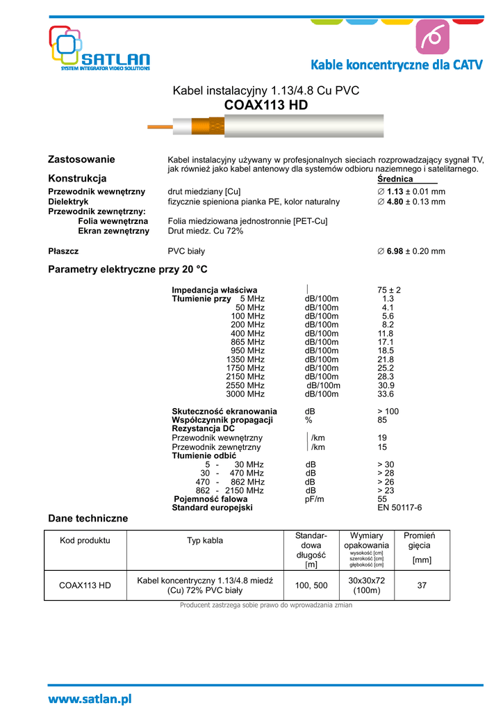 Kabel instalacyjny 1.13/4.8 Cu PVC COAX113 HD Zastosowanie Konstrukcja Przewodnik wewnętrzny Dielektryk Przewodnik zewnętrzny: Folia wewnętrzna Ekran zewnętrzny Płaszcz Kabel instalacyjny używany w profesjonalnych sieciach rozprowadzający sygnał TV, jak również jako kabel antenowy dla systemów odbioru naziemnego i satelitarnego. Średnica drut miedziany [Cu] ∅ 1.13 ± 0.01 mm fizycznie spieniona pianka PE, kolor naturalny ∅ 4.80 ± 0.13 mm Folia miedziowana jednostronnie [PET-Cu] Drut miedz. Cu 72% ∅ 6.98 ± 0.20 mm PVC biały Parametry elektryczne przy 20 °C Impedancja właściwa Tłumienie przy 5 MHz 50 MHz 100 MHz 200 MHz 400 MHz 865 MHz 950 MHz 1350 MHz 1750 MHz 2150 MHz 2550 MHz 3000 MHz Ω dB/100m dB/100m dB/100m dB/100m dB/100m dB/100m dB/100m dB/100m dB/100m dB/100m dB/100m dB/100m 75 ± 2 1.3 4.1 5.6 8.2 11.8 17.1 18.5 21.8 25.2 28.3 30.9 33.6 Skuteczność ekranowania Współczynnik propagacji Rezystancja DC Przewodnik wewnętrzny Przewodnik zewnętrzny Tłumienie odbić 5 30 MHz 30 - 470 MHz 470 - 862 MHz 862 - 2150 MHz Pojemność falowa Standard europejski dB % > 100 85 Ω/km Ω/km 19 15 dB dB dB dB pF/m > 30 > 28 > 26 > 23 55 EN 50117-6 Dane techniczne Kod produktu COAX113 HD Typ kabla Kabel koncentryczny 1.13/4.8 miedź (Cu) 72% PVC biały Standardowa długość [m] 100, 500 Wymiary opakowania Promień gięcia wysokość [cm] szerokość [cm] głębokość [cm] [mm] 30x30x72 (100m) 37 Producent zastrzega sobie prawo do wprowadzania zmian