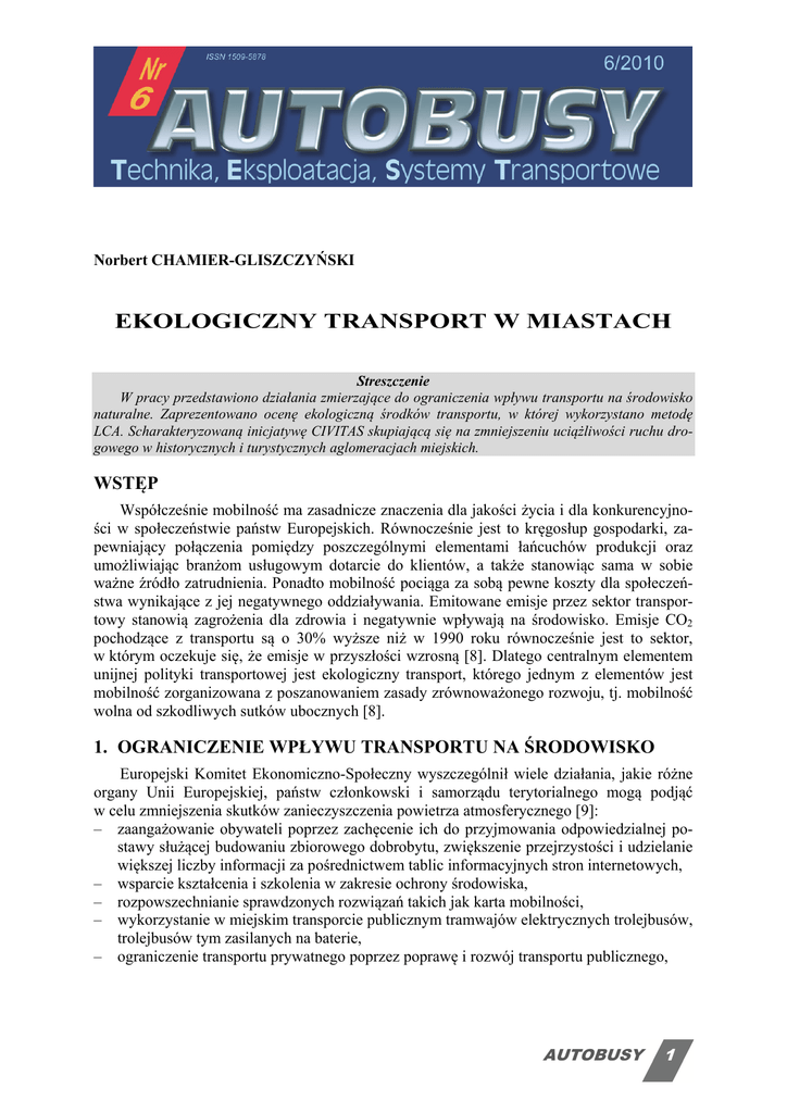 Norbert CHAMIER-GLISZCZYŃSKI EKOLOGICZNY TRANSPORT W MIASTACH Streszczenie W pracy przedstawiono działania zmierzające do ograniczenia wpływu transportu na środowisko naturalne. Zaprezentowano ocenę ekologiczną środków transportu, w której wykorzystano metodę LCA. Scharakteryzowaną inicjatywę CIVITAS skupiającą się na zmniejszeniu uciążliwości ruchu drogowego w historycznych i turystycznych aglomeracjach miejskich. WSTĘP Współcześnie mobilność ma zasadnicze znaczenia dla jakości życia i dla konkurencyjności w społeczeństwie państw Europejskich. Równocześnie jest to kręgosłup gospodarki, zapewniający połączenia pomiędzy poszczególnymi elementami łańcuchów produkcji oraz umożliwiając branżom usługowym dotarcie do klientów, a także stanowiąc sama w sobie ważne źródło zatrudnienia. Ponadto mobilność pociąga za sobą pewne koszty dla społeczeństwa wynikające z jej negatywnego oddziaływania. Emitowane emisje przez sektor transportowy stanowią zagrożenia dla zdrowia i negatywnie wpływają na środowisko. Emisje CO2 pochodzące z transportu są o 30% wyższe niż w 1990 roku równocześnie jest to sektor, w którym oczekuje się, że emisje w przyszłości wzrosną [8]. Dlatego centralnym elementem unijnej polityki transportowej jest ekologiczny transport, którego jednym z elementów jest mobilność zorganizowana z poszanowaniem zasady zrównoważonego rozwoju, tj. mobilność wolna od szkodliwych sutków ubocznych [8]. 1. OGRANICZENIE WPŁYWU TRANSPORTU NA ŚRODOWISKO Europejski Komitet Ekonomiczno-Społeczny wyszczególnił wiele działania, jakie różne organy Unii Europejskiej, państw członkowski i samorządu terytorialnego mogą podjąć w celu zmniejszenia skutków zanieczyszczenia powietrza atmosferycznego [9]: – zaangażowanie obywateli poprzez zachęcenie ich do przyjmowania odpowiedzialnej postawy służącej budowaniu zbiorowego dobrobytu, zwiększenie przejrzystości i udzielanie większej liczby informacji za pośrednictwem tablic informacyjnych stron internetowych, – wsparcie kształcenia i szkolenia w zakresie ochrony środowiska, – rozpowszechnianie sprawdzonych rozwiązań takich jak karta mobilności, – wykorzystanie w miejskim transporcie publicznym tramwajów elektrycznych trolejbusów, trolejbusów tym zasilanych na baterie, – ograniczenie transportu prywatnego poprzez poprawę i rozwój transportu publicznego, AUTOBUSY 1 – przyjęcie różnych stawek podatków od pojazdów samochodowych paliwa w zależności od stopnia powodowanego przez nie zanieczyszczenia, a także opłat za wjazd do centrum miasta, które uwzględniałyby różne możliwości finansowe obywateli i poziom emisji, – internalizacja kosztów zewnętrznych, zwłaszcza kosztów zdrowotnych ponoszonych przez obywateli, – opracowanie zintegrowanej polityki transportu poprzez ustalenie stopnia zgodności poszczególnych projektów zasadami rozwoju zrównoważonego, – przyczynianie się do zmiany stylu życia, tak by był on bardziej wstrzemięźliwy i ekologiczny, – wsparcie dla zrównoważonej mobilności pieszej lub rowerowej na krótkich odcinkach, – unikanie niepotrzebnego transportu, – przegląd zarządzania logistyką i produkcją w systemie dokładnie na czas, – promowanie telepracy, – zmniejszenie zatorów na drogach poprzez optymalizację wykorzystania środków transportu i priorytetowe traktowanie transportu publicznego, – wsparcie badań naukowych oraz innowacyjnego rozwoju materiałów rozwiązań technologicznych służących ograniczeniu zanieczyszczeń ruchu i transportu drogowego, – przeprowadzanie bardziej zaostrzonych kontroli okresowych w tych krajach, gdzie park samochodowy jest przestarzały i powoduje więcej zanieczyszczeń. W celu zmniejszenia wpływu oddziaływania hałasu emitowanego przez środki transportu, można by wprowadzić [9]: – ograniczenie w ruchu nocnym pojazdów prywatnych na obszarach mieszkalnych, – spowalniacze ruchu na nawierzchniach ulic, – poprawę jakości asfaltu, – ekrany dźwiękochłonne na obszarach o największej gęstości ruchu, – rzeczywiście odstraszające kary dla pojazdów przekraczających dopuszczalny poziom emisji hałasu, ze szczególnym uwzględnieniem pojazdów silnikowych dwu- i trzykołowych, – testy poziomu hałasu przeprowadzone w warunkach bardziej zbliżonych do rzeczywistych warunków użytkowania pojazdów, – częstsze wizyty lekarskie dla osób najbardziej narażonych na ryzyko hałasu, – skuteczne działania na rzecz usprawnienia ruchu drogowego ze szczególnych uwzględnieniem rozpowszechniania pasów ruchu i ulic dla transportu publicznego, – szczególne przepisy i odpowiednie udogodnienia dla osób pracujących na drogach, które wdychają zanieczyszczone powietrze lub są stale narażone na hałas. 2. OCENA WPŁYWU CYKLU ŻYCIA ŚRODKÓW TRANSPORTU Metody oceny wpływu środków transportu na środowisko powinny uwzględniać nie tylko etap ich eksploatacji, ale również pozostałe etapy cyklu życia tj. etap projektowania, etap wytwarzania i etap wycofania z eksploatacji (rys. 1) w wypadku, których występują emisje pośrednio związane z transportem. Ponadto taka ocena cyklu życia powinna obejmować cztery wzajemnie powiązane etapy: określenie celu i zakresu, analiza zbioru wejść i wyjść, ocenę wpływu na środowisko, interpretacja cyklu życia (rys. 2) [3, 4, 5, 6, 7]. Jedną z metod stosowanych do ilościowego określenia wpływu obiektów technicznych na środowisko jest metoda LCA (Life Cycle Assessment) [1, 2]. 2 AUTOBUSY Rys. 1. Cykl życia środków transportu Rys. 2. Poszczególne etapy oceny cyklu życia 3. CIVITAS – EKOLOGICZNY TRANSPORT MIEJSKI Zatory w ruchu drogowym, wypadki i zanieczyszczenie środowiska to poważne problemy miast europejskich. Transport i mobilność są więc dla władz lokalnych sprawami o najwyższym priorytecie. W roku 2000 Komisja Europejska uznała konieczność dz