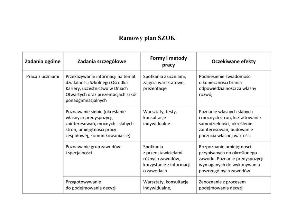Ramowy plan SZOK Formy i metody pracy Zadania ogólne Zadania szczegółowe Oczekiwane efekty Praca z uczniami Przekazywanie informacji na temat działalności Szkolnego Ośrodka Kariery, uczestnictwo w Dniach Otwartych oraz prezentacjach szkół ponadgimnazjalnych Spotkania z uczniami, zajęcia warsztatowe, prezentacje Podniesienie świadomości o konieczności brania odpowiedzialności za własny rozwój Poznawanie siebie (określanie własnych predyspozycji, zainteresowań, mocnych i słabych stron, umiejętności pracy zespołowej, komunikowania się) Warsztaty, testy, konsultacje indywidualne Poznanie własnych słabych i mocnych stron, kształtowanie samodzielności, określenie zainteresowań, budowanie poczucia własnej wartości Poznawanie grup zawodów i specjalności Spotkania z przedstawicielami różnych zawodów, korzystanie z informacji o zawodach Rozpoznanie umiejętności przypisanych do określonego zawodu. Poznanie predyspozycji wymaganych do wykonywania poszczególnych zawodów Przygotowywanie do podejmowania decyzji Warsztaty, konsultacje indywidualne, Zapoznanie z procesem podejmowania decyzji i planowania własnego rozwoju zawodowego prezentacje zawodowych i edukacyjnych Kształtowanie umiejętności dokonywania samooceny Konsultacje indywidualne Umiejętność dokonywania prawidłowej samooceny, autorefleksji, przygotowanie ucznia do dokonania wyboru drogi zawodowej. Praca z rodzicami Prezentowanie rodzicom założeń działalności SzOK z naciskiem na wybór szkoły ponadgimnazjalnej Prezentacja na zebraniach rodziców Włączenie rodziców do działań na rzecz szkolnego poradnictwa zawodowego Praca z rodzicami Prowadzenie zajęć edukacyjnych dla rodziców Warsztaty, konsultacje indywidualne, prezentacje Wspomaganie rodziców w procesie podejmowania decyzji zawodowych przez ich dzieci Indywidualna praca z rodzicami uczniów mających problemy z wyborem drogi zawodowej np. z powodów zdrowotnych itp. Konsultacje indywidualne Wspieranie rodziców w sytuacjach trudnych Rzemieślnicza Szkoła Zawodowa w Łukowie Spotkanie z przedstawicielami szkoły Podjęcie decyzji o wyborze szkoły ponadgimnazjalnej dla uczniów mających problemy z nauką OHP w Łukowie Spotkanie z przedstawicielami szkoły Podjęcie decyzji o wyborze szkoły ponadgimnazjalnej dla uczniów mających problemy z nauką Współpraca z instytucjami wspierającymi działania SzOK Poradnia PsychologicznoPedagogiczna w Łukowie Konsultacje indywidualne i warsztaty dla uczniów, spotkania z rodzicami Wspomaganie uczniów w procesie poznania siebie i podejmowania decyzji zawodowych. Współpraca z Radą Pedagogiczną Koordynacja działań wszystkich nauczycieli na rzecz doradztwa zawodowego i przygotowania uczniów do wyboru drogi zawodowej Dyskusje w ramach Rady Pedagogicznej, udostępnianie materiałów spójnego ścieżek edukacyjnych Utworzenie spójnego systemu szkolnego doradztwa zawodowego Tworzenie i przekazywanie informacji Udostępnianie bazy informacji o zawodach Komputerowa baza informacji Poznanie klasyfikacji zawodów, wykazu zawodów aktualnie poszukiwanych przez pracodawców, tendencji na rynku pracy. Wyszukiwanie i udostępnianie informacji o zasadach rekrutacji Informatory, Internet Dostęp do informacji multimedialnych rekrutacji do szkół ponadgimnazjalnych