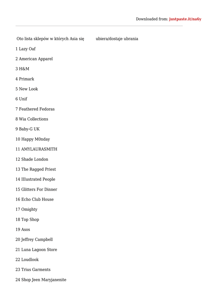 Downloaded from: justpaste.it/na6y Oto lista sklepów w których Asia się 1 Lazy Oaf 2 American Apparel 3 H&M 4 Primark 5 New Look 6 Unif 7 Feathered Fedoras 8 Wia Collections 9 Baby-G UK 10 Happy M0nday 11 AMYLAURASMITH 12 Shade London 13 The Ragged Priest 14 IIIustrated People 15 Glitters For Dinner 16 Echo Club House 17 Omighty 18 Top Shop 19 Asos 20 Jeffrey Campbell 21 Luna Lagoon Store 22 Loudlook 23 Trius Garments 24 Shop Jeen Maryjanenite ubiera/dostaje ubrania 25 Shopinuinu 26 Tola Vintage 27 Shade London 28 Lamoda 29 Cat Got The Cream 30 Hello Molly 31 Tibbs and Bones 32 Lilac Edgestore 33 Mogustash 34 Hot Mess Clothing To na tyle mam nadziej ze kiedyś wam się to przyda :) Własność @JonnaKuchtaPolska jeśli chcesz coś skopiować napisz