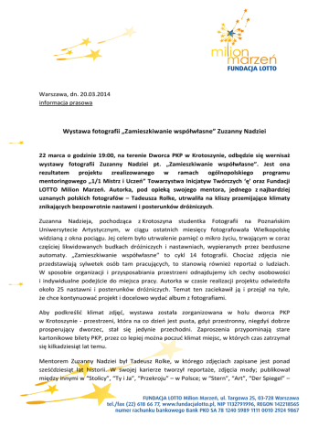 Warszawa, dn. 20.03.2014 informacja prasowa Wystawa fotografii „Zamieszkiwanie współwłasne” Zuzanny Nadziei 22 marca o godzinie 19:00, na terenie Dworca PKP w Krotoszynie, odbędzie się wernisaż wystawy fotografii Zuzanny Nadziei pt. „Zamieszkiwanie współwłasne”. Jest ona rezultatem projektu zrealizowanego w ramach ogólnopolskiego programu mentoringowego „1/1 Mistrz i Uczeń” Towarzystwa Inicjatyw Twórczych ‘ę’ oraz Fundacji LOTTO Milion Marzeń. Autorka, pod opieką swojego mentora, jednego z najbardziej uznanych polskich fotografów – Tadeusza Rolke, utrwaliła na kliszy przemijające klimaty znikających bezpowrotnie nastawni i posterunków dróżniczych. Zuzanna Nadzieja, pochodząca z Krotoszyna studentka Fotografii na Poznańskim Uniwersytecie Artystycznym, w ciągu ostatnich miesięcy fotografowała Wielkopolskę widzianą z okna pociągu. Jej celem było utrwalenie pamięć o mikro życiu, trwającym w coraz częściej likwidowanych budkach dróżniczych i nastawniach, wypieranych przez bezduszne automaty. „Zamieszkiwanie współwłasne” to cykl 14 fotografii. Chociaż zdjęcia nie przedstawiają sylwetek osób tam pracujących, to stanowią również reportaż o ludziach. W sposobie organizacji i przysposabiania przestrzeni odnajdujemy ich cechy osobowości i indywidualne podejście do miejsca pracy. Autorka w czasie realizacji projektu odwiedziła około 25 nastawni i posterunków dróżniczych. Temat ten zaciekawił ją i przejął na tyle, że chce kontynuować projekt i docelowo wydać album z fotografiami. Aby podkreślić klimat zdjęć, wystawa została zorganizowana w holu dworca PKP w Krotoszynie - przestrzeni, która na co dzień jest pusta, gdyż przestronny, niegdyś dobrze prosperujący dworzec, stał się jedynie przechodni. Zaproszenia przypominają stare kartonikowe bilety PKP, przez co lepiej można poczuć klimat miejsc, w których czas zatrzymał się kilkadziesiąt lat temu. Mentorem Zuzanny Nadziei był Tadeusz Rolke, w którego zdjęciach zapisane jest ponad sześćdziesiąt lat historii. W swojej karierze tworzył reportaże, zdjęcia mody; publikował między innymi w “Stolicy”, “Ty i Ja”, “Przekroju” – w Polsce; w “Stern”, “Art”, “Der Spiegel” – w Niemczech. Współpracując ze swoim Mistrzem młoda fotografka miała możliwość rozmawiać z nim na temat fotografii w ogóle, omawiać swoje pomysły i powstające zdjęcia. Program „1/1 Mistrz i Uczeń” to spotkanie dziesięciu młodych artystów i animatorów kultury z różnych zakątków Polski z dziesięcioma uznanymi twórcami. Jest to dla nich szansa na stworzenie projektu artystycznego lub społeczno-kulturalnego pod okiem mistrza. Każdy z uczestników programu dostał wsparcie swojego mentora, coachów i trenerów oraz 6 tysięcy złotych na realizację własnego pomysłu. Duety same określiły sobie harmonogram prac, których koniec dobiegł w lutym 2014. Jego efektem końcowym będzie wydanie pamiątkowej publikacji podsumowująca wszystkie dziesięć realizacji. Program „1/1 Mistrz i Uczeń” Towarzystwa Inicjatyw Twórczych ‘ę’ realizowany jest we współpracy z Fundacją LOTTO Milion Marzeń oraz finansowany ze środków Fundacji LOTTO Milion Marzeń. Więcej o projekcie „1/1 Mistrz i Uczeń” oraz informacje o wszystkich uczestnikach i mentorach można znaleźć na stronach: www.1na1.e.org.pl oraz www.fundacjalotto.pl. Informacje dla mediów: [email protected] tel. 22 618 66 77 Strona 2 z 2