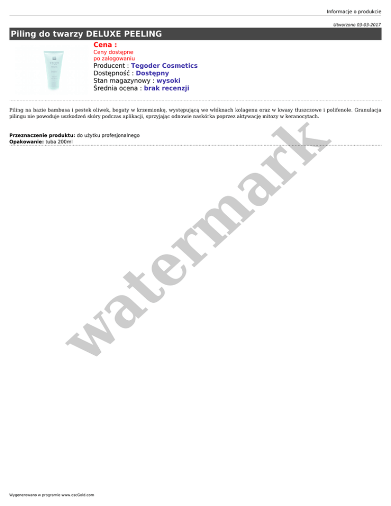 Informacje o produkcie Utworzono 03-03-2017 Piling do twarzy DELUXE PEELING Cena : Ceny dostępne po zalogowaniu Producent : Tegoder Cosmetics Dostępność : Dostępny Stan magazynowy : wysoki Średnia ocena : brak recenzji Piling na bazie bambusa i pestek oliwek, bogaty w krzemionkę, występującą we włóknach kolagenu oraz w kwasy tłuszczowe i polifenole. Granulacja pilingu nie powoduje uszkodzeń skóry podczas aplikacji, sprzyjając odnowie naskórka poprzez aktywację mitozy w keranocytach. w at er m ar k Przeznaczenie produktu: do użytku profesjonalnego Opakowanie: tuba 200ml Wygenerowano w programie www.oscGold.com