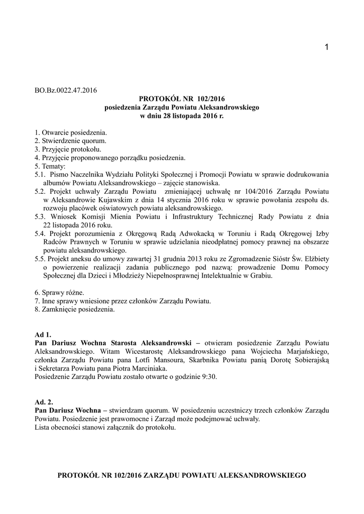 1 BO.Bz.0022.47.2016 PROTOKÓŁ NR 102/2016 posiedzenia Zarządu Powiatu Aleksandrowskiego w dniu 28 listopada 2016 r. 1. Otwarcie posiedzenia. 2. Stwierdzenie quorum. 3. Przyjęcie protokołu. 4. Przyjęcie proponowanego porządku posiedzenia. 5. Tematy: 5.1. Pismo Naczelnika Wydziału Polityki Społecznej i Promocji Powiatu w sprawie dodrukowania albumów Powiatu Aleksandrowskiego – zajęcie stanowiska. 5.2. Projekt uchwały Zarządu Powiatu zmieniającej uchwałę nr 104/2016 Zarządu Powiatu w Aleksandrowie Kujawskim z dnia 14 stycznia 2016 roku w sprawie powołania zespołu ds. rozwoju placówek oświatowych powiatu aleksandrowskiego. 5.3. Wniosek Komisji Mienia Powiatu i Infrastruktury Technicznej Rady Powiatu z dnia 22 listopada 2016 roku. 5.4. Projekt porozumienia z Okręgową Radą Adwokacką w Toruniu i Radą Okręgowej Izby Radców Prawnych w Toruniu w sprawie udzielania nieodpłatnej pomocy prawnej na obszarze powiatu aleksandrowskiego. 5.5. Projekt aneksu do umowy zawartej 31 grudnia 2013 roku ze Zgromadzenie Sióstr Św. Elżbiety o powierzenie realizacji zadania publicznego pod nazwą: prowadzenie Domu Pomocy Społecznej dla Dzieci i Młodzieży Niepełnosprawnej Intelektualnie w Grabiu. 6. Sprawy różne. 7. Inne sprawy wniesione przez członków Zarządu Powiatu. 8. Zamknięcie posiedzenia. Ad 1. Pan Dariusz Wochna Starosta Aleksandrowski – otwieram posiedzenie Zarządu Powiatu Aleksandrowskiego. Witam Wicestarostę Aleksandrowskiego pana Wojciecha Marjańskiego, członka Zarządu Powiatu pana Lotfi Mansoura, Skarbnika Powiatu panią Dorotę Sobierajską i Sekretarza Powiatu pana Piotra Marciniaka. Posiedzenie Zarządu Powiatu zostało otwarte o godzinie 9:30. Ad. 2. Pan Dariusz Wochna – stwierdzam quorum. W posiedzeniu uczestniczy trzech członków Zarządu Powiatu. Posiedzenie jest prawomocne i Zarząd może podejmować uchwały. Lista obecności stanowi załącznik do protokołu. PROTOKÓŁ NR 102/2016 ZARZĄDU POWIATU ALEKSANDROWSKIEGO 2 Ad 3. Pan Dariusz Wochna – proponuję przyjąć bez czytania protokół nr 101/2016 posiedzenia Zarządu Powiatu z dnia 24 listopada 2016r. Czy są uwagi, propozycje zmian, czy uzupełnień do przedłożonego protokołu nr 101/2016 posiedzenia Zarządu Powiatu z dnia 24 listopada 2016r.? Nie widzę. Proponuję przyjąć go bez czytania. Kto jest za? Dziękuję. Przebieg głosowania: Za – 3, Przeciw – nie było, Wstrzymujących się – nie było. Jednogłośnie. Członkowie Zarządu Powiatu, w wyniku głosowania przyjęli protokół nr 101/2016 posiedzenia Zarządu Powiatu z dnia 24 listopada 2016r. Ad 4. Pan Dariusz Wochna – przechodzimy do proponowanego porządku dzisiejszego posiedzenia. Wnoszę o rozszerzenie porządku o punkt: 5.4. Projekt porozumienia z Okręgową Radą Adwokacką w Toruniu i Radą Okręgowej Izby Radców Prawnych w Toruniu w sprawie udzielania nieodpłatnej pomocy prawnej na obszarze powiatu aleksandrowskiego. 5.5. Projekt aneksu do umowy zawartej 31 grudnia 2013 roku ze Zgromadzenie Sióstr Św. Elżbiety o powierzenie realizacji zadania publicznego pod nazwą: prowadzenie Domu Pomocy Społecznej dla Dzieci i Młodzieży Niepełnosprawnej Intelektualnie w Grabiu. Kto jest za? Dziękuję. Przebieg głosowania: Za – 3, Przeciw – nie było, Wstrzymujących się – nie było. Jednogłośnie. Pan Dariusz Wochna – czy są inne wnioski o zmianę porządku? Nie widzę. Przechodzimy do realizacji dzisiejszego porządku posiedzenia rozszerzonego o punkty 5.4. i 5.5. Porządek posiedzenia Zarządu Powiatu, stanowi załącznik do protokołu. Ad 5.1. Pismo Naczelnika Wydziału Polityki Społecznej i Promocji Powiatu w sprawie dodrukowania albumów Powiatu Aleksandrowskiego – zajęcie stanowiska. Pan Dariusz Wochna – przechodzimy do punktu 5.1. Pismo Naczelnika Wydziału Polityki Społecznej i Promocji Powiatu w sprawie dodrukowania albumów Powiatu Aleksandrowskiego. Album Powiatu Aleksandrowskiego był wydany w 2014 roku w nakładzie 2.000 egzemplarzy. Koszt wykonania jednego egzemplarza wyniósł wówczas 18,64 zł brutto. Album służy jako materiał promocyjny powiatu podczas wielu uroczystości o zasięgu powiatowym, regionalnym oraz międzynarodowym. W chwili obecnej na stanie pozostaje 100 szt. albumu. PROTOKÓŁ NR 102/2016 ZARZĄDU POWIATU ALEKSANDROWSKIEGO 3 Wydział Polityki Społecznej i Promocji Powiatu zwrócił się do firmy wydającej album z zapytaniem o możliwość dodruku. Otrzymaliśmy informację, że istnieje możliwość dodruku 1.000 egzemplarzy po tej samej cenie, która była w roku 2014, pod warunkiem złożenia zamówienia do 2 grudnia 2016 r. Czy są pytania, uwagi? Nie widzę. Proponuję wyrazić zgodę na dodrukowania albumów Powiatu Aleksandrowskiego w nakładzie 1.000 egzemplarzy za cenę brutto 18,64zł za jeden egzemplarz. Jednocześnie proponuję aby środki na ten cel przenieść ze środków przeznaczonych na dotacje dla szkół niepublicznych, które pozostaną niewykonane do końca roku tj. zdjąć z rozdziału 80130 §2540 kwotę 10.000zł i z rozdziału 80120 §2540 kwotę 8.000zł i zwiększyć w rozdziale 75095 §4300 o kwotę 18.000zł. Kto jest za? Dziękuję. Zarząd Powiatu, wyraził zgodę na dodrukowania albumów Powiatu Aleksandrowskiego w nakładzie 1.000 egzemplarzy za cenę brutto 18,64zł za jeden egzemplarz i postanowił zabezpieczyć w budżecie powiatu środki finansowe na ten cel poprzez przesunięcie środków przeznaczonych na dotację dla szkół niepublicznych tj. zdjęcie z rozdziału 80130 §2540 kwoty 10.000zł i z rozdziału 80120 §2540 kwoty 8.000zł i zwiększenie w rozdziale 75095 §4300 o kwotę 18.000zł. Przebieg głosowania: Za – 3, Przeciw – nie było, Wstrzymujących się – nie było. Jednogłośnie. Pismo Naczelnika Wydziału Polityki Społecznej i Promocji Powiatu z dnia 24 listopada 2016 r. znak: PS.2012.24.2016 w sprawie dodrukowania albumów Powiatu Aleksandrowskiego, stanowi załącznik do protokołu. Ad 5.2