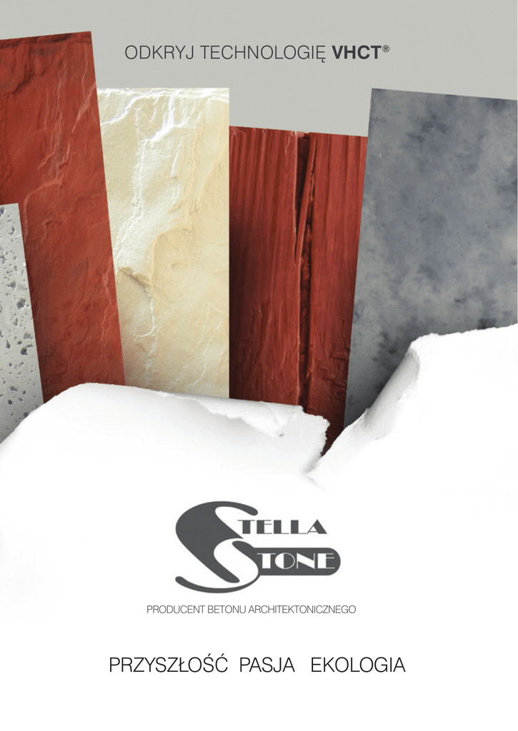 ODKRYJ TECHNOLOGIĘ VHCT® Producent betonu architektonicznego PRZYSZŁOŚĆ PASJA EKOLOGIA 2012 NOWOŚĆ na rynku! VHCT ® very high concrete technology ® PRZYSZŁOŚĆ PA S J A EKOLOGIA Stella Stone jest marką handlową dla produktów z betonu architektonicznego najnowszej generacji. VHCT® very high concrete technology należy do najnowocześniejszch i najekologiczniejszych technologii produkcji materiałów budowlanych. Typowa nasiąkliwość dla betonu VHCP jest bliska 1,5% co daje taki sam wynik jak dla ceramiki i niektórych kamieni naturalnych. W formie drewna jest dużo trwalsze i odporniejsze na zniszczenia. Nasze produkty betonowe pod względem wytrzymałości są podobne do kamieni jak np. granit i ceramika. Stella Stone łączy parametry techniczne ceramiki, kamienia naturalnego oraz betonu co pozwala osiągnąć wyjątkowy efekt. VHCT® to technologia dzięki której osiągamy najwyższe parametry jakościowe. Produkty Stella Stone zostały stworzone z myślą o klientach, którzy poszukują wyjątkowego, ale optymalnego rozwiazania pod względem ekologii i ekonomii. Nasze „betonowe drewno” jest trwałe, odporne na degradacje jakim ulega drewno naturalne oraz znacznie tańsze w zakupie i utrzymaniu. Jednak przede wszystkim chroni lasy przed wycinką. Kupując nasze „drewno” chronisz lasy! Beton architektoniczny Stella Stone Nasze produkty posiadają certyfikat DESKI BETONOWE Wyjątkowe betonowe deski w strukturze i kolorze ciemnego dębu, które trudno odróżnić od drewna. Stworzone z myślą o wymagających klientach. Będą służyć przez wiele lat jako ozdoba. Doskonałe na posadzki tarasowe, garażowe, miejsca grilowania itp. *nie wymagają impregnacji, zmywalne, odporne na ścieranie, na warunki atmosferyczne. Układać można bezpośrednio na wyrównanej i zruszanej powierzchni ziemi, ale zalecane jest min. 3 cm piasku kopanego jako podkład Dane techniczne: kolor brązowy wymiary: 21,5 x 86 x 3 cm waga 1 szt. 14 kg wymiary: 21 x 63,5 x 3 cm waga 1 szt. 9,5 kg wymiary: 21 x 42,5 x 3 cm waga 1 szt. 6,3 kg wymiary: 21 x 21 x 3 cm waga 1 szt. 3,3 kg ETNA MIZAR POMPEJE ETNA – płytki o strukturze trawertynu i betonu architektonicznego. Etna została stworzona z myślą o projektach nowoczesnej architektury wnętrz. Łączy tradycję i nowoczesność nadając wyjątkowy charakter wykończenia. Płytka zarówno na tarasy, posadzki jak i na ściany. Biała z czarnymi przebarwieniami swoim wyglądem nawiązuje do marmuru carrara. Odporna na ścieranie może być stosowana w ciągach komunikacyjnych o dużym natężeniu ruchu. Pompeje – płytki o powierzchni łupka. Idealnie pasują zarówno do wnętrz nowoczesnych oraz tradycyjnych. Płytka świetnie prezentuje się jako element ozdobny każdego reprezentacyjnego pomieszcznia. * Przeznaczone do stosowania wewnątrz oraz zewnątrz, odporne na warunki atmosferyczne. * Przeznaczone do stosowania wewnątrz oraz zewnątrz, odporne na warunki atmosferyczne. * Przeznaczone do stosowania wewnątrz oraz zewnątrz, odporne na warunki atmosferyczne. Dane techniczne: kolor: biały, szary, kość słoniowa wymiary: 60 x 30 x 1 cm waga 1 m2: 17 kg Dane techniczne: kolor: biało czarny z czarnymi przebarwieniami ścienne: wymiary: 60 x 30 x 1 cm waga 1 m2. 17 kg na posadzki: wymiary: 60 x 30 x 2 cm waga 1 m2: 38 kg Dane techniczne: kolor: biały, szary, kość słoniowa, bordowo czarny wymiary: 60 x 30 x 1 cm waga 1 m2: 17 kg www.stellastone.pl
