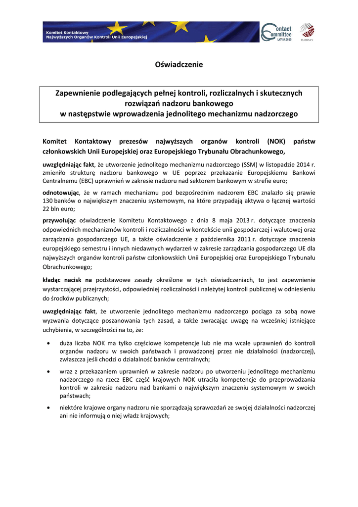Oświadczenie Zapewnienie podlegających pełnej kontroli, rozliczalnych i skutecznych rozwiązań nadzoru bankowego w następstwie wprowadzenia jednolitego mechanizmu nadzorczego Komitet Kontaktowy prezesów najwyższych organów kontroli (NOK) członkowskich Unii Europejskiej oraz Europejskiego Trybunału Obrachunkowego, państw uwzględniając fakt, że utworzenie jednolitego mechanizmu nadzorczego (SSM) w listopadzie 2014 r. zmieniło strukturę nadzoru bankowego w UE poprzez przekazanie Europejskiemu Bankowi Centralnemu (EBC) uprawnień w zakresie nadzoru nad sektorem bankowym w strefie euro; odnotowując, że w ramach mechanizmu pod bezpośrednim nadzorem EBC znalazło się prawie 130 banków o największym znaczeniu systemowym, na które przypadają aktywa o łącznej wartości 22 bln euro; przywołując oświadczenie Komitetu Kontaktowego z dnia 8 maja 2013 r. dotyczące znaczenia odpowiednich mechanizmów kontroli i rozliczalności w kontekście unii gospodarczej i walutowej oraz zarządzania gospodarczego UE, a także oświadczenie z października 2011 r. dotyczące znaczenia europejskiego semestru i innych niedawnych wydarzeń w zakresie zarządzania gospodarczego UE dla najwyższych organów kontroli państw członkowskich Unii Europejskiej oraz Europejskiego Trybunału Obrachunkowego; kładąc nacisk na podstawowe zasady określone w tych oświadczeniach, to jest zapewnienie wystarczającej przejrzystości, odpowiedniej rozliczalności i należytej kontroli publicznej w odniesieniu do środków publicznych; uwzględniając fakt, że utworzenie jednolitego mechanizmu nadzorczego pociąga za sobą nowe wyzwania dotyczące poszanowania tych zasad, a także zwracając uwagę na wcześniej istniejące uchybienia, w szczególności na to, że: • duża liczba NOK ma tylko częściowe kompetencje lub nie ma wcale uprawnień do kontroli organów nadzoru w swoich państwach i prowadzonej przez nie działalności (nadzorczej), zwłaszcza jeśli chodzi o działalność banków centralnych; • wraz z przekazaniem uprawnień w zakresie nadzoru po utworzeniu jednolitego mechanizmu nadzorczego na rzecz EBC część krajowych NOK utraciła kompetencje do przeprowadzania kontroli w zakresie nadzoru nad bankami o największym znaczeniu systemowym w swoich państwach; • niektóre krajowe organy nadzoru nie sporządzają sprawozdań ze swojej działalności nadzorczej ani nie informują o niej władz krajowych; odnotowując, że poszczególne instytucje finansowe wymienione w dyrektywie CRD IV1 zostały wyłączone spod nadzoru sprawowanego przez EBC, a także spod jurysdykcji krajowych organów nadzoru; odnotowując, że kontrola publiczna organów nadzoru bankowego i ich działalności (obejmująca nieograniczony dostęp kontrolerów do wszystkich istotnych informacji) stanowi standardową procedurę w takich państwach, jak Stany Zjednoczone, Kanada, Australia, Dania, Szwecja, Francja i Niemcy, nawet jeśli nadzór ten znajduje się w gestii banków centralnych; uwzględniając fakt, że Europejski Trybunał Obrachunkowy przygotowuje pierwsze kontrole działalności nadzorczej EBC, lecz biorąc pod uwagę opinię EBC, zgodnie z którą kompetencje Trybunału w zakresie kontroli skuteczności operacyjnej zarządzania EBC nie obejmują polityki ani decyzji dotyczących zadań nadzorczych EBC; podkreślając, że zdaniem części NOK istnieje pilna potrzeba wypełnienia potencjalnych luk w zakresie kontroli pojawiających się na poziomie krajowym w wyniku tego, że Trybunał nie otrzymał takich kompetencji na poziomie EBC, jakie posiadały wcześniej krajowe NOK w zakresie kontroli nadzoru bankowego; stwierdza, że: Luka w zakresie kontroli pojawia się w tych państwach strefy euro, w których wcześniejsze kompetencje krajowych NOK w zakresie kontroli organów nadzoru bankowego nie są zastępowane podobnym poziomem kontroli sprawowanej przez Europejski Trybunał Obrachunkowy w odniesieniu do działalności nadzorczej EBC. Istnieje potrzeba wyjaśnienia, czy przystąpienie państwa spoza strefy euro do jednolitego mechanizmu nadzorczego wpłynie w jakikolwiek sposób na kompetencje NOK w zakresie kontroli, a jeżeli tak, to w jaki. Ponadto luka w zakresie kontroli utrzymuje się w niektórych państwach, w których kompetencje krajowych NOK w zakresie kontroli krajowych organów nadzoru bankowego są ograniczone lub NOK w ogóle ich nie mają. Pełną kontrolę i całkowitą rozliczalność nadzoru bankowego w Unii Europejskiej można uzyskać jedynie dzięki ścisłej współpracy pomiędzy krajowymi NOK a Europejskim Trybunałem Obrachunkowym w celu wypełnienia luki w zakresie kontroli, a zanim to nastąpi – zminimalizowania wynikających z niej zagrożeń; zaleca zwiększenie poziomu wiedzy na temat zapewnienia podlegających pełnej kontroli, rozliczalnych i skutecznych rozwiązań nadzoru bankowego, poprzez: w odniesieniu do NOK na poziomie krajowym i europejskim: • • 1 zachęcanie NOK państw członkowskich do przekazywania informacji dotyczących tych kwestii rządom i parlamentom w swoich państwach; zapraszanie NOK państw członkowskich do udziału w planowanych kontrolach koordynowanych dotyczących nadzoru nad poszczególnymi bankami o mniejszym znaczeniu systemowym w wybranych krajach UE, które to kontrole mają się rozpocząć w 2015 r., a ich wyniki mają zostać przedstawione Komitetowi Kontaktowemu; Art. 2 ust. 5 dyrektywy Parlamentu Europejskiego i Rady 2013/36/UE z dnia 26 czerwca 2013 r. w sprawie warunków dopuszczenia instytucji kredytowych do działalności oraz nadzoru ostrożnościowego nad instytucjami kredytowymi i firmami inwestycyjnymi. w odniesieniu do instytucji UE i władz krajowych: • • • zachęcanie Parlamentu Europejskiego, Rady Unii Europejskiej, Rady Europejskiej i Komisji Europejskiej do rozważenia możliwości wzmocnienia kompetencji Europejskiego Trybunału Obrachunkowego w zakresie kontroli jednolitego mechanizmu nadzorczego EBC, 