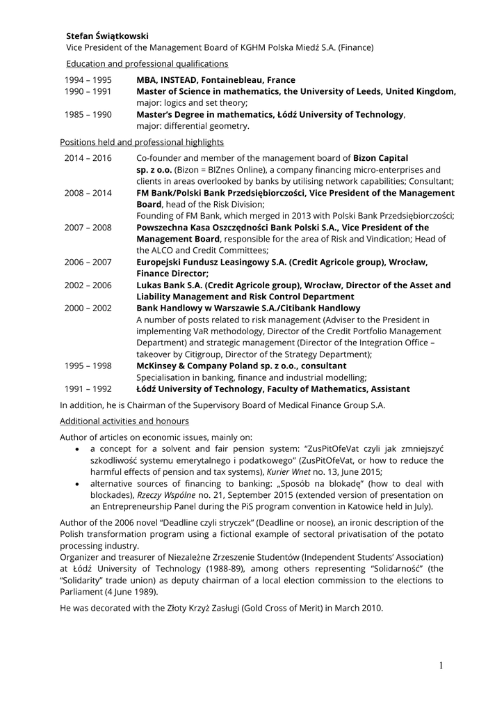 Stefan Świątkowski Vice President of the Management Board of KGHM Polska Miedź S.A. (Finance) Education and professional qualifications 1994 – 1995 1990 – 1991 1985 – 1990 MBA, INSTEAD, Fontainebleau, France Master of Science in mathematics, the University of Leeds, United Kingdom, major: logics and set theory; Master’s Degree in mathematics, Łódź University of Technology, major: differential geometry. Positions held and professional highlights 2014 – 2016 2008 – 2014 2007 – 2008 2006 – 2007 2002 – 2006 2000 – 2002 1995 – 1998 1991 – 1992 Co-founder and member of the management board of Bizon Capital sp. z o.o. (Bizon = BIZnes Online), a company financing micro-enterprises and clients in areas overlooked by banks by utilising network capabilities; Consultant; FM Bank/Polski Bank Przedsiębiorczości, Vice President of the Management Board, head of the Risk Division; Founding of FM Bank, which merged in 2013 with Polski Bank Przedsiębiorczości; Powszechna Kasa Oszczędności Bank Polski S.A., Vice President of the Management Board, responsible for the area of Risk and Vindication; Head of the ALCO and Credit Committees; Europejski Fundusz Leasingowy S.A. (Credit Agricole group), Wrocław, Finance Director; Lukas Bank S.A. (Credit Agricole group), Wrocław, Director of the Asset and Liability Management and Risk Control Department Bank Handlowy w Warszawie S.A./Citibank Handlowy A number of posts related to risk management (Adviser to the President in implementing VaR methodology, Director of the Credit Portfolio Management Department) and strategic management (Director of the Integration Office – takeover by Citigroup, Director of the Strategy Department); McKinsey & Company Poland sp. z o.o., consultant Specialisation in banking, finance and industrial modelling; Łódź University of Technology, Faculty of Mathematics, Assistant In addition, he is Chairman of the Supervisory Board of Medical Finance Group S.A. Additional activities and honours Author of articles on economic issues, mainly on: a concept for a solvent and fair pension system: “ZusPitOfeVat czyli jak zmniejszyć szkodliwość systemu emerytalnego i podatkowego” (ZusPitOfeVat, or how to reduce the harmful effects of pension and tax systems), Kurier Wnet no. 13, June 2015; alternative sources of financing to banking: „Sposób na blokadę” (how to deal with blockades), Rzeczy Wspólne no. 21, September 2015 (extended version of presentation on an Entrepreneurship Panel during the PiS program convention in Katowice held in July). Author of the 2006 novel “Deadline czyli stryczek” (Deadline or noose), an ironic description of the Polish transformation program using a fictional example of sectoral privatisation of the potato processing industry. Organizer and treasurer of Niezależne Zrzeszenie Studentów (Independent Students’ Association) at Łódź University of Technology (1988-89), among others representing “Solidarność” (the “Solidarity” trade union) as deputy chairman of a local election commission to the elections to Parliament (4 June 1989). He was decorated with the Złoty Krzyż Zasługi (Gold Cross of Merit) in March 2010. 1 The appointed Member of the Management Board is not engaged in activities outside of KGHM Polska Miedź S.A. which are competitive with the activities of KGHM Polska Miedź S.A. He is not a partner in a civil law partnership or in a partnership which are competitive with KGHM Polska Miedź S.A. He is not a member of bodies of capital companies which are competitive with KGHM Polska Miedź S.A. He does not participate in any other competitive legal entities as a member of their bodies. He is not listed in the Register of Insolvent Debtors maintained on the basis of the National Court Register law. Legal basis: § 5 sec. 1 point 22 of the Decree of the Minister of Finance dated 19 February 2009 regarding current and periodic information published by issuers of securities and conditions for recognising as equivalent information required by the laws of a non-member state (unified text: Journal of Laws 2014.133). 2