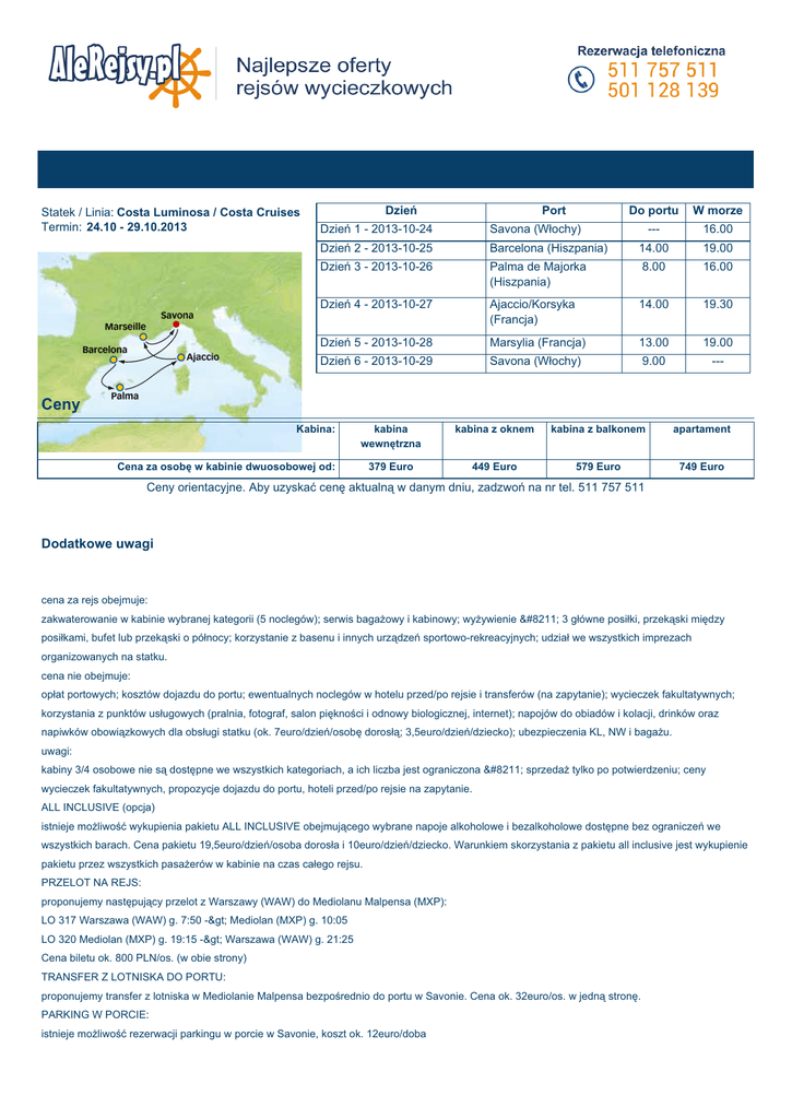 Statek / Linia: Costa Luminosa / Costa Cruises Termin: 24.10 - 29.10.2013 Dzień Port Do portu W morze --- 16.00 Barcelona (Hiszpania) 14.00 19.00 Palma de Majorka (Hiszpania) 8.00 16.00 Dzień 4 - 2013-10-27 Ajaccio/Korsyka (Francja) 14.00 19.30 Dzień 5 - 2013-10-28 Marsylia (Francja) 13.00 19.00 Dzień 6 - 2013-10-29 Savona (Włochy) 9.00 --- Dzień 1 - 2013-10-24 Savona (Włochy) Dzień 2 - 2013-10-25 Dzień 3 - 2013-10-26 Ceny Kabina: kabina wewnętrzna kabina z oknem kabina z balkonem apartament 379 Euro 449 Euro 579 Euro 749 Euro Cena za osobę w kabinie dwuosobowej od: Ceny orientacyjne. Aby uzyskać cenę aktualną w danym dniu, zadzwoń na nr tel. 511 757 511 Dodatkowe uwagi cena za rejs obejmuje: zakwaterowanie w kabinie wybranej kategorii (5 noclegów); serwis bagażowy i kabinowy; wyżywienie – 3 główne posiłki, przekąski między posiłkami, bufet lub przekąski o północy; korzystanie z basenu i innych urządzeń sportowo-rekreacyjnych; udział we wszystkich imprezach organizowanych na statku. cena nie obejmuje: opłat portowych; kosztów dojazdu do portu; ewentualnych noclegów w hotelu przed/po rejsie i transferów (na zapytanie); wycieczek fakultatywnych; korzystania z punktów usługowych (pralnia, fotograf, salon piękności i odnowy biologicznej, internet); napojów do obiadów i kolacji, drinków oraz napiwków obowiązkowych dla obsługi statku (ok. 7euro/dzień/osobę dorosłą; 3,5euro/dzień/dziecko); ubezpieczenia KL, NW i bagażu. uwagi: kabiny 3/4 osobowe nie są dostępne we wszystkich kategoriach, a ich liczba jest ograniczona – sprzedaż tylko po potwierdzeniu; ceny wycieczek fakultatywnych, propozycje dojazdu do portu, hoteli przed/po rejsie na zapytanie. ALL INCLUSIVE (opcja) istnieje możliwość wykupienia pakietu ALL INCLUSIVE obejmującego wybrane napoje alkoholowe i bezalkoholowe dostępne bez ograniczeń we wszystkich barach. Cena pakietu 19,5euro/dzień/osoba dorosła i 10euro/dzień/dziecko. Warunkiem skorzystania z pakietu all inclusive jest wykupienie pakietu przez wszystkich pasażerów w kabinie na czas całego rejsu. PRZELOT NA REJS: proponujemy następujący przelot z Warszawy (WAW) do Mediolanu Malpensa (MXP): LO 317 Warszawa (WAW) g. 7:50 -> Mediolan (MXP) g. 10:05 LO 320 Mediolan (MXP) g. 19:15 -> Warszawa (WAW) g. 21:25 Cena biletu ok. 800 PLN/os. (w obie strony) TRANSFER Z LOTNISKA DO PORTU: proponujemy transfer z lotniska w Mediolanie Malpensa bezpośrednio do portu w Savonie. Cena ok. 32euro/os. w jedną stronę. PARKING W PORCIE: istnieje możliwość rezerwacji parkingu w porcie w Savonie, koszt ok. 12euro/doba Costa Luminosa Costa Luminosa Tonaż: 92.600 ton Rok budowy 2009 Długość: 294 m Szerokość: 32,25 m Szybkość: 21,6 węzła Pokłady pasażerskie: 12 Pasażerowie: max. 2.828 Basen: 2, w tym jeden z rozsuwanym dachem (4 jacuzzi) Waluta: EURO Do dyspozycji: 4 restauracje, w tym Club Luminosa i restauracja Samsara dostępne tylko na rezerwacje, 11 barów (w tym Cigar Lounge i kawiarnia), kasyno, teatr na 3 pokładach, dyskoteka, salon odnowy biologicznej "Samsara Spa" znajdujący się na 2 pokładach (3.500m²), sauna, sala gimnastyczna, fitness center, salon piękności, kort tenisowy, symulator formuły 1, trasa do joggingu, biblioteka, kawiarenka internetowa, kino 4D, pokój zabaw dla dzieci, punkt medyczny, butiki, ogromny ekran na pokładzie z basenem. Kabiny: 1.130 kabin wyposażonych w łazienkę (prysznic, wc, suszarka), klimatyzację, telefon, sejf, mini bar, telewizję satelitarną, radio pokładowe. 56 kabin posiada bezpośredni dostęp do spa, 718 prywatny balkon. Na statku znajdują się 44 kabiny typu suite (wszystkie z balkonami), a 4 z nich ma bezpośredni dostęp do spa. Costa Luminosa dysponuje również kabinami, które są przystosowane dla osób niepełnosprawnych. Room Service dostępny 24h na dobę.