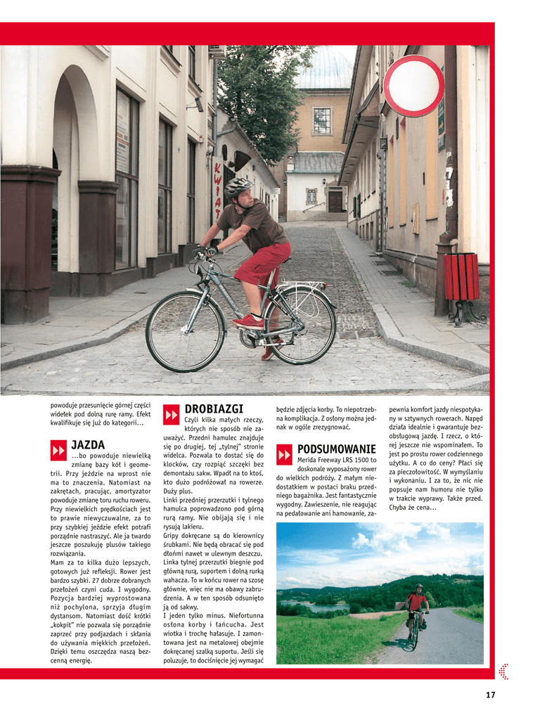 powoduje przesunięcie górnej części widełek pod dolną rurę ramy. Efekt kwalifikuje się już do kategorii… Jazda …bo powoduje niewielką zmianę bazy kół i geometrii. Przy jeździe na wprost nie ma to znaczenia. Natomiast na zakrętach, pracując, amortyzator powoduje zmianę toru ruchu roweru. Przy niewielkich prędkościach jest to prawie niewyczuwalne, za to przy szybkiej jeździe efekt potrafi porządnie nastraszyć. Ale ja twardo jeszcze poszukuję plusów takiego rozwiązania. Mam za to kilka dużo lepszych, gotowych już refleksji. Rower jest bardzo szybki. 27 dobrze dobranych przełożeń czyni cuda. I wygodny. Pozycja bardziej wyprostowana niż pochylona, sprzyja długim dystansom. Natomiast dość krótki „kokpit” nie pozwala się porządnie zaprzeć przy podjazdach i skłania do używania miękkich przełożeń. Dzięki temu oszczędza naszą bezcenną energię. Drobiazgi Czyli kilka małych rzeczy, których nie sposób nie zauważyć. Przedni hamulec znajduje się po drugiej, tej „tylnej” stronie widelca. Pozwala to dostać się do klocków, czy rozpiąć szczęki bez demontażu sakw. Wpadł na to ktoś, kto dużo podróżował na rowerze. Duży plus. Linki przedniej przerzutki i tylnego hamulca poprowadzono pod górną rurą ramy. Nie obijają się i nie rysują lakieru. Gripy dokręcane są do kierownicy śrubkami. Nie będą obracać się pod dłońmi nawet w ulewnym deszczu. Linka tylnej przerzutki biegnie pod główną rurą, suportem i dolną rurką wahacza. To w końcu rower na szosę głównie, więc nie ma obawy zabrudzenia. A w ten sposób odsunięto ją od sakwy. I jeden tylko minus. Niefortunna osłona korby i łańcucha. Jest wiotka i trochę hałasuje. I zamontowana jest na metalowej obejmie dokręcanej szalką suportu. Jeśli się poluzuje, to dociśnięcie jej wymagać będzie zdjęcia korby. To niepotrzebna komplikacja. Z osłony można jednak w ogóle zrezygnować. Podsumowanie Merida Freeway LRS 1500 to doskonale wyposażony rower do wielkich podróży. Z małym niedostatkiem w postaci braku przedniego bagażnika. Jest fantastycznie wygodny. Zawieszenie, nie reagując na pedałowanie ani hamowanie, za- pewnia komfort jazdy niespotykany w sztywnych rowerach. Napęd działa idealnie i gwarantuje bezobsługową jazdę. I rzecz, o której jeszcze nie wspominałem. To jest po prostu rower codziennego użytku. A co do ceny? Płaci się za pieczołowitość. W wymyślaniu i wykonaniu. I za to, że nic nie popsuje nam humoru nie tylko w trakcie wyprawy. Także przed. Chyba że cena… 17
