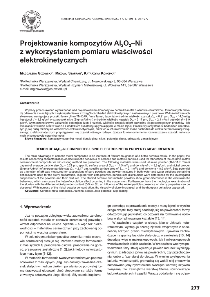 MATERIA£Y CERAMICZNE /CERAMIC MATERIALS/, 63, 2, (2011), 273-277 www.ptcer.pl/mccm Projektowanie kompozytów Al2O3–Ni z wykorzystaniem pomiaru waciwoci elektrokinetycznych MAGDALENA GIZOWSKA1, MIKOAJ SZAFRAN1, KATARZYNA KONOPKA2 1 Politechnika Warszawska, Wydzia Chemiczny, ul. Noakowskiego 3, 00-664 Warszawa Politechnika Warszawska, Wydzia Inynierii Materiaowej, ul. Wooska 141, 02-507 Warszawa e-mail: [email protected] 2 Streszczenie W pracy przedstawiono wyniki bada nad projektowaniem kompozytów ceramika-metal o osnowie ceramicznej, formowanych metod odlewania z mas lejnych z wykorzystaniem w szczególnoci bada elektrokinetycznych zastosowanych proszków. W dowiadczeniach stosowano nastpujce proszki: tlenek glinu (TM-DAR, rmy Tamei, Japonia) o redniej wielkoci czstek D50 = 0,21 m, SBET = 14,5 m2/g i gstoci d = 3,8 g/cm3 oraz proszek niklu (Sigma-Aldrich) o redniej wielkoci czstek D50 = 2,17 m, SBET = 2,1 m2/g i gstoci d = 8,9 g/cm3. Wyznaczono krzywe zalenoci potencjau dzeta i rozkadu wielkoci czstek od pH zawiesiny dla poszczególnych proszków i ich mieszanin w wodzie oraz w wodzie z dodatkiem substancji upynniajcych w masie lejnej. Proszki wykorzystane w badaniach charakteryzuj si du rónic ich waciwoci elektrokinetycznych, przez co w ich mieszaninie moe dochodzi do efektu heterookulacji zwizanego z elektrostatycznym przyciganiem si czstek rónego rodzaju. Sprzyja to równomiernemu rozmieszczeniu czstek metalicznych w kompozycie ceramika-metal. Sowa kluczowe: kompozyty ceramika-metal, tlenek glinu, nikiel, potencja dzeta, odlewanie z mas lejnych DESIGN OF Al2O3–Ni COMPOSITES USING ELECTROKINETIC PROPERTY MEASUREMENTS The main advantage of ceramic-metal composites is an increase of fracture toughness of a brittle ceramic matrix. In the paper, the results concerning characterization of electrokinetic behaviour of ceramic and metallic particles used for fabrication of the ceramic matrix ceramic-metal composite via slip casting method are presented. The following materials were used: alumina powder (TM-DAR, Tamei Japan) of average particle size D50 = 0.21 m, specic surface area of SBET = 14.5 m2/g and density of d = 3,8 g/cm3, and nickel powder (Sigma-Aldrich) of average particle size D50 = 2.17 m, specic surface area of SBET = 2.1 m2/g and density d = 8.9 g/cm3. Zeta potential as a function of pH was measured for suspensions of pure powders and powder mixtures in both water and water solutions containing deocculants used for the slurry preparation. Together with zeta potential, particle size distributions were determined for the investigated suspensions of the powders and their mixtures. The studied ceramic and metallic powders show great differences in the electrokinetic behaviour, which can cause the heteroocculation effect occurring in the suspension. Furthermore, from the rheological examination of the slurries with the different nickel powder content (0-5 vol.%), an inuence of the nickel particles presence on slurry properties can be observed. With increase of the nickel powder concentration, the viscosity of slurry increased, and the rheopexy behaviour appeared. Keywords: Ceramic-metal composite, Alumina, Nickel, Zeta potential, Slip casting 1. Wprowadzenie Ju na pocztku ubiegego wieku zauwaono, e obecno czstek metalu w osnowie ceramicznej powoduje wzrost odpornoci na kruche pkanie – a wic te niezawodnoci – materiaów ceramicznych przy zachowanej odpornoci na wysok temperatur. W celu otrzymania kompozytów ceramika-metal o osnowie ceramicznej stosuje si zarówno metody formowania z mas sypkich tj. prasowanie osiowe, prasowanie na gorco, prasowanie izostatyczne [1, 2], jak i metody wykorzystujce masy lejne [3-12]. W metodzie formowania tworzyw ceramicznych poprzez odlewanie z mas lejnych (ang. slip casting) zawiesina czstek staych w medium ciekym po wlaniu do porowatej formy (zazwyczaj gipsowej, cho stosowane s take formy z tworzyw sztucznych) ulega ltracji. Siy ssania kapilarne- go powoduj odprowadzenie cieczy z masy lejnej, w wyniku czego czstki fazy staej osadzaj si na powierzchni formy odwzorowujc jej ksztat, co pozwala na formowanie wyrobów o skomplikowanym ksztacie [13, 14]. W zawiesinie czstek w cieczy, jako w ukadzie heterofazowym, wystpuje szereg zjawisk zwizanych z obecnoci licznych granic midzyfazowych. Zjawiska zachodzce na granicy faz ciao stae-ciecz w zawiesinie [13, 14] decyduj wic o makroskopowych, jak i mikroskopowych waciwociach takich zawiesin. W rodowisku wodnym powierzchnia fazy staej wykazuje pewien adunek wynikajcy m.in. z adsorpcji jonów na powierzchni, czy przechodzenia jonów z fazy staej do cieczy. W wyniku wystpowania adunku wokó czstki, gromadz si wokó niej przeciwnie naadowane jony hydratowane tworzce warstw sztywno zwizan, tzw. zewntrzn warstw Sterna, równowace adunek powierzchni czstki. Wraz z oddalaniem si od po- 273 M. GIZOWSKA, M. SZAFRAN, K. KONOPKA wierzchni czstki, jony te wizane s coraz sabiej. Odlego, gdzie ruch jonów wzgldem powierzchni czstki jest swobodny nazywana jest paszczyzn cinania, a rónica jej potencjau z potencjaem wntrza roztworu to tzw. potencja ] (dzeta). Wielko tego parametru mówi o sile odpychania si czstek wzgldem siebie, a wic o stabilnoci zawiesiny - im wyszy potencja dzeta, tym mniejsze jest prawdopodobiestwo aglomeracji czstek, a zawiesina jest bardziej stabilna. Kiedy adunki na granicy faz równowa si, a potencja dzeta wynosi zero (tzw. punkt zerowego adunku –ang. point of zero charge - pzc), zawiesina charakteryzuje si brakiem stabilnoci – koaguluje. Potencja elektrokinetyczny zaley od rodzaju jonów wystpujcych w roztworze, pH i rodowiska (rozpuszczalnika) [13, 14]. Formowanie mieszaniny proszków (np. ceramicznego i metalicznego) jest szczególnym przypadkiem mas lejnych, poniewa przy jej projektowaniu naley uwzgldni nie tylko siy wzajemnego oddziaywania pomidzy czstkami jednego rodzaju (czstki ceramiczne lub metaliczne), ale pod uwag naley bra równie oddziaywania pomidzy czstkami rónego typu. 