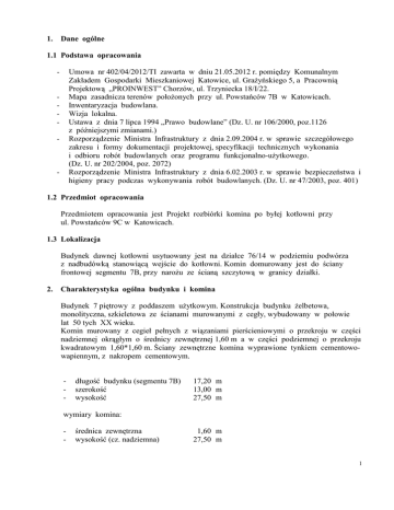 1. Dane ogólne 1.1 Podstawa opracowania - Umowa nr 402/04/2012/TI zawarta w dniu 21.05.2012 r. pomiędzy Komunalnym Zakładem Gospodarki Mieszkaniowej Katowice, ul. GraŜyńskiego 5, a Pracownią Projektową „PROINWEST” Chorzów, ul. Trzyniecka 18/I/22. Mapa zasadnicza terenów połoŜonych przy ul. Powstańców 7B w Katowicach. Inwentaryzacja budowlana. Wizja lokalna. Ustawa z dnia 7 lipca 1994 „Prawo budowlane” (Dz. U. nr 106/2000, poz.1126 z późniejszymi zmianami.) Rozporządzenie Ministra Infrastruktury z dnia 2.09.2004 r. w sprawie szczegółowego zakresu i formy dokumentacji projektowej, specyfikacji technicznych wykonania i odbioru robót budowlanych oraz programu funkcjonalno-uŜytkowego. (Dz. U. nr 202/2004, poz. 2072) Rozporządzenie Ministra Infrastruktury z dnia 6.02.2003 r. w sprawie bezpieczeństwa i higieny pracy podczas wykonywania robót budowlanych. (Dz. U. nr 47/2003, poz. 401) - - 1.2 Przedmiot opracowania Przedmiotem opracowania jest Projekt rozbiórki komina po byłej kotłowni przy ul. Powstańców 9C w Katowicach. 1.3 Lokalizacja Budynek dawnej kotłowni usytuowany jest na działce 76/14 w podziemiu podwórza z nadbudówką stanowiącą wejście do kotłowni. Komin domurowany jest do ściany frontowej segmentu 7B, przy naroŜu ze ścianą szczytową w granicy działki. 2. Charakterystyka ogólna budynku i komina Budynek 7 piętrowy z poddaszem uŜytkowym. Konstrukcja budynku Ŝelbetowa, monolityczna, szkieletowa ze ścianami murowanymi z cegły, wybudowany w połowie lat 50 tych XX wieku. Komin murowany z cegieł pełnych z wiązaniami pierścieniowymi o przekroju w części nadziemnej okrągłym o średnicy zewnętrznej 1,60 m a w części podziemnej o przekroju kwadratowym 1,60*1,60 m. Ściany zewnętrzne komina wyprawione tynkiem cementowowapiennym, z nakropem cementowym. - długość budynku (segmentu 7B) szerokość wysokość 17,20 m 13,00 m 27,50 m wymiary komina: - średnica zewnętrzna wysokość (cz. nadziemna) 1,60 m 27,50 m 1 3. Ocena stanu technicznego komina Po podłączeniu budynków mieszkalnych do zewnętrznej sieci cieplnej, komin nie jest uŜytkowany od szeregu lat co spowodowało jego zawilgocenie widoczne zwłaszcza w górnej części. Ogólny stan techniczny komina do poziomu stropodachu nad 7 piętrem jest zadowalający a powyŜej zły. Na ścianach zewnętrznych części górnej ponad dachem widoczne są powierzchniowe wykruszenia i złuszczenia cegieł i częściowe odpadanie tynku. Klamry włazowe na komin z poziomu dachu niekompletne i obluzowane. Rozebranie komina poprawi estetykę budynku i sąsiedniej zabudowy oraz wyeliminuje moŜliwość powstania zagroŜenia dla bezpieczeństwa ludzi i mienia. Prezydent Miasta Katowice w piśmie znak: BD.IV.6741.9.12.ŁP z dnia 22.03.2012 r. wyraził zgodę na rozbiórkę nieczynnego komina po dawnej kotłowni węglowej. 4. Zagadnienia ogólne organizacji robót 4.1 Analiza warunków realizacji Lokalizacja budynków w zwartej zabudowie miejskiej, bezpośrednia bliskość ulicy, zagospodarowanie działki i działek sąsiednich, oraz stan techniczny budynków mają zasadniczy wpływ na wybór metody i sposobu prowadzenia robót rozbiórkowych. Komin przeznaczony do rozbiórki domurowany jest do ściany frontowej segmentu budynku Powstańców 7B, przy naroŜu ze ścianą szczytową w granicy działki, w bezpośrednim sąsiedztwie ściany szczytowej budynku Wydziału Teologicznego Uniwersytetu Śląskiego. Dlatego roboty rozbiórkowe prowadzone będą sposobem ręcznym. 4.2 Warunki specjalne prowadzenia robót Przed przystąpieniem do robót rozbiórkowych naleŜy kaŜdorazowo wyznaczyć obszar prowadzenia robót. Usunąć wszystkie osoby postronne z obszaru strefy niebezpiecznej prowadzenia robót. Plac rozbiórki przy wejściu do budynku i zasięg strefy niebezpieczną na działce nr 74/2 (patio Wydz. Teologicznego U. Śl.) naleŜy wygrodzić za pomocą barierek ochronnych i oznakować odpowiednimi tablicami ostrzegawczymi. Gruz z rozbiórki murów komina transportowany będzie na poziom terenu za pomocą zsypu do gruzu do kontenera ustawionego przed budynkiem i wywoŜony sukcesywnie na miejsce jego utylizacji. KaŜdorazowo przystępując do pracy, pracownik odpowiedzialny za nadzór nad prowadzeniem robót ze strony Wykonawcy powinien skontrolować: - stan zabezpieczeń ostrzegawczych - stan techniczny rusztowań (po ich ustawieniu) - sprzęt ochrony osobistej (szelki, aparaty bezpieczeństwa, odzieŜ ochronną) Przed przystąpieniem do pracy naleŜy poinformować pracujące tam osoby o zakresie i sposobie wykonywania robót oraz stosowanych środkach bezpieczeństwa. 2 W czasie instruowania naleŜy podać pracownikom: - cel i zakres pracy - sposób przygotowania miejsca pracy - kolejność wykonywania czynności - rodzaj zagroŜeń i moŜliwości ich występowania - zastosowanie środków bezpieczeństwa - sposoby i drogi ewakuacji Prowadzenie robót rozbiórkowych na wysokości wymaga szczególnej ostroŜności oraz stosowania urządzeń zabezpieczających w postaci: - aparatów bezpieczeństwa - szelek i lin bezpieczeństwa 5. Technologia i organizacja robót 5.1 Roboty przygotowawcze - ustawienie rusztowania ramowego przy rozbieranym kominie, zamontowanie kolumny lejkowej zsypu do gruzu, wyznaczenie strefy niebezpiecznej robót, jej wygrodzenie za pomocą barierek ochronnych i oznakowanie odpowiednimi tablicami ostrzegawczymi, 5.2 Sposób wykonania robót rozbiórkowych Komin rozebrać do poziomu oparcia płyty stropowej byłej kotłowni. Roboty rozbiórkowe naleŜy prowadzić systematycznie, warstwa po warstwie na całej powierzchni komina. Rozbiórkę prowadzić narzędziami ręcznymi takimi jak kilofy, łomy itp. Do rozbiórki komina przyjęto rusztowanie ramowe typu Baumann-Mostostal o rozstawie podłuŜnym ram 1,57 i 2,07 m i szerokości 1,09 m o dopuszczalnym obciąŜeniu do 5 kN/m2. Rusztowanie kotwić do ściany komina i ściany budynku w naroŜu przy kominie. Odległość mi
