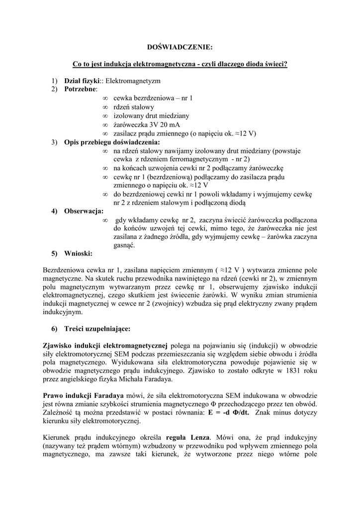 DOŚWIADCZENIE: Co to jest indukcja elektromagnetyczna - czyli dlaczego dioda świeci? 1) Dział fizyki:: Elektromagnetyzm 2) Potrzebne: • cewka bezrdzeniowa – nr 1 • rdzeń stalowy • izolowany drut miedziany • żaróweczka 3V 20 mA • zasilacz prądu zmiennego (o napięciu ok. ≈12 V) 3) Opis przebiegu doświadczenia: • na rdzeń stalowy nawijamy izolowany drut miedziany (powstaje cewka z rdzeniem ferromagnetycznym - nr 2) • na końcach uzwojenia cewki nr 2 podłączamy żaróweczkę • cewkę nr 1 (bezrdzeniową) podłączamy do zasilacza prądu zmiennego o napięciu ok. ≈12 V • do bezrdzeniowej cewki nr 1 powoli wkładamy i wyjmujemy cewkę nr 2 z rdzeniem stalowym i podłączoną diodą 4) Obserwacja: • gdy wkładamy cewkę nr 2, zaczyna świecić żaróweczka podłączona do końców uzwojeń tej cewki, mimo tego, że żaróweczka nie jest zasilana z żadnego źródła, gdy wyjmujemy cewkę – żarówka zaczyna gasnąć. 5) Wnioski: Bezrdzeniowa cewka nr 1, zasilana napięciem zmiennym ( ≈12 V ) wytwarza zmienne pole magnetyczne. Na skutek ruchu przewodnika nawiniętego na rdzeń (cewki nr 2), w zmiennym polu magnetycznym wytwarzanym przez cewkę nr 1, obserwujemy zjawisko indukcji elektromagnetycznej, czego skutkiem jest świecenie żarówki. W wyniku zmian strumienia indukcji magnetycznej w cewce nr 2 (zwojnicy) wzbudza się prąd elektryczny zwany prądem indukcyjnym. 6) Treści uzupełniające: Zjawisko indukcji elektromagnetycznej polega na pojawianiu się (indukcji) w obwodzie siły elektromotorycznej SEM podczas przemieszczania się względem siebie obwodu i źródła pola magnetycznego. Wyidukowana siła elektromotoryczna powoduje pojawienie się w obwodzie magnetycznego prądu indukcyjnego. Zjawisko to zostało odkryte w 1831 roku przez angielskiego fizyka Michała Faradaya. Prawo indukcji Faradaya mówi, że siła elektromotoryczna SEM indukowana w obwodzie jest równa zmianie szybkości strumienia magnetycznego Φ przechodzącego przez ten obwód. Zależność tą można przedstawić w postaci równania: E = -d Φ/dt. Znak minus dotyczy kierunku siły elektromotorycznej. Kierunek prądu indukcyjnego określa reguła Lenza. Mówi ona, że prąd indukcyjny (nazywany też prądem wtórnym) wzbudzony w przewodniku pod wpływem zmiennego pola magnetycznego, ma zawsze taki kierunek, że wytworzone przez niego wtórne pole magnetyczne przeciwdziała przyczynie (zmianie pierwotnego pola magnetycznego), która go wywołała. W.praktyce kierunek ten można wyznaczyć za pomocą tzw. reguły prawej dłoni: Jeżeli prawa dłoń ustawimy tak, aby linie sił pola padały na dłoń, a duży palec (kciuk) wskazywał kierunek ruchu przewodu, to pozostałe cztery palce wskażą kierunek indukowanej w przewodzie siły elektromotorycznej. Na przewód wiodący prąd I poruszający się w polu magnetycznym o indukcji B działa siła F skierowana przeciwnie do kierunku ruchu V. 7) Zastosowanie zjawiska indukcji: W urządzeniach elektrycznych: prądnicach, ach, generatorach w elektrowniach, transformatorach, piecach indukcyjnych, silnikach indukcyjnych i miernikach indukcyjnych, cewkach, głowicach elektromagnetycznych. 8) Interpretacja fizyczna zjawiska indukcji elektromagnetycznej: Rozważmy elektron poruszający się w polu magnetycznym z prędkością Ve w kierunku prostopadłym do linii pola magnetycznego o indukcji B. Prąd elektryczny polega na uporządkowanym ruchu elektronów, a kierunek jego przyjęto przeciwny do ruchu elektronów. Ponieważ poruszający się elektron wywołuje zjawisko przepływu prądu Ie, więc pole magnetyczne działa na elektron, poruszający się kierunku prostopadłym do linii sił pola magnetycznego, siłą elektrodynamiczną Fe. Kierunek tej siły można wyznaczyć jako przeciwny do kierunku wyznaczonego regułą lewej dłoni, gdyż elektron ma ładunek elektryczny ujemny. Na każdy elektron poruszany razem z przewodem, działa siła Fe występująca wzdłuż osi przewodu. Pod wpływem tej siły elektrony zostają przesunięte na koniec A przewodu i tam powstaje potencjał ujemny, na drugim zaś końcu B występuje potencjał dodatni, wytworzony przez niezrównoważone jony dodatnie nie mające możliwości poruszania się w obrębie przewodu. Ta różnica potencjałów na końcach przewodu AB wyznacza SEM (siłę elektromotoryczną) powstałą w tym przewodzie o kierunku od A do B. Otrzymana siła elektromotoryczna, występująca między końcami tego przewodu, w czasie jego ruchu w polu magnetycznym, nazywa się siłą elektromotoryczną indukcji. Wynika z tego, że siła elektromotoryczna indukcji jest indukowana w przewodzie tylko, gdy kierunek poruszania się przewodu nie jest zgodny z kierunkiem działania pola magnetycznego (nie „ślizga: się wzdłuż linii pola), gdyż wtedy na elektrony w przewodzie nie będzie działała siła Fe. 9) Linki: http://pl.wikipedia.org/wiki/Regu%C5%82a_prawej_d%C5%82oni http://pl.wikipedia.org/wiki/Indukcja_magnetyczna http://pl.wikipedia.org/wiki/Indukcja_elektromagnetyczna http://sciaga.onet.pl/0,60,165,100,0,katalog2.html http://fizyka.biz/104_elektromagnetyzm.html 10) Literatura: • • • „Podstawy elektrotechniki” – cz I, Tadeusz Masewicz, Stanisław Paul, Państwowe Wydawnictwa Szkolnictwa Zawodowego ,,Elektryczność i magnetyzm’’- Wojciech Michalski ,,Fizyka dla inżynierów’’- Jerzy i Michalina Massalscy 11) Skład zespołu: Patryk Babula 1a – Jakub Dumanowski klasa I a Szkoła: Gimnazjum nr 3 w Nysie – ul. Kościuszki 10 48-300 Nysa Nauczyciel: Beata Krzan Nazwa grupy: G-3-NYS-OPO numer grupy: 6