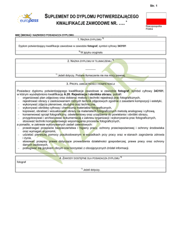 Str. 1 SUPLEMENT DO DYPLOMU POTWIERDZAJĄCEGO KWALIFIKACJE ZAWODOWE NR. …. * Rzeczpospolita Polska IMIĘ (IMIONA) I NAZWISKO POSIADACZA DYPLOMU…………………………………………………………………………………… 1. NAZWA DYPLOMU 1) Dyplom potwierdzający kwalifikacje zawodowe w zawodzie fotograf, symbol cyfrowy 343101 1) W języku oryginału 2. NAZWA DYPLOMU W TŁUMACZENIU 1) _______ 1) Jeżeli dotyczy. Podane tłumaczenie nie ma mocy prawnej. 3. PROFIL UMIEJĘTNOŚCI I KOMPETENCJI Posiadacz dyplomu potwierdzającego kwalifikacje zawodowe w zawodzie fotograf, symbol cyfrowy 343101, w którym wyodrębniono kwalifikację A.20. Rejestracja i obróbka obrazu, potrafi: – organizować plan zdjęciowy oraz dobierać metody i techniki rejestracji prac fotograficznych, – rejestrować obrazy z zastosowaniem różnych technik zdjęciowych zgodnie z zasadami kompozycji i estetyki, – wykonywać zdjęcia plenerowe, studyjne oraz techniczne, – wykonywać obróbkę cyfrową i chemiczną materiałów fotograficznych, – kopiować, obrabiać i wizualizować obrazy na materiałach fotograficznych metodą analogową i cyfrową, – konserwować sprzęt fotograficzny, oświetleniowy oraz urządzenia do powielania i obróbki obrazu, – przygotowywać i archiwizować dokumentację z zakresu organizacji i wykonywania prac fotograficznych, – stosować techniki komputerowego wspomagania procesów fotograficznych, a ponadto, w zakresie wykonywanych zadań zawodowych: – przestrzegać przepisów bezpieczeństwa i higieny pracy, ochrony przeciwpożarowej i ochrony środowiska oraz wymagań ergonomii, – udzielać pierwszej pomocy poszkodowanym w wypadkach przy pracy oraz w stanach zagrożenia zdrowia i życia, – stosować przepisy prawa dotyczące prowadzenia działalności gospodarczej, prawa pracy oraz ochrony danych osobowych, – posługiwać się językiem obcym oraz korzystać z obcojęzycznych źródeł informacji. 4. ZAWODY DOSTĘPNE DLA POSIADACZA DYPLOMU fotograf 1) Jeżeli dotyczy. 1) Str. 2 5.PODSTAWA WYDANIA DYPLOMU Nazwa podmiotu wydającego dyplom Okręgowa Komisja Egzaminacyjna w …………………………. Nazwa władz sprawujących nadzór nad podmiotem wydającym dyplom Minister Edukacji Narodowej Poziom wykształcenia (krajowy lub międzynarodowy) ISCED 3 Warunki zdania egzaminu potwierdzającego kwalifikacje w zawodzie Egzamin przeprowadzany jest z każdej kwalifikacji wyodrębnionej w zawodzie. Warunkiem zdania egzaminu zawodowego, złożonego z dwóch części, jest uzyskanie: 1) z części pisemnej - co najmniej 50% punktów możliwych do uzyskania, 2) z części praktycznej - co najmniej 75% punktów możliwych do uzyskania. Dostęp do następnego poziomu kształcenia Posiadacz dyplomu może kontynuować kształcenie począwszy od klasy drugiej liceum ogólnokształcącego dla dorosłych. Umowy międzynarodowe _______ Podstawa prawna wydania dyplomu stosowne rozporządzenie 6. OFICJALNIE UZNANE SPOSOBY UZYSKANIA DYPLOMU Posiadacz dyplomu uzyskał wykształcenie zasadnicze zawodowe oraz zdał egzamin potwierdzający kwalifikację A.20. Rejestracja i obróbka obrazu w zawodzie fotograf. Kwalifikacja wyodrębniona w tym zawodzie jest możliwa do uzyskania w ramach poniższych sposobów nabywania kwalifikacji: Możliwe sposoby nabywania kwalifikacji w zawodzie fotograf Udział kształcenia teoretycznego/praktycznego (%) Kształcenie w szkole (3-letnia zasadnicza szkoła zawodowa) Kształcenie ustawiczne w formach pozaszkolnych (minimalna liczba godzin kształcenia określona w podstawie programowej kształcenia w zawodach) Potwierdzanie kwalifikacji w trybie egzaminów eksternistycznych dla osób, które ukończyły gimnazjum albo 8-letnią szkołę podstawową oraz: a) co najmniej 2 lata kształciły się w zawodzie lub b) co najmniej 2 lata pracowały w zawodzie 40/60 40/60 40/60 0/100 Informacje dodatkowe: Okręgowa Komisja Egzaminacyjna w ………………………, e-mail: Więcej informacji (w tym opis krajowego systemu kwalifikacji) można znaleźć w Internecie pod adresem: www.men.gov.pl, www.koweziu.edu.pl Krajowy punkt informacyjny: www.europass.org.pl *Nota objaśniająca Niniejszy dokument ma na celu dostarczenie dodatkowych informacji na temat dyplomu potwierdzającego kwalifikacje zawodowe i sam w sobie nie ma mocy prawnej. Podstawą opisu są następujące teksty: Rezolucja Rady nr 93/C 49/01 z dnia 3 grudnia 1992 r. dotycząca przejrzystości kwalifikacji, Rezolucja Rady nr 96/C 224/04 z dnia 15 lipca 1996 r. dotycząca przejrzystości dyplomów szkolenia zawodowego, Zalecenie Parlamentu Europejskiego oraz Rady nr 2001/613/EC z dnia 10 lipca 2001 r. w sprawie mobilności w ramach Wspólnoty studentów, osób przechodzących szkolenia, wolontariuszy, nauczycieli i instruktorów. Więcej informacji można uzyskać pod adresem: http://europass.cedefop.eu.int © European Communities 2002