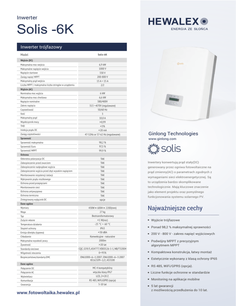 Inwerter Solis -6K Inwerter trójfazowy Model Solis-6K Wejście (DC) Maksymalna moc wejścia 6,9 kW Maksymalne napięcie wejścia 1000 V 330 V Napięcie startowe Zasięg napięć MPPT 200-800 V Maksymalny prąd wejścia 15 A + 15 A Liczba MPPT / maksymalna liczba stringów w urządzeniu 2/2 Wyjście (AC) 6 kW Nominalna moc wyjścia 6,6 kW Maksymalna moc chwilowa 380/400V Napięcie nominalne 313 ~470V (regulowane) Zakres napięcia 50/60 Hz Częstotliwość Ilość 3 Maksymalny prąd 10,0 A Współczynnik mocy >0,99 THD <3% Iniekcja prądu DC <20 mA Zasięg częstotliwości 47-52Hz or 57-62 Hz (regulowane) Ginlong Technologies www.ginlong.com Sprawność 98,2 % 97,3 % 99,9 % Sprawność maksymalna Sprawność Euro Sprawność MPPT Ochrona TAK TAK TAK TAK TAK TAK TAK TAK TAK TAK opcje Odwrotna polaryzacja DC Zabezpieczenie przed zwarciem Zabezpieczenie nadprądowe wyjścia Zabezpieczenie wyjścia przed zbyt wysokim napięciem Monitorowanie rezystencji izolacji Wykrywanie prądu resztkowego Ochrona przed przepięciami Monitorowanie sieci Ochrona antywyspowa Ochrona termiczna Zintegrowany wyłącznik DC Dane ogólne Wymiary Waga Typ Zużycie własne Temperatura działania Stopień ochrony Emisja dźwięku (typowa) Chłodzenie Maksymalna wysokość pracy Żywotność Standardy sieciowe Wilgotność otoczenia 430W 600H 220D(mm) 27 kg Beztransformatorowy <1 W(noc) -25 °C ~ 60 °C IP65 <30 dBA Konwekcyjne - naturalne 2000m >20 lat CQC, G59/3, AS4777, VDE0126-1-1, NB/T32004 0~95% Bezpieczeństwo/standarty EMC * * EN61000–6–1:2007; EN61000–6–3:2007 IEC62109–1/2; AS3100 Dane ogólne Połączenie DC Połączenie AC Wyświetlacz Komunikacja Gwarancja www.fotowoltaika.hewalex.pl MC-4 kompatybilny wtyczka klasy IP67 LCD, 2×20 Z. RS 485, WiFi/GPRS (opcja) 5-10 lat Inwertery konwertują prąd stały(DC) generowany przez ogniwa fotowoltaiczne na prąd zmienny(AC) o parametrach zgodnych z wymaganiami sieci elektroenergetycznej. Są to urządzenia bardzo skomplikowane technologicznie. Mają kluczowe znaczenie jako element projektu oraz pomyślnego funkcjonowania systemu solarnego PV. Najważniejsze cechy Wyjście trójfazowe Ponad 98,2 % maksymalnej sprawności 200 V - 800 V - zakres napięć wyjściowych Podwójny MPPT z precyzyjnym algorytmem MPPT Kompaktowa konstrukcja, łatwy montaż Estetycznie wykonany z klasą ochrony IP65 RS 485, WiFi/GPRS (opcja). Liczne funkcje ochronne w standardzie Monitoring na aplikacje mobilne 5 lat gwarancji z możliwością przedłużenia do 10 lat.