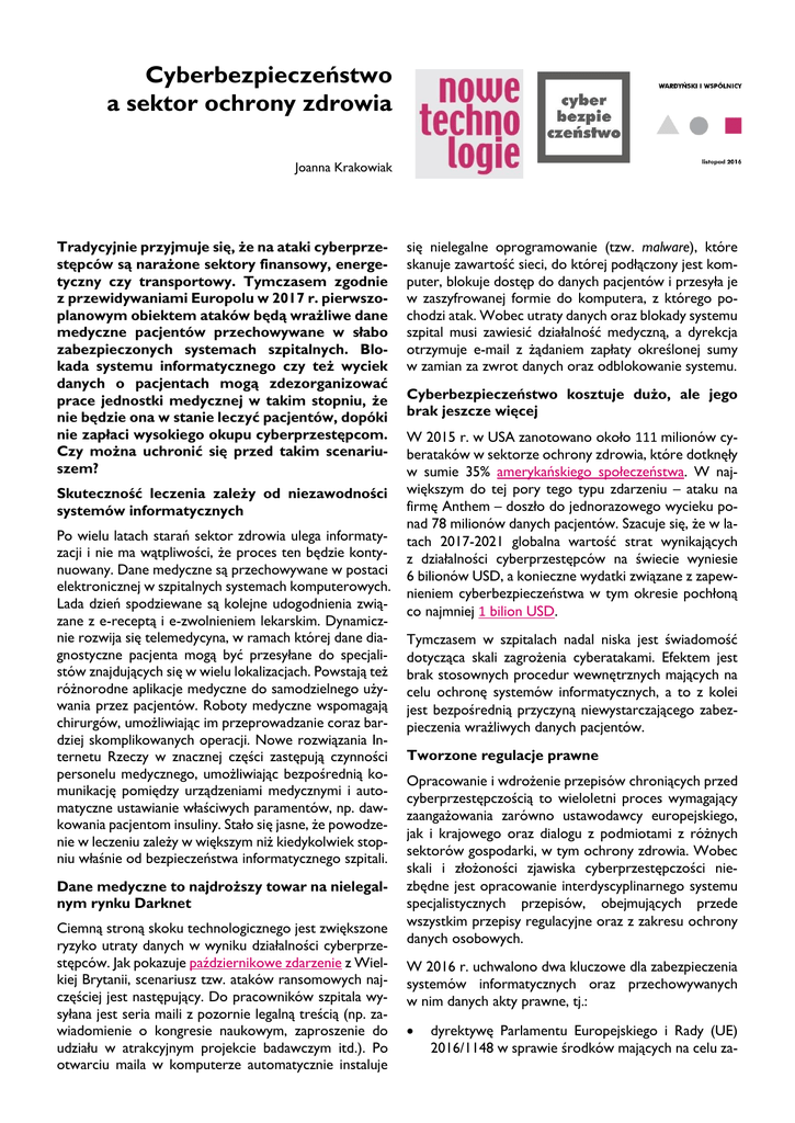 Cyberbezpieczeństwo a sektor ochrony zdrowia Joanna Krakowiak Tradycyjnie przyjmuje się, że na ataki cyberprzestępców są narażone sektory finansowy, energetyczny czy transportowy. Tymczasem zgodnie z przewidywaniami Europolu w 2017 r. pierwszoplanowym obiektem ataków będą wrażliwe dane medyczne pacjentów przechowywane w słabo zabezpieczonych systemach szpitalnych. Blokada systemu informatycznego czy też wyciek danych o pacjentach mogą zdezorganizować prace jednostki medycznej w takim stopniu, że nie będzie ona w stanie leczyć pacjentów, dopóki nie zapłaci wysokiego okupu cyberprzestępcom. Czy można uchronić się przed takim scenariuszem? Skuteczność leczenia zależy od niezawodności systemów informatycznych Po wielu latach starań sektor zdrowia ulega informatyzacji i nie ma wątpliwości, że proces ten będzie kontynuowany. Dane medyczne są przechowywane w postaci elektronicznej w szpitalnych systemach komputerowych. Lada dzień spodziewane są kolejne udogodnienia związane z e-receptą i e-zwolnieniem lekarskim. Dynamicznie rozwija się telemedycyna, w ramach której dane diagnostyczne pacjenta mogą być przesyłane do specjalistów znajdujących się w wielu lokalizacjach. Powstają też różnorodne aplikacje medyczne do samodzielnego używania przez pacjentów. Roboty medyczne wspomagają chirurgów, umożliwiając im przeprowadzanie coraz bardziej skomplikowanych operacji. Nowe rozwiązania Internetu Rzeczy w znacznej części zastępują czynności personelu medycznego, umożliwiając bezpośrednią komunikację pomiędzy urządzeniami medycznymi i automatyczne ustawianie właściwych paramentów, np. dawkowania pacjentom insuliny. Stało się jasne, że powodzenie w leczeniu zależy w większym niż kiedykolwiek stopniu właśnie od bezpieczeństwa informatycznego szpitali. Dane medyczne to najdroższy towar na nielegalnym rynku Darknet Ciemną stroną skoku technologicznego jest zwiększone ryzyko utraty danych w wyniku działalności cyberprzestępców. Jak pokazuje październikowe zdarzenie z Wielkiej Brytanii, scenariusz tzw. ataków ransomowych najczęściej jest następujący. Do pracowników szpitala wysyłana jest seria maili z pozornie legalną treścią (np. zawiadomienie o kongresie naukowym, zaproszenie do udziału w atrakcyjnym projekcie badawczym itd.). Po otwarciu maila w komputerze automatycznie instaluje się nielegalne oprogramowanie (tzw. malware), które skanuje zawartość sieci, do której podłączony jest komputer, blokuje dostęp do danych pacjentów i przesyła je w zaszyfrowanej formie do komputera, z którego pochodzi atak. Wobec utraty danych oraz blokady systemu szpital musi zawiesić działalność medyczną, a dyrekcja otrzymuje e-mail z żądaniem zapłaty określonej sumy w zamian za zwrot danych oraz odblokowanie systemu. Cyberbezpieczeństwo kosztuje dużo, ale jego brak jeszcze więcej W 2015 r. w USA zanotowano około 111 milionów cyberataków w sektorze ochrony zdrowia, które dotknęły w sumie 35% amerykańskiego społeczeństwa. W największym do tej pory tego typu zdarzeniu – ataku na firmę Anthem – doszło do jednorazowego wycieku ponad 78 milionów danych pacjentów. Szacuje się, że w latach 2017-2021 globalna wartość strat wynikających z działalności cyberprzestępców na świecie wyniesie 6 bilionów USD, a konieczne wydatki związane z zapewnieniem cyberbezpieczeństwa w tym okresie pochłoną co najmniej 1 bilion USD. Tymczasem w szpitalach nadal niska jest świadomość dotycząca skali zagrożenia cyberatakami. Efektem jest brak stosownych procedur wewnętrznych mających na celu ochronę systemów informatycznych, a to z kolei jest bezpośrednią przyczyną niewystarczającego zabezpieczenia wrażliwych danych pacjentów. Tworzone regulacje prawne Opracowanie i wdrożenie przepisów chroniących przed cyberprzestępczością to wieloletni proces wymagający zaangażowania zarówno ustawodawcy europejskiego, jak i krajowego oraz dialogu z podmiotami z różnych sektorów gospodarki, w tym ochrony zdrowia. Wobec skali i złożoności zjawiska cyberprzestępczości niezbędne jest opracowanie interdyscyplinarnego systemu specjalistycznych przepisów, obejmujących przede wszystkim przepisy regulacyjne oraz z zakresu ochrony danych osobowych. W 2016 r. uchwalono dwa kluczowe dla zabezpieczenia systemów informatycznych oraz przechowywanych w nim danych akty prawne, tj.: dyrektywę Parlamentu Europejskiego i Rady (UE) 2016/1148 w sprawie środków mających na celu za- pewnienie wspólnego wysokiego poziomu bezpieczeństwa sieci i informacji na terytorium Unii (dyrektywa NIS), oraz W największym uproszczeniu, zgodnie z normą NIST 800-61, kroki do zapewnienia cyberbezpieczeństwa są następujące. rozporządzenie Parlamentu Europejskiego i Rady (UE) 2016/679 w sprawie ochrony osób fizycznych w związku z przetwarzaniem danych osobowych i w sprawie swobodnego przepływu takich danych oraz uchylenia dyrektywy 95/46/WE (ogólne rozporządzenie o ochronie danych). 1. Przygotowanie. To kluczowy i czasochłonny krok wymagający zidentyfikowania potencjalnych źródeł incydentów komputerowych, zbadania słabych stron zabezpieczenia komputerów i ich sieci, wyznaczenia osób odpowiedzialnych za zapewnienie cyberbezpieczeństwa (np. wyznaczenia wewnętrznego lub zewnętrznego Zespołu Reagowania na Incydenty Bezpieczeństwa Komputerowego (CSIRT)) wraz z określeniem zakresów odpowiedzialności poszczególnych osób oraz opracowaniem procedur postępowania i zasad raportowania w przypadku zaistnienia incydentu. Jak pisaliśmy w poprzednich publikacjach, dyrektywa NIS ma na celu stworzenie ram prawnych i instytucjonalnych w zakresie cyberbezpieczeństwa. Obliguje ona państwa UE do opracowania krajowych strategii bezpieczeństwa cybernetycznego, zidentyfikowania operatorów tzw. kluczowej infrastruktury (m.in. szpitali) oraz zbudowania krajowych systemów reagowania na cyberataki opartych o Ze