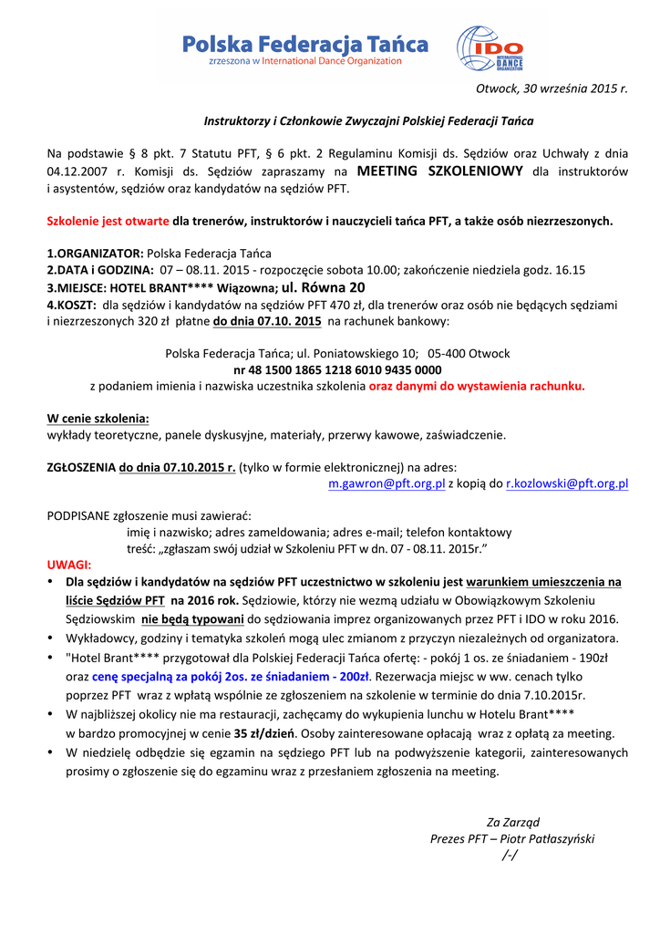 Otwock, 30 września 2015 r. Instruktorzy i Członkowie Zwyczajni Polskiej Federacji Tańca Na podstawie § 8 pkt. 7 Statutu PFT, § 6 pkt. 2 Regulaminu Komisji ds. Sędziów oraz Uchwały z dnia 04.12.2007 r. Komisji ds. Sędziów zapraszamy na MEETING SZKOLENIOWY dla instruktorów i asystentów, sędziów oraz kandydatów na sędziów PFT. Szkolenie jest otwarte dla trenerów, instruktorów i nauczycieli tańca PFT, a także osób niezrzeszonych. 1.ORGANIZATOR: Polska Federacja Tańca 2.DATA i GODZINA: 07 – 08.11. 2015 -‐ rozpoczęcie sobota 10.00; zakończenie niedziela godz. 16.15 3.MIEJSCE: HOTEL BRANT**** Wiązowna; ul. Równa 20 4.KOSZT: dla sędziów i kandydatów na sędziów PFT 470 zł, dla trenerów oraz osób nie będących sędziami i niezrzeszonych 320 zł płatne do dnia 07.10. 2015 na rachunek bankowy: Polska Federacja Tańca; ul. Poniatowskiego 10; 05-‐400 Otwock nr 48 1500 1865 1218 6010 9435 0000 z podaniem imienia i nazwiska uczestnika szkolenia oraz danymi do wystawienia rachunku. W cenie szkolenia: wykłady teoretyczne, panele dyskusyjne, materiały, przerwy kawowe, zaświadczenie. ZGŁOSZENIA do dnia 07.10.2015 r. (tylko w formie elektronicznej) na adres: [email protected] z kopią do [email protected] PODPISANE zgłoszenie musi zawierać: imię i nazwisko; adres zameldowania; adres e-‐mail; telefon kontaktowy treść: „zgłaszam swój udział w Szkoleniu PFT w dn. 07 -‐ 08.11. 2015r.” UWAGI: • Dla sędziów i kandydatów na sędziów PFT uczestnictwo w szkoleniu jest warunkiem umieszczenia na liście Sędziów PFT na 2016 rok. Sędziowie, którzy nie wezmą udziału w Obowiązkowym Szkoleniu Sędziowskim nie będą typowani do sędziowania imprez organizowanych przez PFT i IDO w roku 2016. • Wykładowcy, godziny i tematyka szkoleń mogą ulec zmianom z przyczyn niezależnych od organizatora. • "Hotel Brant**** przygotował dla Polskiej Federacji Tańca ofertę: -‐ pokój 1 os. ze śniadaniem -‐ 190zł oraz cenę specjalną za pokój 2os. ze śniadaniem -‐ 200zł. Rezerwacja miejsc w ww. cenach tylko poprzez PFT wraz z wpłatą wspólnie ze zgłoszeniem na szkolenie w terminie do dnia 7.10.2015r. • W najbliższej okolicy nie ma restauracji, zachęcamy do wykupienia lunchu w Hotelu Brant**** w bardzo promocyjnej w cenie 35 zł/dzień. Osoby zainteresowane opłacają wraz z opłatą za meeting. • W niedzielę odbędzie się egzamin na sędziego PFT lub na podwyższenie kategorii, zainteresowanych prosimy o zgłoszenie się do egzaminu wraz z przesłaniem zgłoszenia na meeting. Za Zarząd Prezes PFT – Piotr Patłaszyński /-‐/ HARMONOGRAM* WYKŁADÓW MEETINGU SZKOLENIOWEGO` 2015 07 – 08.10.2015 -‐ HOTEL BRANT****, Majdan ul. Równa 20 sobota -‐ 07.11.2015 10.00 – 11.00 rejestracja uczestników Ryszard Kozłowski & Michał Gawron niedziela -‐ 08.11.2015 09.30 – 10.30 informacje, nowości PFT Piotr Patłaszyński, Ryszard Kozłowski HIP HOP 11.00 – 12.15 wykład + panel dyskusyjny SZYMON KOWALEWSKI 10.30 – 10.45 przerwa kawowa 12.15 – 12.30 przerwa kawowa BALLET/POINTE 10.45 – 12.00 wykład + panel dyskusyjny MARIA ZAJDLER BREAK DANCE, ELECTRIC BOOGIE 12.30 – 13.45 wykład + panel dyskusyjny MARCIN KONOPACKI SHOW DANCE 12.00 – 13.15 wykład + panel dyskusyjny KATARZYNA BRYŁKA 13.45 – 14.45 przerwa obiadowa 13.15 – 14.15 przerwa obiadowa PRZEPISY IDO DOKUMENTACJA SĘDZIOWSKA 14.45 – 15.45 wykład + panel dyskusyjny ANDRZEJ KUŹNICKI MODERN & JAZZ różnice, rozpoznawanie, jak oceniać i 14.15 – 16.15 oddzielać wykład + panel dyskusyjny PIOTR GALIŃSKI COUPLE DANCE 15.45 – 17.00 wykład + panel dyskusyjny CONRAD DĄBSKI 17.00 – 17.15 przerwa kawowa zakończenie meetingu, odbiór 16.15 – 16.30 certyfikatów, przygotowanie sali do egzaminu sędziowskiego PFT egzaminy sędziowskie PFT 16.30 – 17.45 Piotr Patłaszyński, Andrzej Kuźnicki Ryszard Kozłowski STREET DANCE SHOW 17.15 – 18.30 wykład + panel dyskusyjny KATARZYNA MIECZKOWSKA -‐ -‐ DISCO DANCE & FREESTYLE 18.30 – 19.45 wykład + panel dyskusyjny NANCY GOGSTADT -‐ NORWAY -‐ -‐ Oczekujemy pełnego zaangażowania od uczestników szkolenia, prosimy nie opuszczać wykładów. * Zastrzegamy prawo do zmian godzinowych i wykładowców Wszelkie pytania prosimy kierować do Prezesa PFT – Piotr Patłaszyński [email protected]