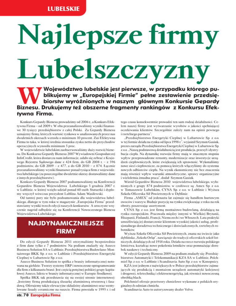 LUBELSKIE Najlepsze firmy Lubelszczyzny Województwo lubelskie jest pierwsze, w przypadku którego publikujemy w „Europejskiej Firmie” pełne zestawienie przedsiębiorstw wyróżnionych w naszym głównym Konkursie Gepardy Biznesu. Drukujemy też obszerne fragmenty rankingów z Konkursu Efektywna Firma. Konkurs Gepardy Biznesu prowadzimy od 2006 r., a Konkurs Efektywna Firma – od 2009 r. W obu przeanalizowaliśmy wyniki finansowe 30 tysięcy przedsiębiorstw z całej Polski. Za Gepardy Biznesu uznajemy firmy, których wartość rynkowa w analizowanych przez nas dwuletnich okresach wzrosła o minimum 10 procent. Zaś Efektywna Firma to taka, w której średnia stosunku zysku netto do przychodów operacyjnych wynosiła minimum 5 proc. W województwie lubelskim zaobserwowaliśmy duży rozwój biznesu. Do Konkursu Gepardy Biznesu 2007 Wywiadowni Gospodarczej InfoCredit, która dostarcza nam informacje, udało się zebrać z Krajowego Rejestru Sądowego dane z 424 firm, do GB 2008 r. – z 596 podmiotów, do GB 2009 – z 477, a do GB 2010 – z 874. Łącznie przeanalizowaliśmy wyniki finansowe ponad tysiąca firm z województwa lubelskiego (za poszczególne dwuletnie okresy dostawaliśmy dane z innych przedsiębiorstw). Konkurs Gepardy Biznesu 2007 podsumowaliśmy na Konferencji Gepardów Biznesu Województwa Lubelskiego 5 grudnia 2007 r. w Lublinie, w której wzięło udział ponad 60 osób. Statuetki i dyplomy wręczył wówczas prezydent Lublina Adam Wasilewski. Od tamtej pory nie było podsumowania dla województwa lubelskiego, dlatego w tym roku w magazynie „Europejska Firma” przedstawiamy wyniki trzech edycji naszych konkursów. A uroczyste wręczenie nagród odbędzie się na Konferencji Nowoczesnego Biznesu Województwa Lubelskiego. NAJDYNAMICZNIEJSZE FIRMY Do edycji Gepardy Biznesu 2011 otrzymaliśmy bezpośrednio z firm dane tylko z 7 podmiotów. Na podium znalazły się Asseco Business Solution SA w Lublinie, Przedsiębiorstwa Budowlano-Montażowego BKK Sp. z o.o. w Lublinie i Przedsiębiorstwo Energetyki Cieplnej w Lubartowie Sp. z o.o. Asseco Business Solution to spółka z branży informatycznej notowana na giełdzie. Tworzy systemy ERP i nowoczesne oprogramowanie dla firm z kilkunastu branż. Jest częścią potężnej polskiej grupy kapitałowej Asseco, lidera w branży informatycznej w Europie Środkowej. Spółka BKK tak przedstawia się na swojej stronie internetowej: „Jesteśmy firmą produkującą ślusarkę aluminiową otworową i fasadową. Oferujemy także elewacyjne okładziny aluminiowe oraz wentylowane fasady ceramiczne na ruszcie. Firma powstała w 1995 r. i od str. 70 Europejska Firma tego czasu konsekwentnie prowadzi ten sam rodzaj działalności. Celem naszej firmy jest wytwarzanie wyrobów o jakości spełniającej oczekiwania klientów. Szczególnie zależy nam na opinii pewnego i rzetelnego partnera”. „Przedsiębiorstwo Energetyki Cieplnej w Lubartowie Sp. z o.o. w tej formie działa na rynku od lipca 1998 r.”, wyjaśnił Szymon Gasiuk, prezes zarządu Przedsiębiorstwa Energetyki Cieplnej w Lubartowie Sp. z o.o. „Naszą podstawową działalnością jest produkcja, przesył i dystrybucja ciepła. Na dynamikę rozwoju firmy mają w znacznym stopniu wpływ przeprowadzone remonty, modernizacje oraz inwestycje urządzeń ciepłowniczych, które zwiększają ich sprawność. Wykonaliśmy nowe sieci ciepłownicze, za pomocą których włączyliśmy do systemu nowych odbiorców ciepła. Na wynik ekonomiczny nie bez znaczenia mają również wpływ warunki atmosferyczne, sprawy organizacyjne i wieloletnia żmudna praca”, dodał Szymon Gasiuk. Wśród Gepardów Biznesu 2010 województwa lubelskiego, wyłonionych z grupy 874 podmiotów, w czołówce są: Amex Sp. z o.o. w Tomaszowie Lubelskim, CYNA Sp. z o.o. w Lublinie i Wyższa Szkoła Oficerska Sił Powietrznych w Dęblinie. Firma „AMEX” od jedenastu lat zajmuje się handlem hurtowym owoców i warzyw. Buduje pozycję na rynku zwiększając z roku na rok obroty, poszerzając asortyment. CYNA Sp. z o.o. jest firmą montażowo-budowlaną, działającą na rynku europejskim. Pracowała między innymi w Wielkiej Brytanii, Hiszpanii, Finlandii, Francji, Niemczech i we Włoszech. Lata praktyki umożliwiają jej dostarczenie klientom wysokiej jakości usług, profesjonalnego doradztwa technicznego i doświadczonych, rzetelnych robotników. Wyższa Szkoła Oficerska Sił Powietrznych, znana na świecie jako dęblińska „Szkoła Orląt”, nawiązuje do tradycji oficerskich szkół lotniczych, działających od 1918 roku. Działa na rzecz rozwoju polskiego lotnictwa, kształcąc nowe pokolenia lotników oraz pomnażając dorobek naukowy i techniczny. W edycji Gepardy Biznesu 2009 na podium znalazły się: Przedsiębiorstwo Automatyki i Telekomunikacji KZA SA w Lublinie, Polchmiel Sp. z o.o. w Lublinie i Scandinavia Auto Sp. z o.o. w Konopnicy. KZA jest jednym z największych w Polsce przedsiębiorstw zajmujących się produkcją i montażem urządzeń automatyki kolejowej i drogowej, teletechniką i elektroenergetyką, jak również nowoczesną obróbką blach. Polchmiel oferuje przetwory chmielowe wykonane z polskich oryginalnych odmian chmielu. Scandinavia Auto to autoryzowany dealer Volvo. LUBELSKIE W Konkursie Gepardy Biznesu 2008 w czołówce są trzy lubelskie firmy: Budo-Term S.J., znowu KZA SA i Gildia Sp. z o.o. Budo-Term sprzedaje materiały elewacyjne i wykonuje prace dociepleniowe, które prowadzi zgodnie z wymogami zawartymi w instrukcjach wykonywania elewacji w bezspoinowym systemie ociepleń. Gildia zajmuje się kompleksową realizacją projektów technicznokonsultingowych głównie w dziedzinach elektroniki, elektromechaniki i informatyki dla jednostek centralnych administracji publicznej. NAJEFEKTYWNIEJSZE PRZEDSIĘBIORSTWA W trzech edycjach Konkursu Efektywna Firma w województwie lubelskim na pierwszym miejscu zawsze była Państwowa Szkoła Wyższa im. Papieża Jana Pawła II