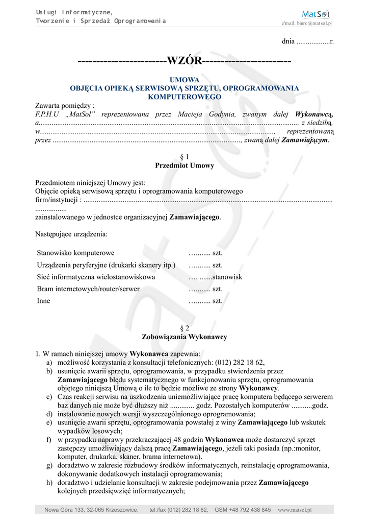 Us ł ugi I nf or mat yczne, Twor zeni e i Spr zedaż Opr ogr amowani a e'mail: [email protected] dnia ..................r. ------------------------WZÓR-----------------------UMOWA OBJĘCIA OPIEKĄ SERWISOWĄ SPRZĘTU, OPROGRAMOWANIA KOMPUTEROWEGO Zawarta pomiędzy : F.P.H.U „MatSol” reprezentowana przez Macieja Godynia, zwanym dalej Wykonawcą, a............................................................................................................................................ z siedzibą, w.............................................................................................................................., reprezentowaną przez ....................................................................................................., zwaną dalej Zamawiającym. §1 Przedmiot Umowy Przedmiotem niniejszej Umowy jest: Objęcie opieką serwisową sprzętu i oprogramowania komputerowego firm/instytucji : ...................................................................................................................................... ................. zainstalowanego w jednostce organizacyjnej Zamawiającego. Następujące urządzenia: Stanowisko komputerowe …........ szt. Urządzenia peryferyjne (drukarki skanery itp.) …........ szt. Sieć informatyczna wielostanowiskowa …. .......stanowisk Bram internetowych/router/serwer …........ szt. Inne …........ szt. §2 Zobowiązania Wykonawcy 1. W ramach niniejszej umowy Wykonawca zapewnia: a) możliwość korzystania z konsultacji telefonicznych: (012) 282 18 62, b) usunięcie awarii sprzętu, oprogramowania, w przypadku stwierdzenia przez Zamawiającego błędu systematycznego w funkcjonowaniu sprzętu, oprogramowania objętego niniejszą Umową o ile to będzie możliwe ze strony Wykonawcy. c) Czas reakcji serwisu na uszkodzenia uniemożliwiające pracę komputera będącego serwerem baz danych nie może być dłuższy niż ............. godz. Pozostałych komputerów ...........godz. d) instalowanie nowych wersji wyszczególnionego oprogramowania; e) usunięcie awarii sprzętu, oprogramowania powstałej z winy Zamawiającego lub wskutek wypadków losowych; f) w przypadku naprawy przekraczającej 48 godzin Wykonawca może dostarczyć sprzęt zastępczy umożliwiający dalszą pracę Zamawiającego, jeżeli taki posiada (np.:monitor, komputer, drukarka, skaner, brama internetowa). g) doradztwo w zakresie rozbudowy środków informatycznych, reinstalację oprogramowania, dokonywanie dodatkowych instalacji oprogramowania; h) doradztwo i udzielanie konsultacji w zakresie podejmowania przez Zamawiającego kolejnych przedsięwzięć informatycznych; Nowa Góra 133, 32-065 Krzeszowice, tel./fax (012) 282 18 62, GSM +48 792 438 845 www.matsol.pl Us ł ugi I nf or mat yczne, Twor zeni e i Spr zedaż Opr ogr amowani a e'mail: [email protected] i) bieżące optymalizowanie konfiguracji oprogramowania i sprzętu komputerowego, uwzględniające potrzeby Zamawiającego; j) awaryjne odtwarzanie, na wniosek Zamawiającego, stanu oprogramowania i zgromadzonych danych archiwalnych, poprawnie zabezpieczonych; k) weryfikowanie stosowanych zabezpieczeń przed wtargnięciem tzw. „wirusa komputerowego” do systemu informatycznego Zamawiającego lub osób niepowołanych; l) kwartalne przeglądy konserwacyjne urządzeń komputerowych wraz z prowadzeniem dokumentacji serwisowej, m) kwartalne archiwizowanie danych na wymienionych w umowie stanowiskach komputerowych (jeżeli jest taka potrzeba), n) zaopatrywanie w materiały eksploatacyjne (papier, tonery, tusze do drukarek), prowadzenie inwentaryzacji elementów eksploatacyjnych, o) zaopatrywanie w sprzęt oraz podzespoły komputerowe (nowe jednostki komputerowe, urządzenia peryferyjne,sprzęt sieciowy), p) monitoring sieci informatycznej wraz z dostępem do Internetu, taka jest),jeżeli q) polityka prywatności – zabezpieczenie poufnych danych, r) sporządzenie i prowadzenie dokumentacji serwisowanego sprzętu wraz z oprogramowaniem. §3 Zobowiązania Zamawiającego 1. W ramach niniejszej umowy Zamawiający jest zobowiązany do: a) wyznaczenia osoby odpowiedzialnej za realizację całości niniejszej Umowy serwisowej; b) dokonywania czynności zaleconych przez Wykonawcę, w szczególności czynności związanych z bezpieczeństwem pracy systemu; c) c) nie dokonywania żadnych zmian w konfiguracji oprogramowania i sprzętu komputerowego, objętych niniejszą Umową; d) w przypadku uszkodzenia sprzętu po gwarancji, bądź od innego dostawcy uiszczenie opłaty za naprawę lub wymianę. Wartość sprzętu bądź naprawy będzie każdorazowo negocjowana. e) zapewnienia możliwości dostępu do stacji roboczych i komputerów będących serwerami baz danych w celach serwisowych. §4 Płatności 1. Za realizację przedmiotu Umowy, opisanego w §1, Zamawiający zapłaci Wykonawcy w każdym miesiącu trwania umowy kwotę w wysokości: ……….. zł (netto) : ………… zł (brutto) (słownie: ............................................................................................) 2. Przewidywana ilość wizyt serwisowych w miesiącu to ………… interwencje, w przypadku częstszych wizyt interwencyjnych koszty dojazdu są negocjowane. 3. Wszystkie należności zostaną zapłacone przez Zamawiającego przelewem na konto Wykonawcy w terminie 7 dni i od daty wystawienia odpowiednich faktur. 4. W przypadku nie zapłacenia przez Zamawiającego w ustalonym terminie należności wymienionych w §4 pkt.1 Wykonawca naliczy odsetki w wysokości ustawowej. 5. Faktura za opiekę serwisową będzie wystawiana ostatniego dnia miesiąca lub w przypadku dnia wolnego od pracy w najbliższy dzień roboczy. 6. Zmiana ilości komputerów objętych opieką serwisową, która ma miejsce w trakcie miesiąca zostaje uwzględniona dopiero w kolejnym miesiącu. W przypadku zwiększenia ilości stanowisk Nowa Góra 133, 32-065 Krzeszowice, tel./fax (012) 282 18 62, GSM +48 792 438 845 www.matsol.pl Us ł ugi 