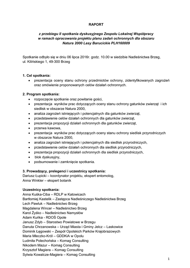 RAPORT z przebiegu II spotkania dyskusyjnego Zespołu Lokalnej Współpracy w ramach opracowania projektu planu zadań ochronnych dla obszaru Natura 2000 Lasy Barucickie PLH160009 Spotkanie odbyło się w dniu 06 lipca 2016r. godz. 10.00 w siedzibie Nadleśnictwa Brzeg, ul. Kilińskiego 1, 49-300 Brzeg 1. Cel spotkania: prezentacja oceny stanu ochrony przedmiotów ochrony, zidentyfikowanych zagrożeń oraz omówienie proponowanych celów działań ochronnych. 2. Program spotkania: rozpoczęcie spotkanie oraz powitanie gości, prezentacja wyników prac dotyczących oceny stanu ochrony gatunków zwierząt i ich siedlisk w obszarze Natura 2000, analiza zagrożeń istniejących i potencjalnych dla gatunków zwierząt, przedstawienie celów działań ochronnych dla gatunków zwierząt, prezentacja propozycji działań ochronnych dla gatunków zwierząt, przerwa kawowa, prezentacja wyników prac dotyczących oceny stanu ochrony siedlisk przyrodniczych w obszarze Natura 2000, analiza zagrożeń istniejących i potencjalnych dla siedlisk przyrodniczych, przedstawienie celów działań ochronnych dla siedlisk przyrodniczych, prezentacja propozycji działań ochronnych dla siedlisk przyrodniczych, blok dyskusyjny, podsumowanie i zamknięcie spotkania. 3. Prowadzący, prelegenci i uczestnicy spotkania: Dariusz Łupicki – koordynator projektu, ekspert entomolog, Anna Winkler – ekspert botanik Uczestnicy spotkania: Anna Kuśka-Ciba – RDLP w Katowicach Bartłomiej Kastelik – Zastępca Nadleśniczego Nadleśnictwa Brzeg Lech Pawluk – Nadleśnictwo Brzeg Magdalena Wincer – Nadleśnictwo Brzeg Karol Żyśko – Nadleśnictwo Namysłów Adam Kuńka - RDOŚ Opole Janusz Zdyb – Starostwo Powiatowe w Brzegu Danuta Chrzanowska – Urząd Miasta i Gminy Jelcz – Laskowice Dominik Łęgowski – Zespół Opolskich Parków Krajobrazowych Maria Mleczko-Król – GDDKiA w Opolu Ludmiła Polechońska – Komag Consulting Nikodem Mazur – Komag Consulting Krzysztof Magiera – Komag Consulting Sylwia Kowalcze-Magiera – Komag Consulting 1 4. Przebieg spotkania: Spotkanie rozpoczął Pan dr Dariusz Łupicki (Komag Consulting), który przywitał uczestników spotkania i przedstawił zgromadzonym cel spotkania oraz otworzył blok prezentacji przedstawiając wyniki prac nad owadami będącymi przedmiotami ochrony obszaru Natura 200 Lasy Barucickie wraz oceną ich stanu ochrony i zidentyfikowanymi zagrożeniami i działaniami ochronnymi. Następnie Pani mgr Anna Winkler przedstawiła siedliska przyrodnicze będące przedmiotami ochrony w obszarach wraz oceną ich stanu ochrony i zidentyfikowanymi zagrożeniami, celami i propozycją działań ochronnych. Przerwa kawowa Blok dyskusyjny W trakcie prezentacji dotyczącej jelonka rogacza, będącego przedmiotem ochrony w obszarze, Pan Janusz Zdyb (Starostwo Powiatowe w Brzegu), poinformował zgromadzonych, że jelonki rogacze były w ostatnich dniach widziane w Lubszy, Śmiechowicach oraz w Lubszy przy stawach (ok. 1,5-2 km poza obszarem Natura 2000 Lasy Barucickie). Pan Lech Pawluk (Nadleśnictwo Brzeg) zauważył, iż w rezerwacie Lubsza wcześniej w składzie drzewostanu występował świerk, jednak „wypadł” on z drzewostanu i zastąpił go grab, którego duże korony zacieniają miejsca, które mogłyby być odpowiednie w okresie rujki jelonka rogacza. Pan Dariusz Łupicki zauważył, że rezerwat Lubsza jest bardzo blisko miejsc, gdzie zauważono w obszarze w ostatnim czasie jelonka. Pan Łupicki zaproponował, że wykonawcy przeanalizują możliwość podjęcia ochrony czynnej jelonka rogacza, polegającej na umieszczaniu częściowo zakopanych kłód w miejscach odpowiednio nasłonecznionych dla rozwoju larw tego gatunku. Pan Adam Kuńka (RDOŚ Opole) zauważył, że przypadku siedlisk mogących wchodzić w skład gospodarstw rolnych (np. łąk świeżych 6510), konieczny jest podział działań ochronnych na obligatoryjne (utrzymanie dotychczasowego, ekstensywnego użytkowania) i fakultatywne (koszenie łąk na szczególnych zasadach). Pan Lech Pawluk zauważył, że udział powierzchni łęgów w obszarze względem SDF jest przesadzony. Pan Dariusz Łupicki zaznaczył, że wykonawcy bazują na inwentaryzacji wykonanej przez poprzednią firmę w 2015 roku. Pani Sylwia Kowalcze-Magiera (Komag Consulting) zaproponowała, że wykonawcy przekażą do nadleśnictw granice płatów siedlisk zweryfikowane z planem urządzania lasu. Pan Adam Kuńka poprosił przedstawicieli nadleśnictw o pomoc wykonawcy w weryfikacji poprawności typów siedlisk przyrodniczych zaznaczonych w zeszłorocznej inwentaryzacji. Pan Karol Żyśko (Nadleśnictwo Namysłów) zauważył, że zapis działań ochronnych mówiący o zastosowaniu rębni częściowych powinien być zmieniony we wszystkich typach siedlisk na rębnie złożone typu IIId i IV. 5. Podsumowanie spotkania: Podczas dyskusji zebrano od uczestników spotkania cenne informacje na temat obszaru Natura 2000 Lasy Barucickie oraz objętych nim przedmiotów ochrony. Tym samym stwierdzić należy, że spotkanie przebiegło zgodnie z założeniami, a cele wynikające z realizacji tego etapu projektu zostały osiągnięte. Przebieg spotkania protokołowała Sylwia Kowalcze-Magiera 2