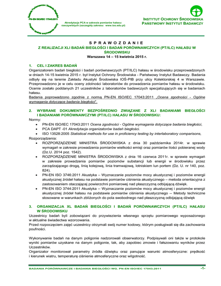 Akredytacja PCA w zakresie pomiarów hałasu: rzeczywistych (szczegóły zakresu: www.ios.edu.pl) INSTYTUT OCHRONY ŚRODOWISKA PAŃSTWOWY INSTYTUT BADAWCZY S P R A W O Z D A N I E Z REALIZACJI XLI BADAŃ BIEGŁOŚCI I BADAŃ PORÓWNAWCZYCH (PT/ILC) HAŁASU W ŚRODOWISKU Warszawa 14 – 15 kwietnia 2015 r. 1. CEL I ZAKRES BADAŃ Organizatorem badań biegłości i badań porównawczych (PT/ILC) hałasu w środowisku przeprowadzonych w dniach 14-15 kwietnia 2015 r. był Instytut Ochrony Środowiska - Państwowy Instytut Badawczy. Badania odbyły się na terenie Zakładu Akustyki Środowiska IOŚ-PIB przy ulicy Kolektorskiej 4 w Warszawie. Przeprowadzono je w celu oceny zdolności laboratoriów do prowadzenia pomiarów hałasu w środowisku. Ocenie zostało poddanych 21 uczestników z laboratoriów badawczych specjalizujących się w badaniach hałasu. Badania poprowadzono zgodnie z normą PN-EN ISO/IEC 17043:2011 „Ocena zgodności - Ogólne wymagania dotyczące badania biegłości”. WYBRANE DOKUMENTY BEZPOŚREDNIO ZWIĄZANE Z XLI BADANIAMI BIEGŁOŚCI I BADANIAMI PORÓWNAWCZYMI (PT/ILC) HAŁASU W ŚRODOWISKU: Normy: PN-EN ISO/IEC 17043:2011 Ocena zgodności - Ogólne wymagania dotyczące badania biegłości, PCA DAPT -01 Akredytacja organizatorów badań biegłości. ISO 13528:2005 Statistical methods for use in proficiency testing by interlaboratory comparisons, Rozporządzenia: ROZPORZĄDZENIE MINISTRA ŚRODOWISKA z dnia 30 października 2014r. w sprawie wymagań w zakresie prowadzenia pomiarów wielkości emisji oraz pomiarów ilości pobieranej wody (Dz.U. 2014 poz. 1542). ROZPORZĄDZENIE MINISTRA ŚRODOWISKA z dnia 16 czerwca 2011r. w sprawie wymagań w zakresie prowadzenia pomiarów poziomów substancji lub energii w środowisku przez zarządzającego drogą, linią kolejową, linia tramwajową, lotniskiem lun portem (Dz. U. nr 140, poz. 824). PN-EN ISO 3746:2011 Akustyka – Wyznaczanie poziomów mocy akustycznej i poziomów energii akustycznej źródeł hałasu na podstawie pomiarów ciśnienia akustycznego – metoda orientacyjna z zastosowaniem otaczającej powierzchni pomiarowej nad płaszczyzną odbijającą dźwięk. PN-EN ISO 3744:2011 Akustyka -- Wyznaczanie poziomów mocy akustycznej i poziomów energii akustycznej źródeł hałasu na podstawie pomiarów ciśnienia akustycznego -- Metody techniczne stosowane w warunkach zbliżonych do pola swobodnego nad płaszczyzną odbijającą dźwięk 2. ORGANIZACJA XL BADAŃ BIEGŁOŚCI I BADAŃ PORÓWNAWCZYCH (PT/ILC) HAŁASU W ŚRODOWISKU Uczestnicy badań byli zobowiązani do przywiezienia własnego sprzętu pomiarowego wyposażonego w aktualne świadectwa wzorcowania. Przed rozpoczęciem zajęć uczestnicy otrzymali swój numer kodowy, którym posługiwali się dla zachowania poufności. 3. Wykonywanie badań na danym poligonie nadzorowali obserwatorzy. Podpisywali oni także w protokole wyniki pomiarów uzyskane na danym poligonie, tak, aby zapobiec zmowie i fałszowaniu wyników przez Uczestników. Organizator monitorował parametry źródła dźwięku oraz panujące warunki atmosferyczne: prędkość i kierunek wiatru, temperaturę ciśnienie atmosferyczne oraz wilgotność. BADANIA PORÓWNAWCZE I BADANIA BIEGŁOŚCI WG. PN-EN ISO/IEC 17043;2011 -1- Akredytacja PCA w zakresie pomiarów hałasu: rzeczywistych (szczegóły zakresu: www.ios.edu.pl) INSTYTUT OCHRONY ŚRODOWISKA PAŃSTWOWY INSTYTUT BADAWCZY Każdy z uczestników badań otrzymał skoroszyt pt. Normy i Metody, w którym zawarte były przykładowe metody analiz. W celu wykonania badań biegłości i badań porównawczych hałasu zostały przygotowane eksperymentalne poligony pomiarowe ze znaną charakterystyką źródła: dla hałasu przemysłowego, dla pomiarów mocy akustycznej urządzenia. Zostały one scharakteryzowane poniżej. Informacje na temat obiektu badań należało umieścić w odpowiednich miejscach w protokole i sprawozdaniu. POLIGON 1 – Program ZAŚ1: Pomiary na poligonie hałasu instalacyjnego Na poligonie 1 pomiary wykonywało 14 uczestników. Organizator badań przygotowywał poligon pomiarowy hałasu przemysłowego z: określonym 1 źródłem dźwięku, włączonym w zadanym czasie, wyznaczonymi 3 lokalizacjami punktów pomiarowych położonymi w zróżnicowanych warunkach topograficznych, określonymi warunkami tła pomiarowego, takiego, by przynajmniej w jednym punkcie była możliwość jednoznacznego określenia poziomu sygnału akustycznego z danego źródła. Organizator przygotował w warunkach poligonu badawczego zarejestrowane wcześniej sztuczne źródło dźwięku symulujące pracę instalacji na przenośnym urządzeniu. Sygnał podstawowy – szum różowy – generator sygnałowy RFT. Poziom sygnału 107,5 dB +/- 0,3 dB w odległości 1 m od źródła w pomiarowym czasie rzeczywistym 09.30 – 14.00. Poligon symulował uciążliwy zakład przemysłowy, w którym można z góry sterować mocą i czasem pracy źródeł. Uczestnicy badań zobowiązani byli wykonać pomiary, imisji hałasu w wyznaczonych punktach pomiarowych zgodnie z Rozp. Min. Środ. z dnia 30 października 2014 r. w sprawie wymagań w zakresie prowadzenia pomiarów wielkości emisji oraz pomiarów ilości pobieranej wody (Dz.U. 2014 poz. 1542). Metody i procedury badań uczestnik ustalał indywidualnie, zgodnie ze swym stanem wiedzy w tym zakresie oraz dysponowanymi umiejętnościami. Uczestnicy badań zobowiązani byli do oznaczenia równoważnego poziomu dźwięku LAeqD w wyznaczonych punktach pomiarowych wraz z oszacowaniem niepewności. Czas pracy urządzenia został podany przez organizatora badań i wynosił on 270 min. Uzyskane wyniki zostały porównane z wynikami laboratorium odniesienia. POLIGON 2 – Program ZAŚ3 : Pomiary poziomu mocy akustycznej urządzenia Na poligonie 2 pomiary wykonywało 9 uczestników Uczestnicy badań zobowiązani byli do oznaczenia w ściśle określonych warunkach emisyjnych, zgodnych z normą PN-EN ISO 3746:2011, poziomów ci