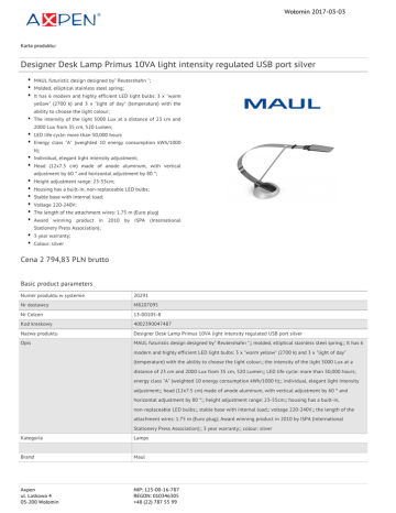 Wołomin 2017-03-03 Karta produktu: Designer Desk Lamp Primus 10VA light intensity regulated USB port silver MAUL futuristic design designed by" Reutershahn "; Molded, elliptical stainless steel spring; It has 6 modern and highly efficient LED light bulbs: 3 x "warm yellow" (2700 k) and 3 x "light of day" (temperature) with the ability to choose the light colour; The intensity of the light 5000 Lux at a distance of 23 cm and 2000 Lux from 35 cm, 520 Lumen; LED life cycle: more than 50,000 hours Energy class "A" (weighted 10 energy consumption kWh/1000 h); Individual, elegant light intensity adjustment; Head (12x7.5 cm) made of anode aluminum, with vertical adjustment by 60 ° and horizontal adjustment by 80 °; Height adjustment range: 23-55cm; Housing has a built-in, non-replaceable LED bulbs; Stable base with internal load; Voltage 220-240V; The length of the attachment wires: 1.75 m (Euro plug) Award winning product in 2010 by ISPA (International Stationery Press Association); 3 year warranty; Colour: silver Cena 2 794,83 PLN brutto Basic product parameters Numer produktu w systemie 20291 Nr dostawcy M8207095 Nr Celcen 13-00105-8 Kod kreskowy 4002390047487 Nazwa produktu Designer Desk Lamp Primus 10VA light intensity regulated USB port silver Opis MAUL futuristic design designed by" Reutershahn ";; molded, elliptical stainless steel spring;; It has 6 modern and highly efficient LED light bulbs: 3 x "warm yellow" (2700 k) and 3 x "light of day" (temperature) with the ability to choose the light colour;; the intensity of the light 5000 Lux at a distance of 23 cm and 2000 Lux from 35 cm, 520 Lumen;; LED life cycle: more than 50,000 hours; energy class "A" (weighted 10 energy consumption kWh/1000 h);; individual, elegant light intensity adjustment;; head (12x7.5 cm) made of anode aluminum, with vertical adjustment by 60 ° and horizontal adjustment by 80 °;; height adjustment range: 23-55cm;; housing has a built-in, non-replaceable LED bulbs;; stable base with internal load;; voltage 220-240V;; the length of the attachment wires: 1.75 m (Euro plug); Award winning product in 2010 by ISPA (International Stationery Press Association);; 3 year warranty;; colour: silver Kategoria Lamps Brand Maul Axpen ul. Laskowa 4 05-200 Wołomin NIP: 125-00-16-787 REGON: 010346305 +48 (22) 787 55 99 Wołomin 2017-03-03 Karta katalogowa produktu cd. Designer Desk Lamp Primus 10VA light intensity regulated USB port silver Feature Life Cycle (h) Intensity of Light LUMEN Intensity of Light LUX 5000 Energy Class A Offer from 2014-08 Kind 10W Type LED Product Standing lamp Material Metal/plastic Dimensions Height (mm) Procurement vocabulary CPV 31521100-5 Certifications Warranty 3 Hit Hit New product Standard Colour Colour Silver Pozostałe zdjęcia produktu Axpen ul. Laskowa 4 05-200 Wołomin NIP: 125-00-16-787 REGON: 010346305 +48 (22) 787 55 99 Wołomin 2017-03-03 Serdecznie zapraszamy do współpracy Axpen zespół. Axpen ul. Laskowa 4 05-200 Wołomin NIP: 125-00-16-787 REGON: 010346305 +48 (22) 787 55 99