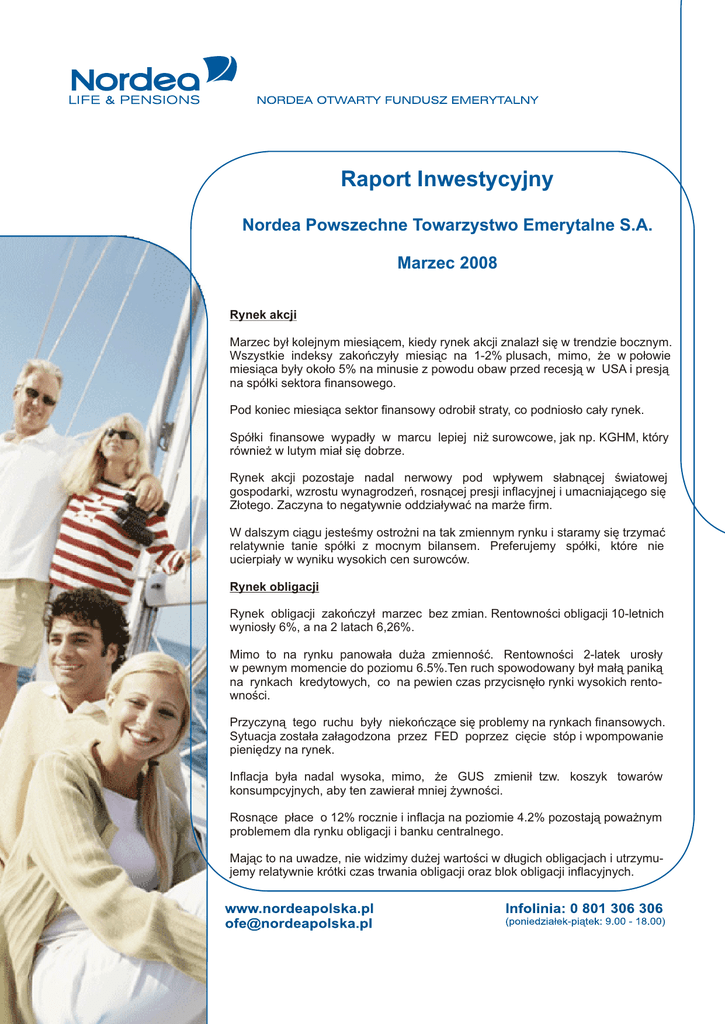 Raport Inwestycyjny Nordea Powszechne Towarzystwo Emerytalne S.A. Marzec 2008 Rynek akcji Marzec był kolejnym miesiącem, kiedy rynek akcji znalazł się w trendzie bocznym. Wszystkie indeksy zakończyły miesiąc na 1-2% plusach, mimo, że w połowie miesiąca były około 5% na minusie z powodu obaw przed recesją w USA i presją na spółki sektora finansowego. Pod koniec miesiąca sektor finansowy odrobił straty, co podniosło cały rynek. Spółki finansowe wypadły w marcu lepiej niż surowcowe, jak np. KGHM, który również w lutym miał się dobrze. Rynek akcji pozostaje nadal nerwowy pod wpływem słabnącej światowej gospodarki, wzrostu wynagrodzeń, rosnącej presji inflacyjnej i umacniającego się Złotego. Zaczyna to negatywnie oddziaływać na marże firm. W dalszym ciągu jesteśmy ostrożni na tak zmiennym rynku i staramy się trzymać relatywnie tanie spółki z mocnym bilansem. Preferujemy spółki, które nie ucierpiały w wyniku wysokich cen surowców. Rynek obligacji Rynek obligacji zakończył marzec bez zmian. Rentowności obligacji 10-letnich wyniosły 6%, a na 2 latach 6,26%. Mimo to na rynku panowała duża zmienność. Rentowności 2-latek urosły w pewnym momencie do poziomu 6.5%.Ten ruch spowodowany był małą paniką na rynkach kredytowych, co na pewien czas przycisnęło rynki wysokich rentowności. Przyczyną tego ruchu były niekończące się problemy na rynkach finansowych. Sytuacja została załagodzona przez FED poprzez cięcie stóp i wpompowanie pieniędzy na rynek. Inflacja była nadal wysoka, mimo, że GUS zmienił tzw. koszyk towarów konsumpcyjnych, aby ten zawierał mniej żywności. Rosnące płace o 12% rocznie i inflacja na poziomie 4.2% pozostają poważnym problemem dla rynku obligacji i banku centralnego. Mając to na uwadze, nie widzimy dużej wartości w długich obligacjach i utrzymujemy relatywnie krótki czas trwania obligacji oraz blok obligacji inflacyjnych. Raport Inwestycyjny - Marzec 2008 Inwestycje alternatywne W marcu nasza obligacja z ochroną kapitału i z opcją na hedge fund straciła ok 1%. Wyniki Po bardzo mocnym lutym Nordea OFE osiągnęła mniej spektakularny wzrost. Mimo to od poczatku roku pozostajemy na szóstej pozycji. WYNIKI Ostatni miesiąc Od początku roku 0.64 -3.54 0.61 -3.86 0.60 -4.10 0.59 -4.19 0.56 -4.31 0.44 -4.34 0.41 -4.40 0.38 -4.42 0.36 -4.49 0.31 -4.50 0.26 -4.60 0.18 -4.66 0.08 -4.71 0.00 -4.89 -0.78 -5.26 0.34 -4.55 Średnio 0.31 Średnio -4.42 Mediana 0.38 Mediana -4.42 Spread Nordea do Benchmarku -0.08 Spread Nordea do Benchmarku 0.21 Raport przygotował Departament Inwestycji, e-mail: [email protected]
